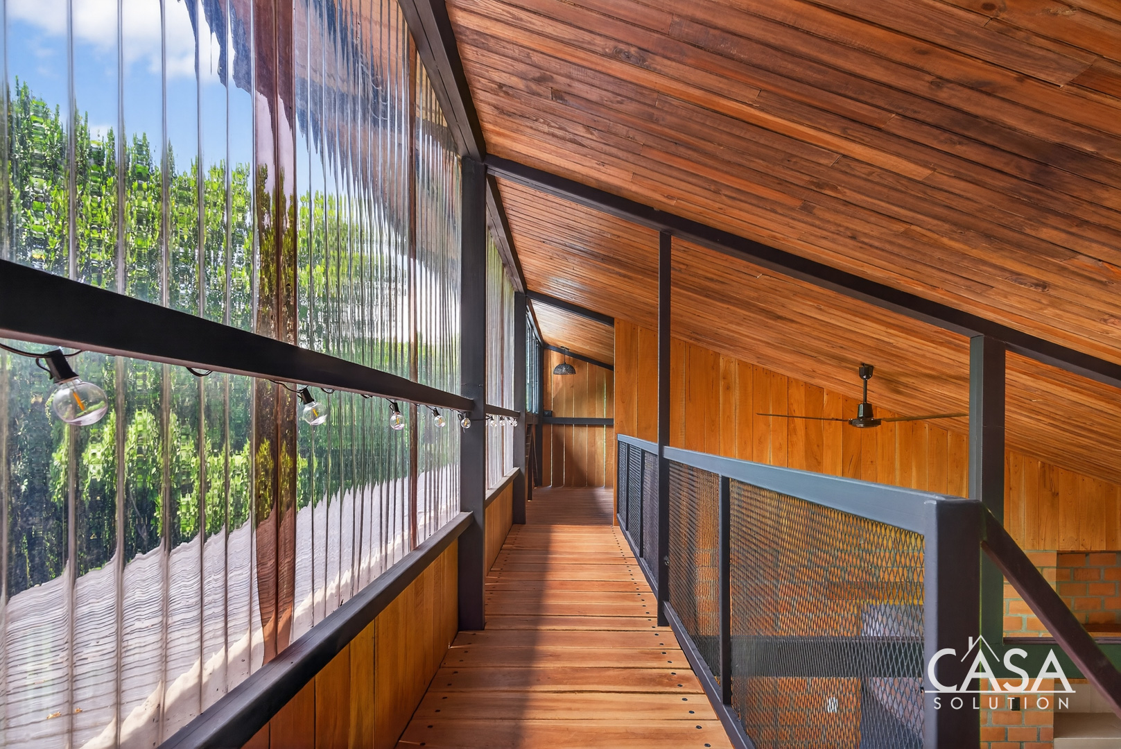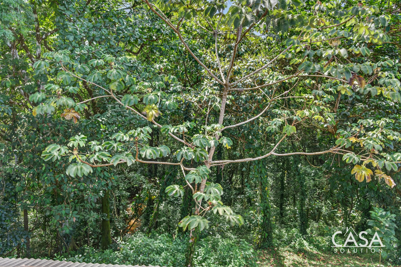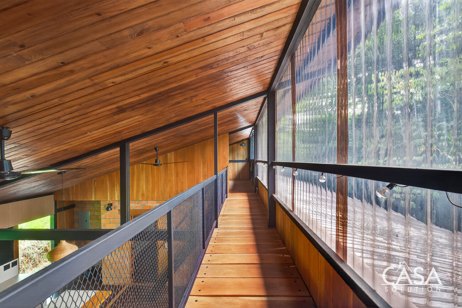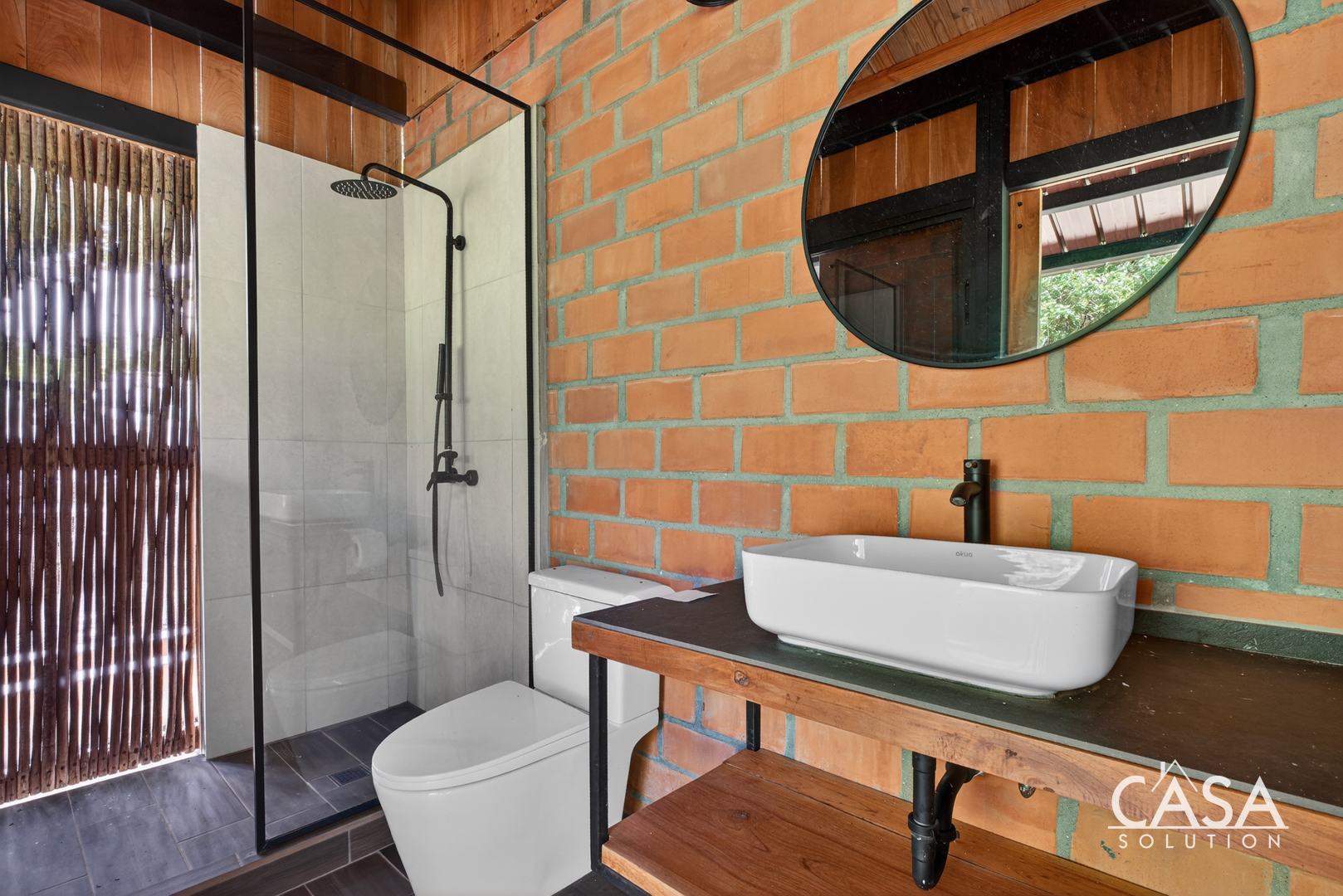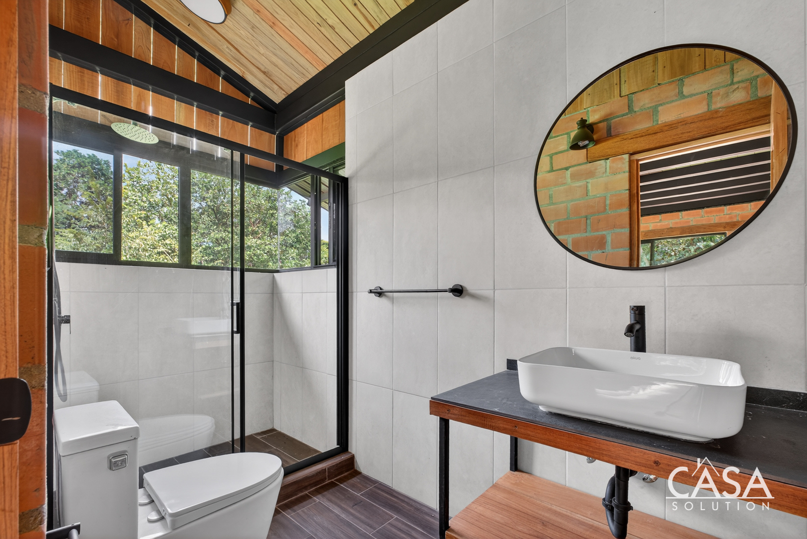 The house sits on gently sloping land surrounded by lush greenery, creating an immersive jungle feel while maintaining easy access to the road. The structure blends wood, steel, and natural clay bricks, offering a modern yet grounded aesthetic.