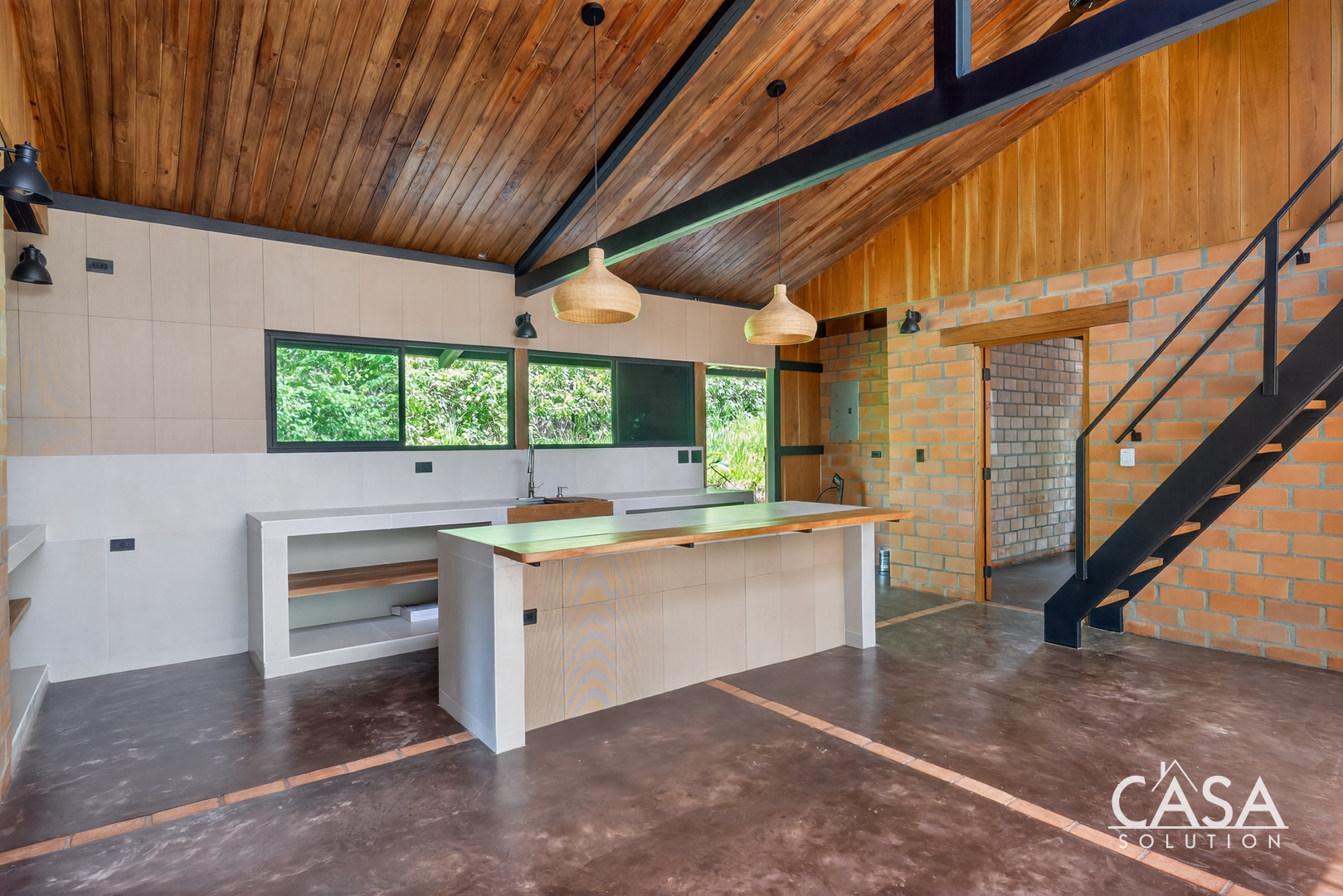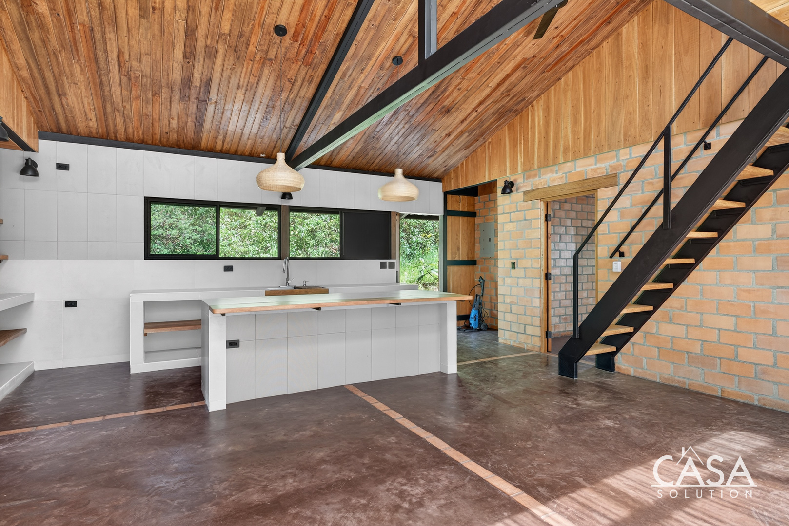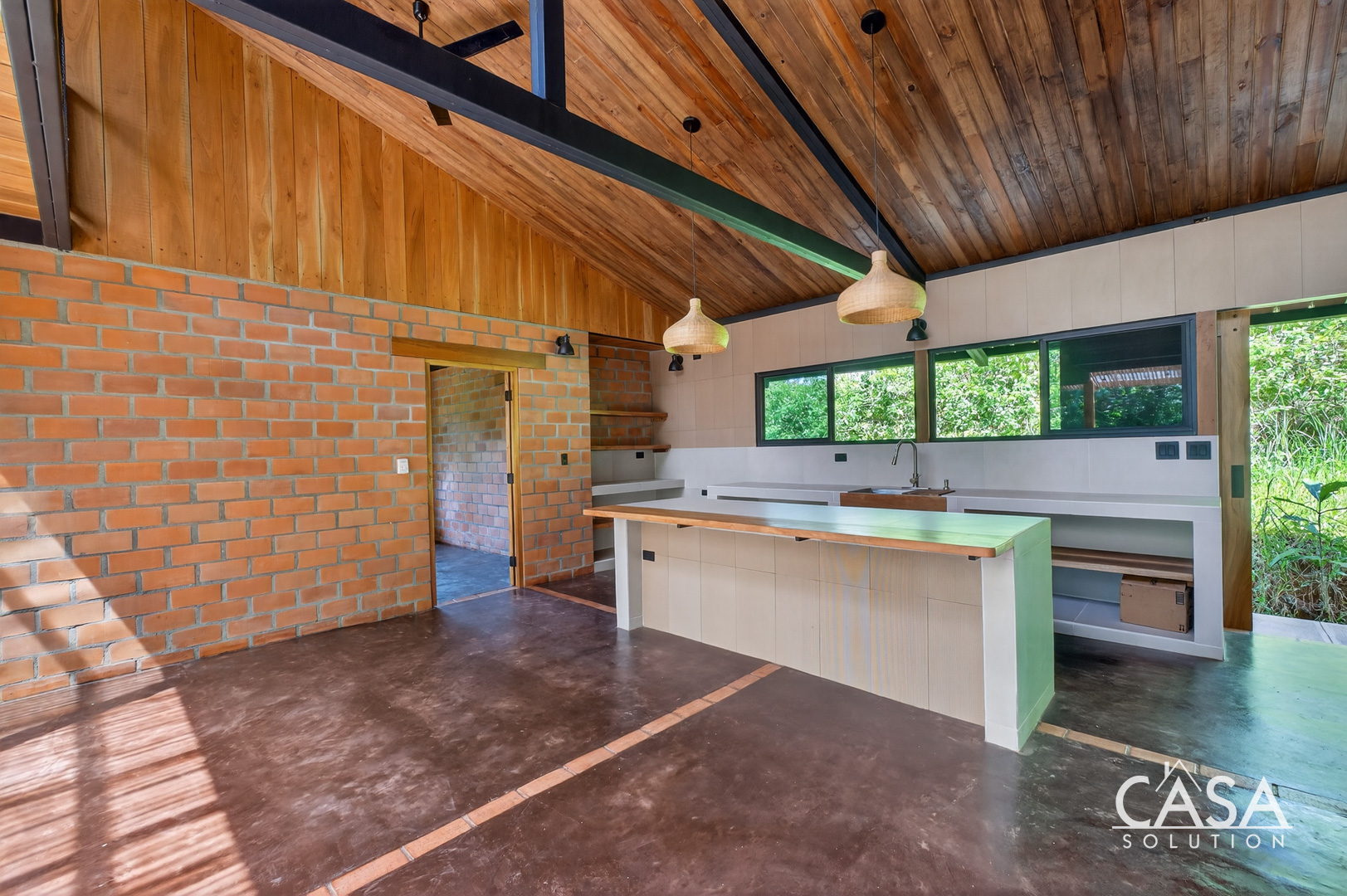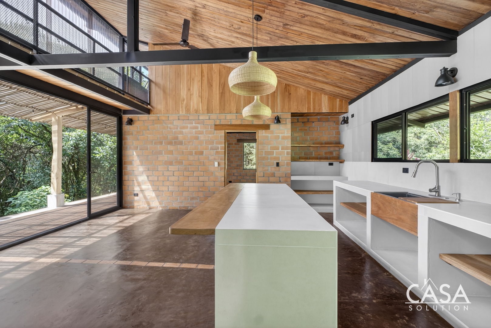 Inside, the open layout highlights high ceilings, large glass sliding doors, and warm wood tones throughout. Natural light fills the interior, giving every space an inviting and airy feel. The kitchen features concrete countertops and custom wood shelving, opening seamlessly to the living area and the wide covered terrace - a perfect extension of the home for outdoor living.