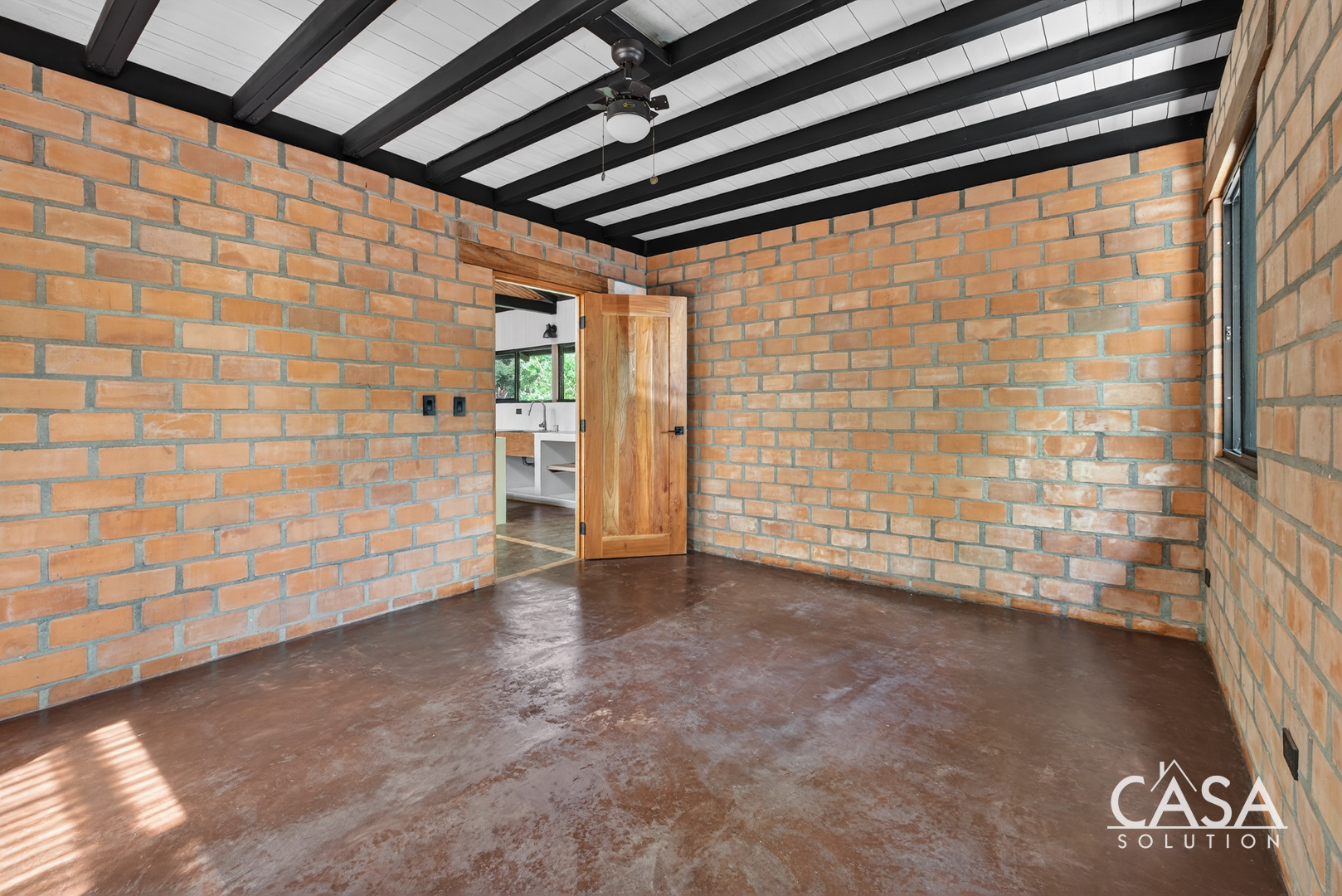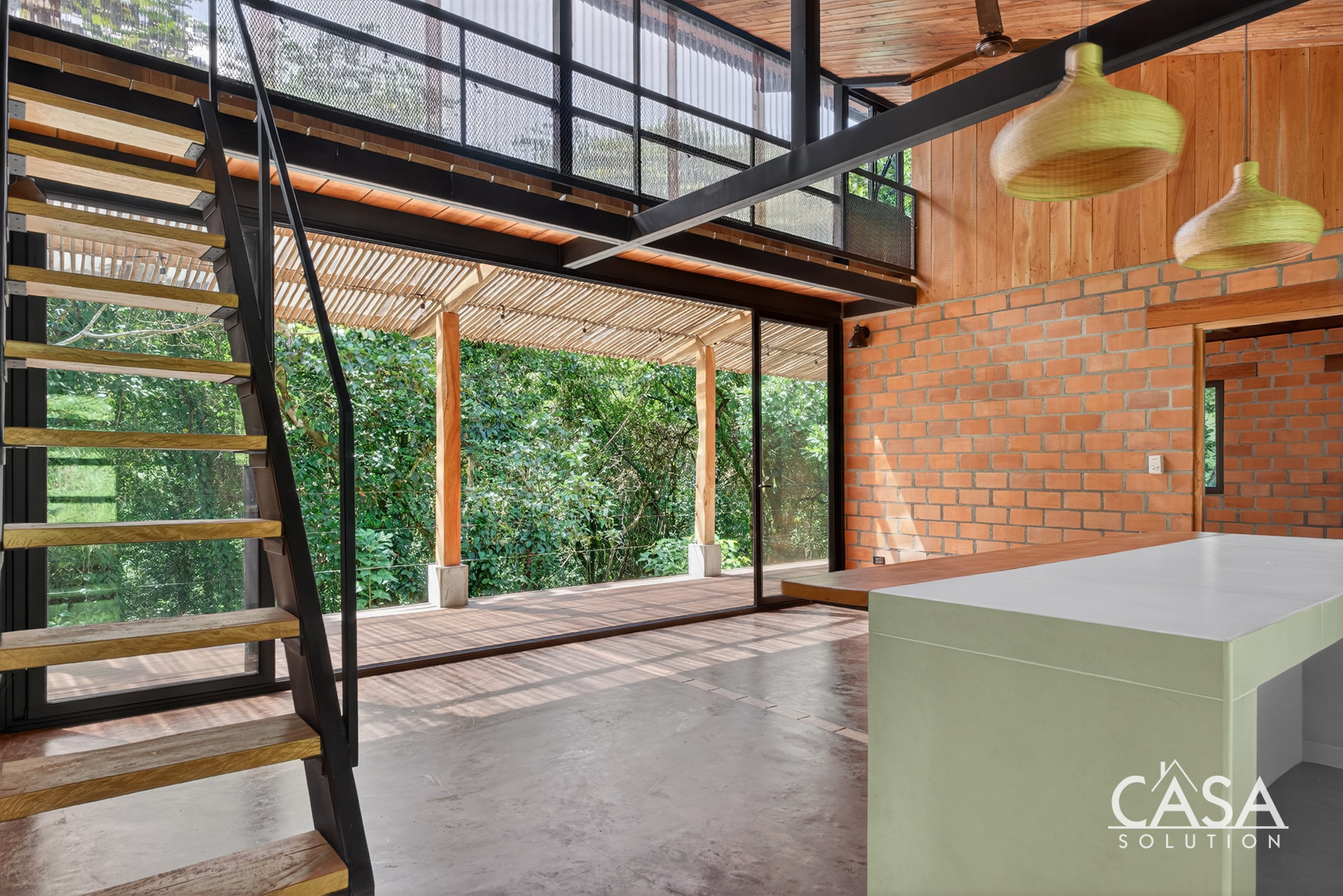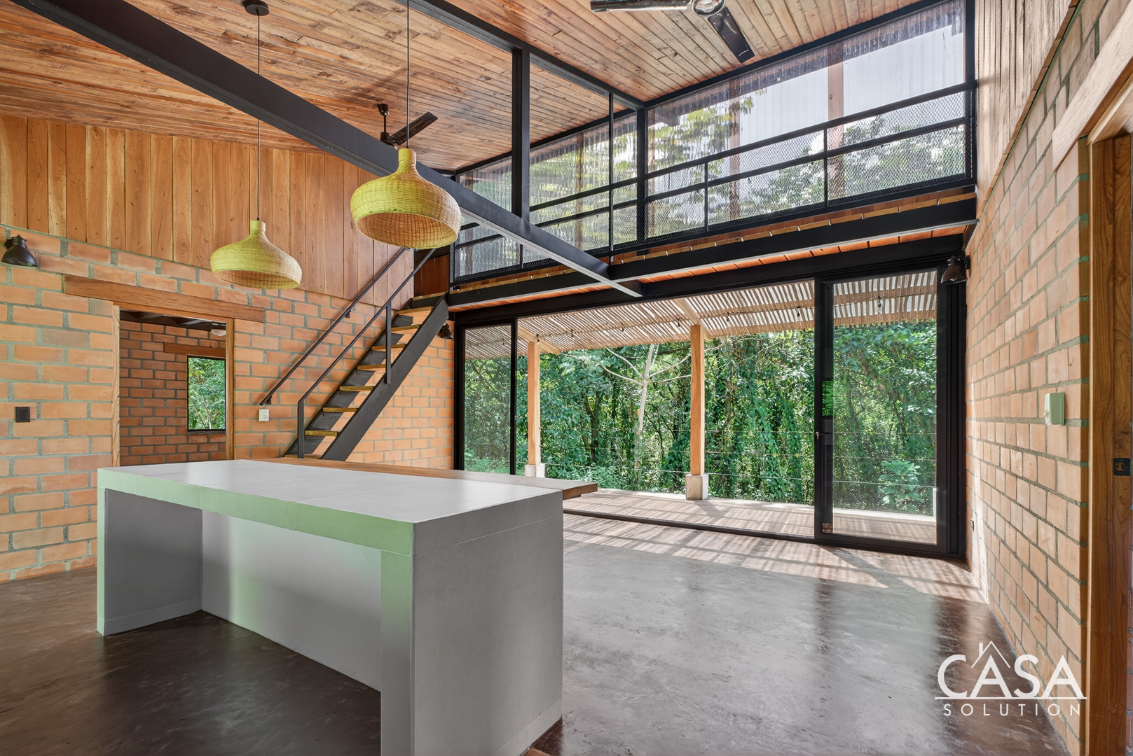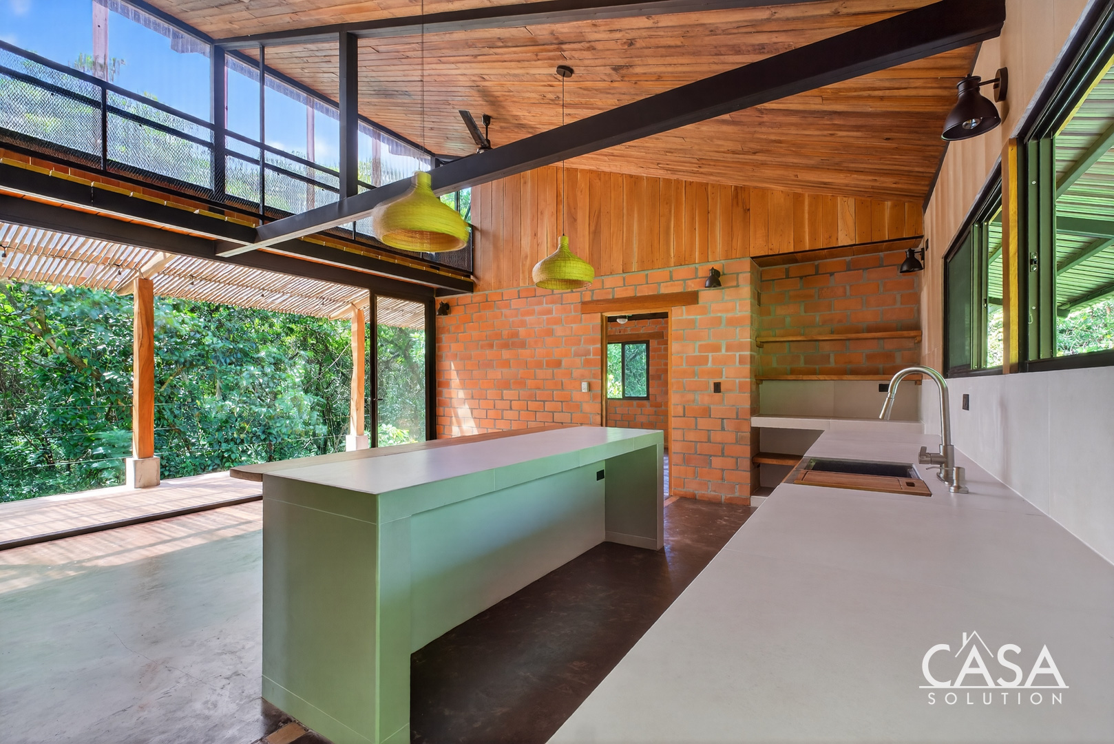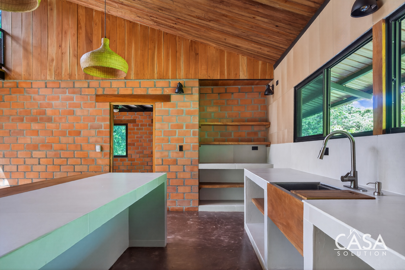 Inside, the open layout highlights high ceilings, large glass sliding doors, and warm wood tones throughout. Natural light fills the interior, giving every space an inviting and airy feel. The kitchen features concrete countertops and custom wood shelving, opening seamlessly to the living area and the wide covered terrace - a perfect extension of the home for outdoor living.