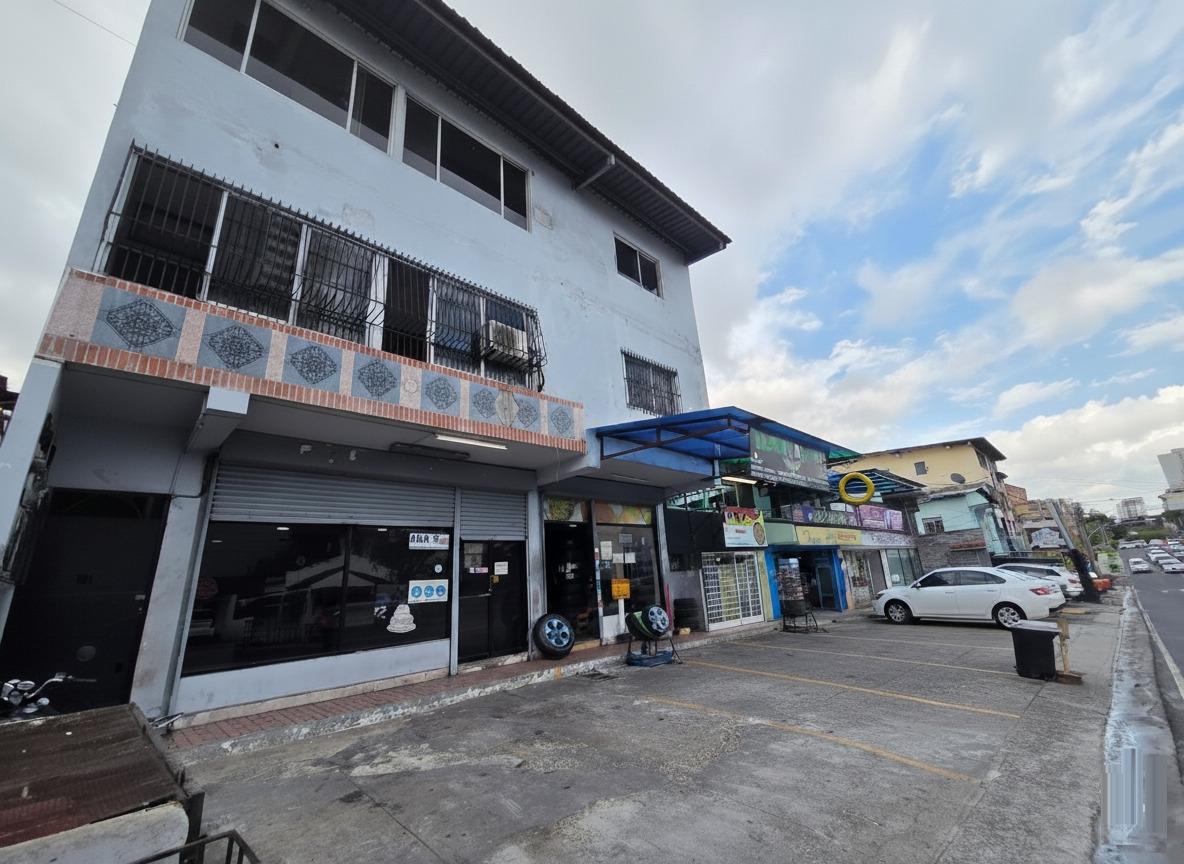 The building has two levels and two apartments, each with three bedrooms. It also includes two commercial spaces at the front of the building and four parking spaces.