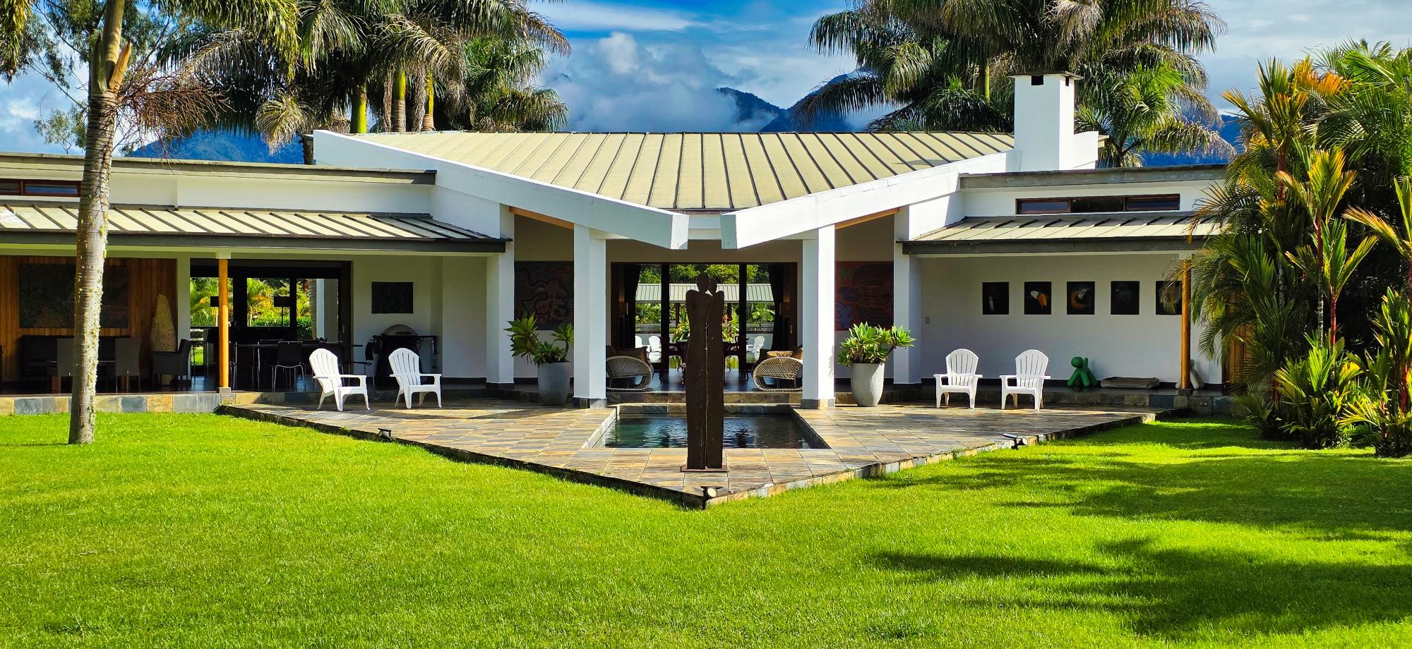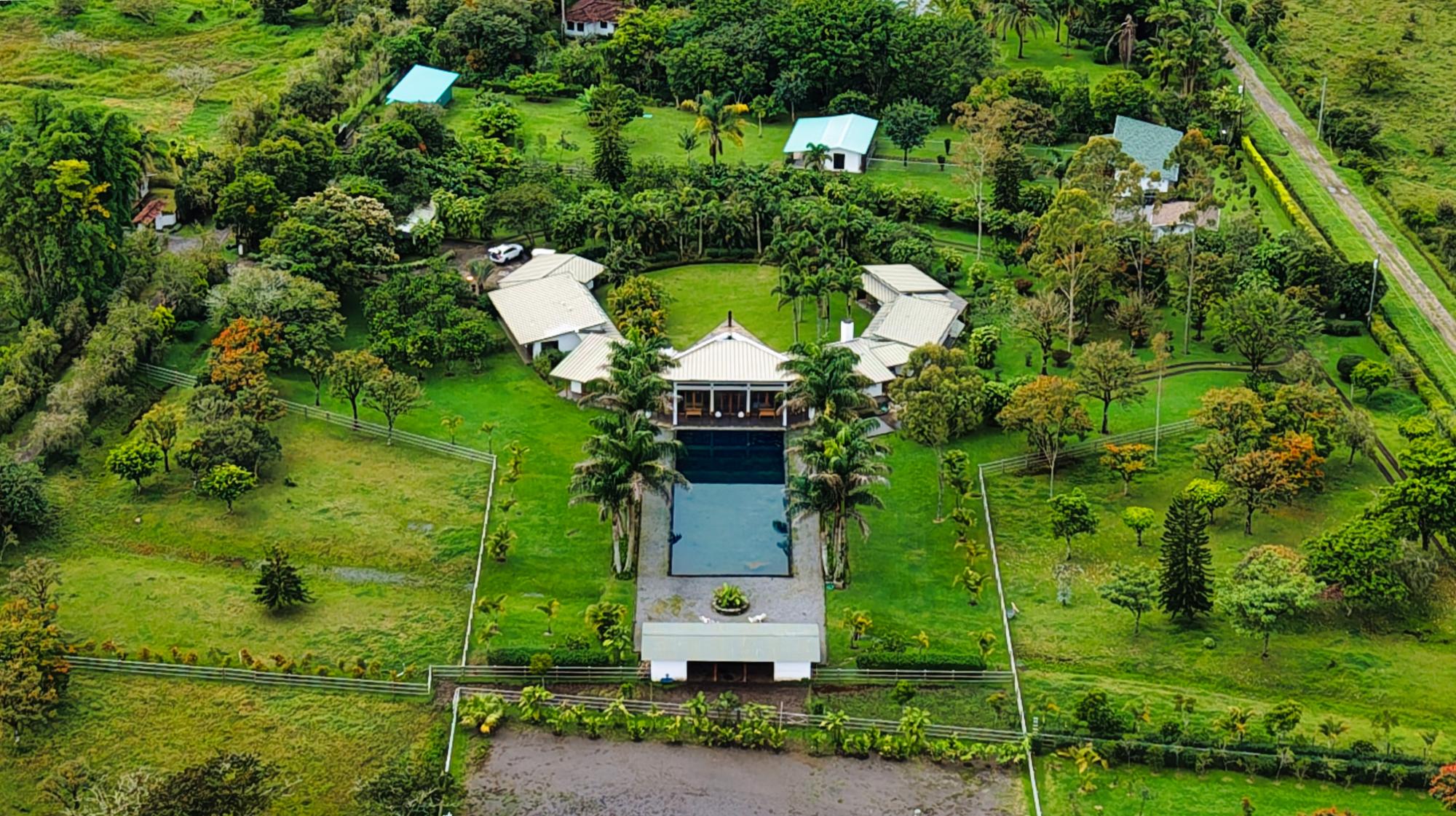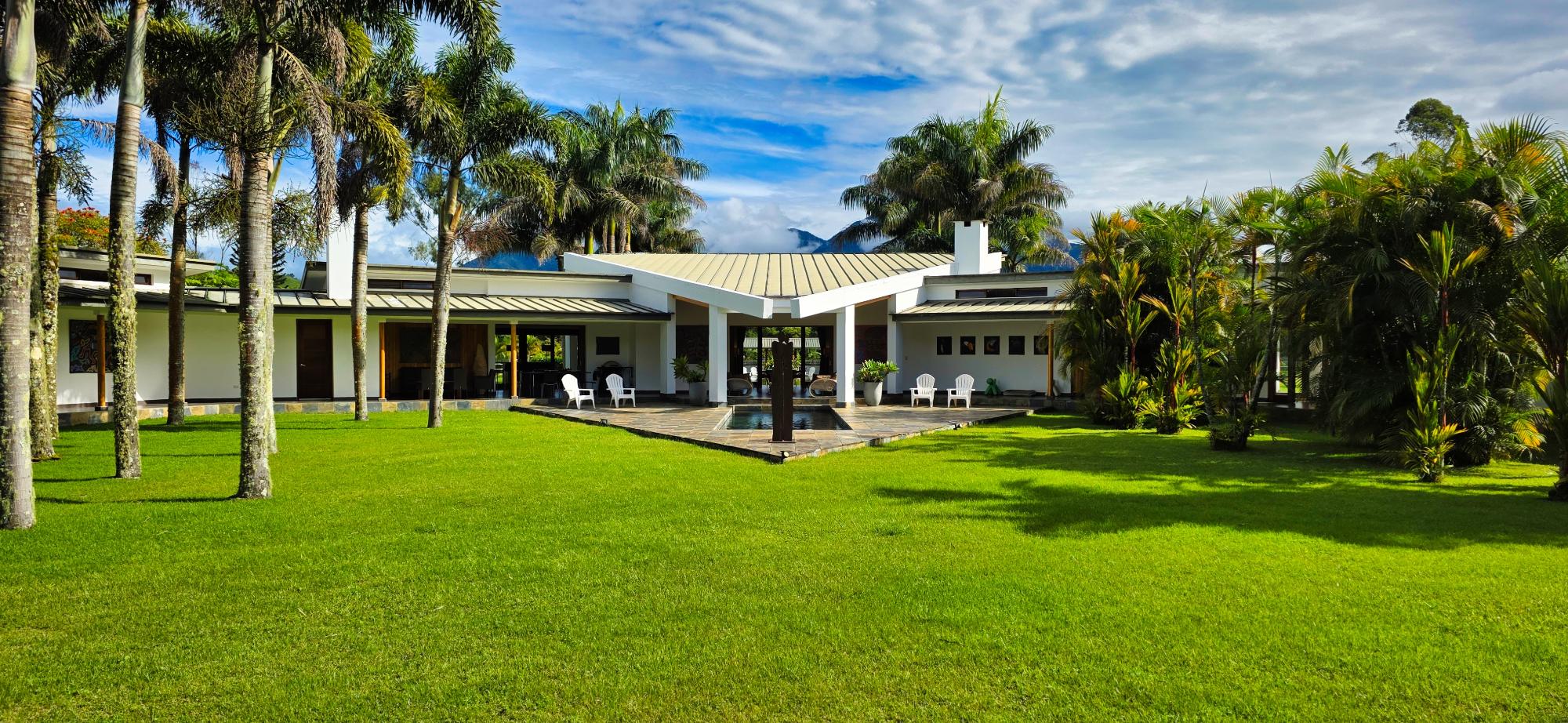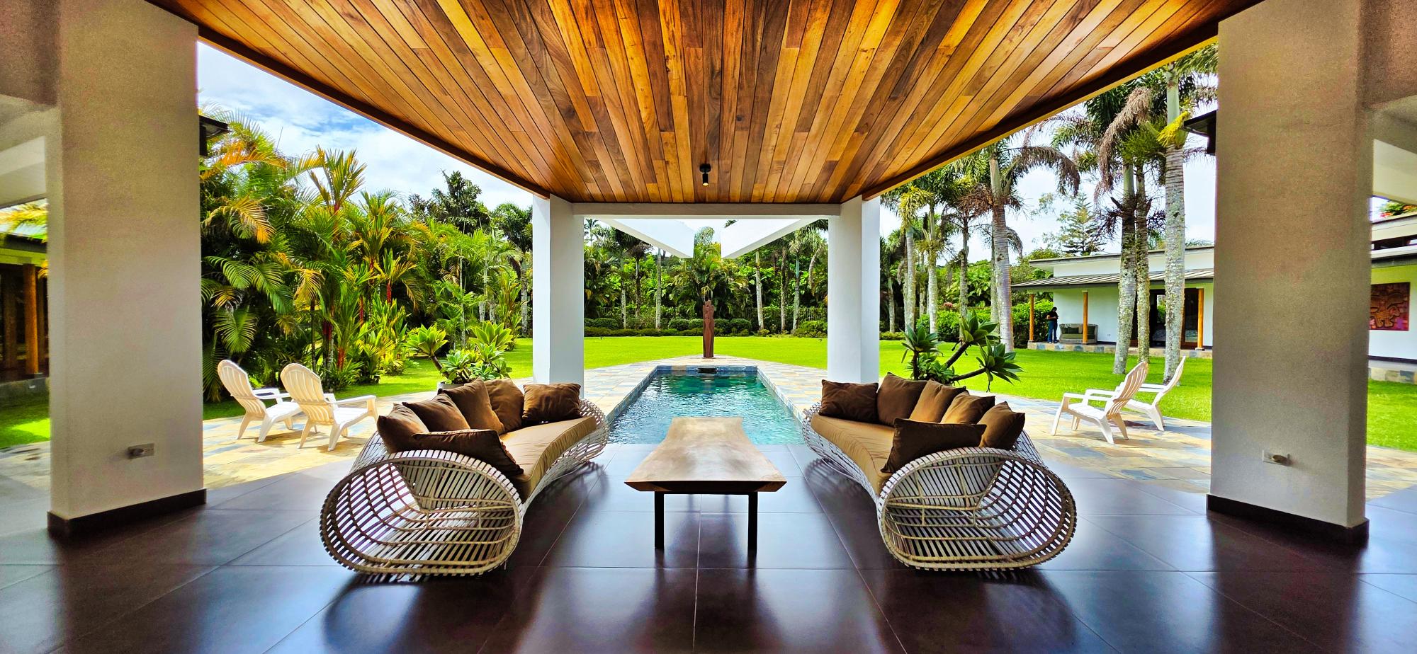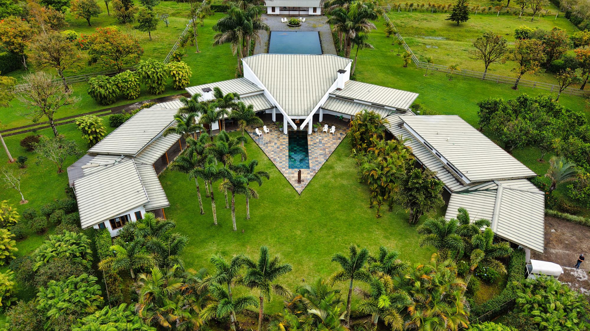 Luxury Home for Sale in Volcan, Tierras Altas, Chiriqui – An architectural jewel nestled in the prestigious Las Lagunas area, surrounded by nature, mountains, and the fresh air of Panama’s highlands. This majestic residence rises on a private 1.75-hectare (4.32-acre) estate, just 2.8 km (9 minutes by car) from Volcán’s main road, and only minutes away from the iconic lagoons and renowned coffee estates of the region. The main residence boasts over 900 m² (9,687 ft2) of construction, combining refined interiors with elegant open terraces designed to enjoy 360° panoramic mountain views and a private interior garden with swimming pool. House is offered as non-furnished. Key Features: Expansive living and dining room with floor-to-ceiling windows and a reflecting pond. Large, fully equipped kitchen with pantry. Three primary bedrooms, each with ensuite bathroom. Two independent apartments with living room, kitchen, and private bedroom with ensuite bath – ideal for guests or generating rental income. A spacious studio, currently used as an art atelier, that can easily be transformed into a private office or creative space according to the owner’s needs. Covered parking for two vehicles on one side of the property, plus a private parking area with direct access to the residence. Extensive landscaped gardens with mature fruit trees, ornamental flowers, and lush green areas, blending luxury living with the natural charm of the highlands. The property has its own water well and large reserve tanks, as well as connection to the IDAAN aqueduct, ensuring a reliable and constant water supply. Main house areas: Closed 459 m2 (4,940 ft2), open 422.84 m2