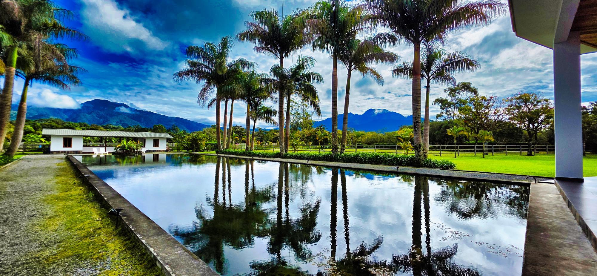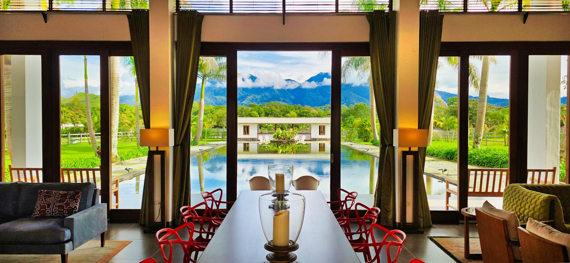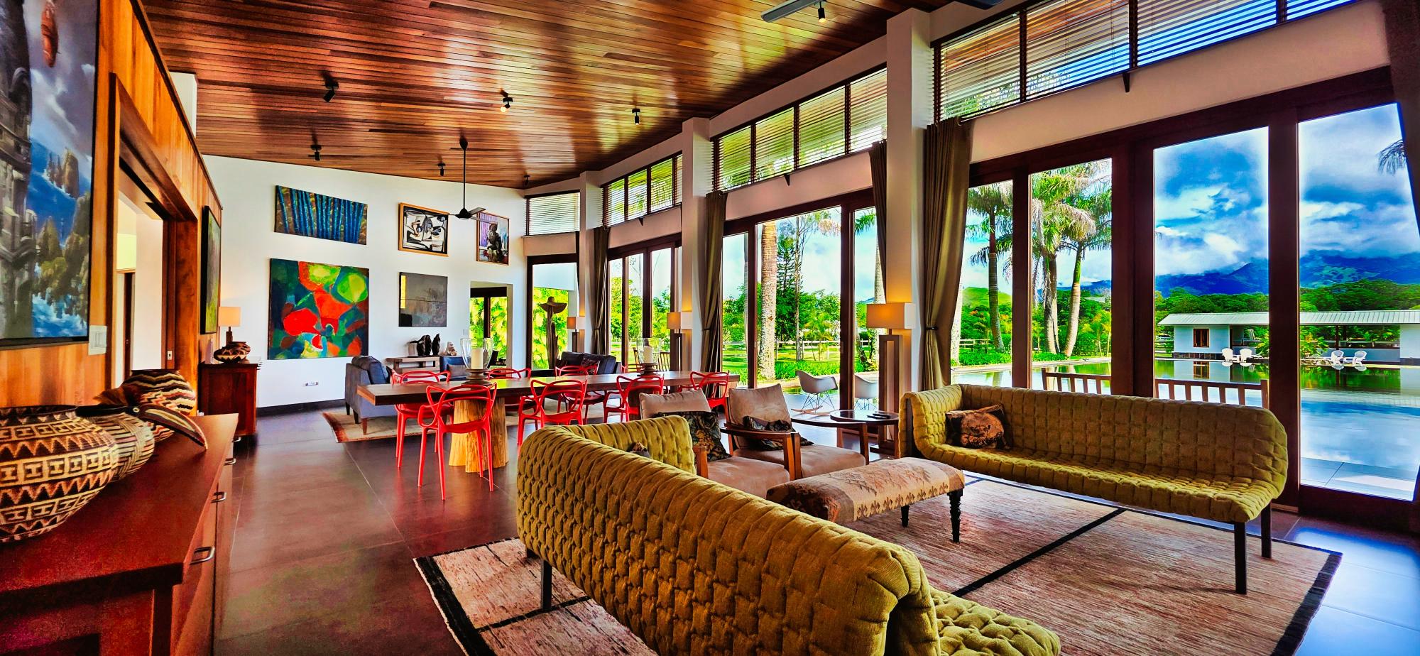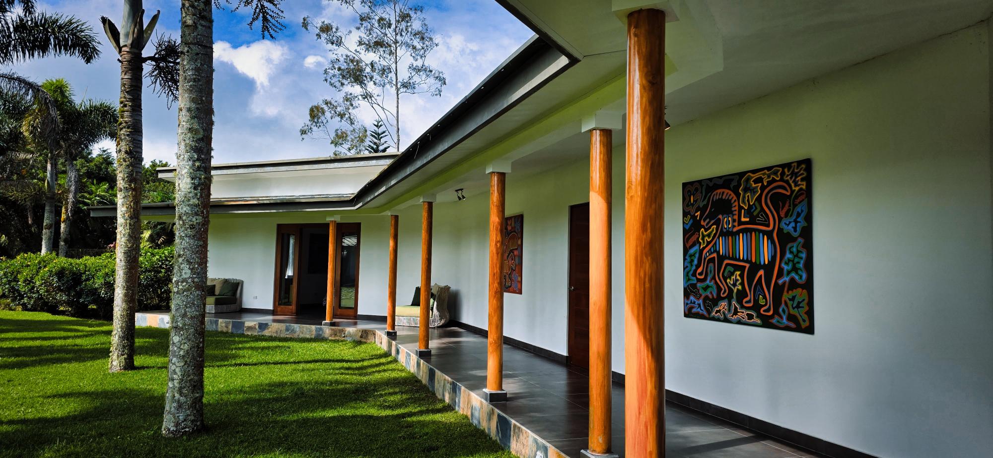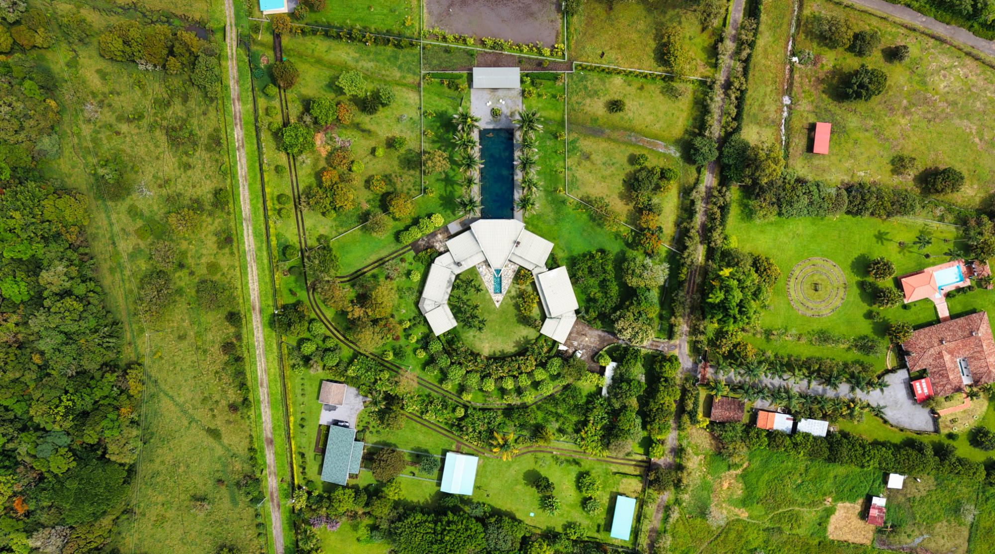 Luxury Home for Sale in Volcan, Tierras Altas, Chiriqui – An architectural jewel nestled in the prestigious Las Lagunas area, surrounded by nature, mountains, and the fresh air of Panama’s highlands. This majestic residence rises on a private 1.75-hectare (4.32-acre) estate, just 2.8 km (9 minutes by car) from Volcán’s main road, and only minutes away from the iconic lagoons and renowned coffee estates of the region. The main residence boasts over 900 m² (9,687 ft2) of construction, combining refined interiors with elegant open terraces designed to enjoy 360° panoramic mountain views and a private interior garden with swimming pool. House is offered as non-furnished. Key Features: Expansive living and dining room with floor-to-ceiling windows and a reflecting pond. Large, fully equipped kitchen with pantry. Three primary bedrooms, each with ensuite bathroom. Two independent apartments with living room, kitchen, and private bedroom with ensuite bath – ideal for guests or generating rental income. A spacious studio, currently used as an art atelier, that can easily be transformed into a private office or creative space according to the owner’s needs. Covered parking for two vehicles on one side of the property, plus a private parking area with direct access to the residence. Extensive landscaped gardens with mature fruit trees, ornamental flowers, and lush green areas, blending luxury living with the natural charm of the highlands. The property has its own water well and large reserve tanks, as well as connection to the IDAAN aqueduct, ensuring a reliable and constant water supply. Main house areas: Closed 459 m2 (4,940 ft2), open 422.84 m2