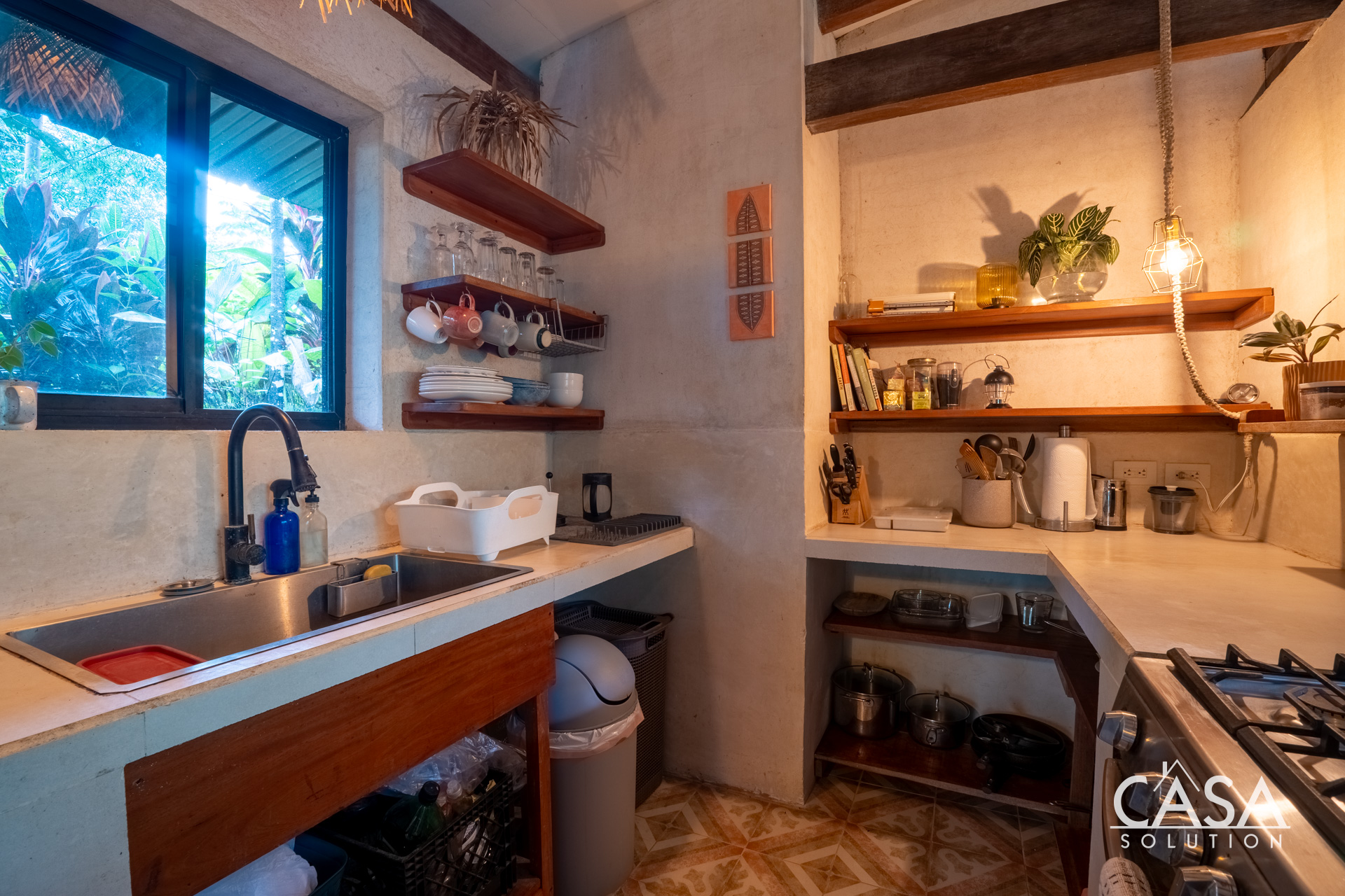 The interior follows a simple and efficient layout that emphasizes comfort and flow. The semi-open kitchen features a gas stove, open shelving, and direct access to the terrace, creating a seamless transition between cooking, dining, and relaxing.