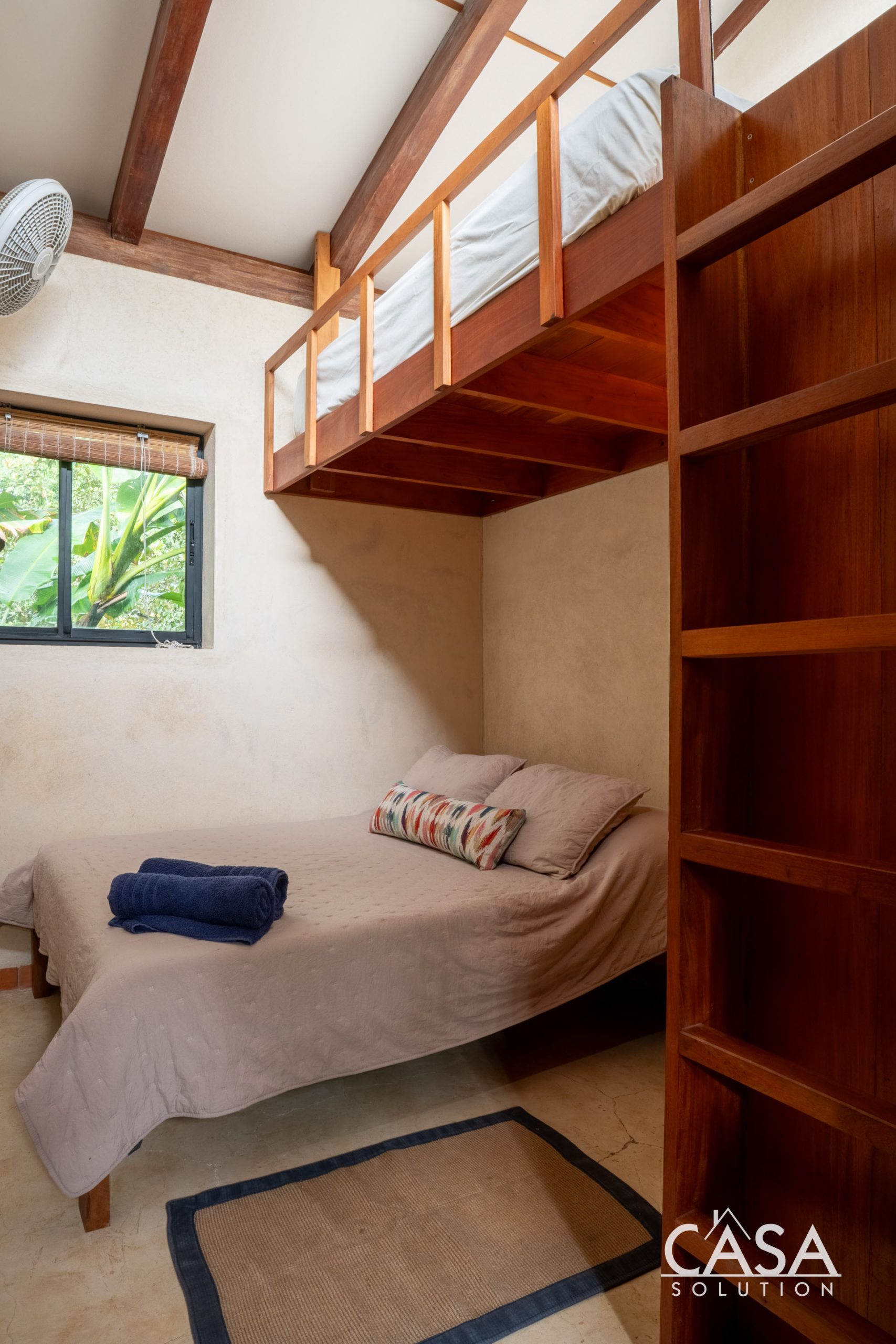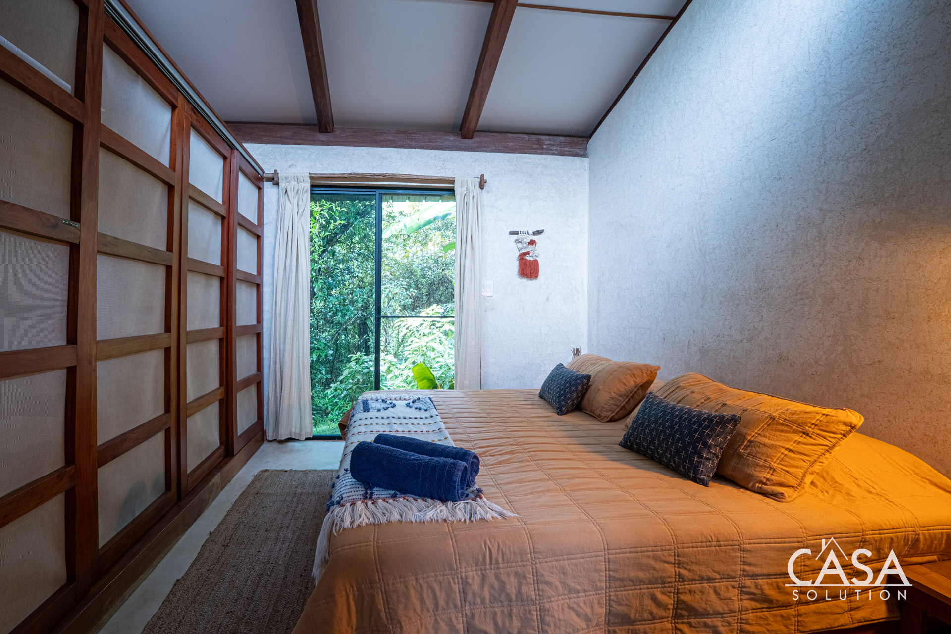 The main bedroom includes high ceilings, built-in storage, and large sliding doors that open to forest views. Two additional bedrooms offer flexible space for guests or family, one of them featuring a full bed below and a lofted twin above.