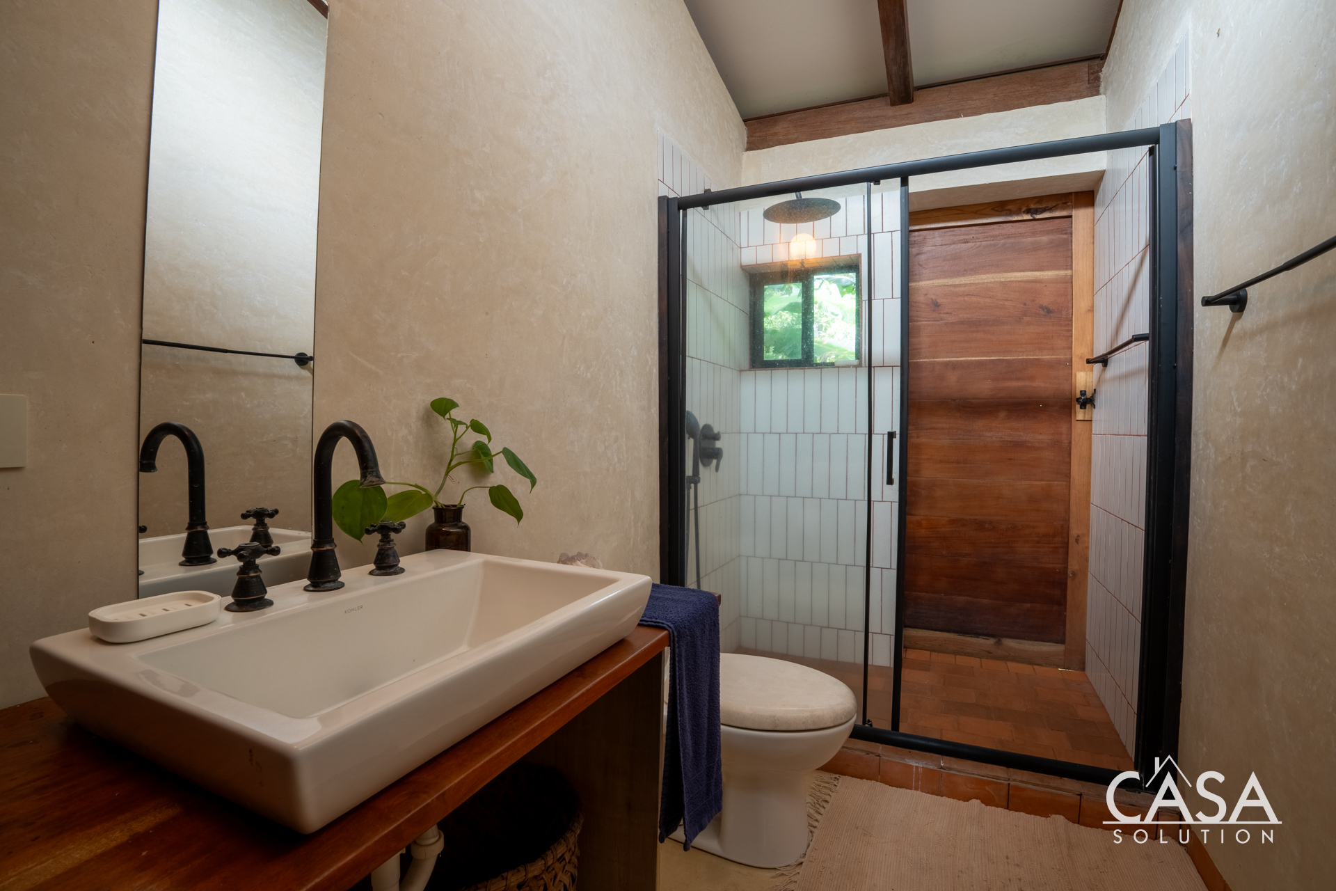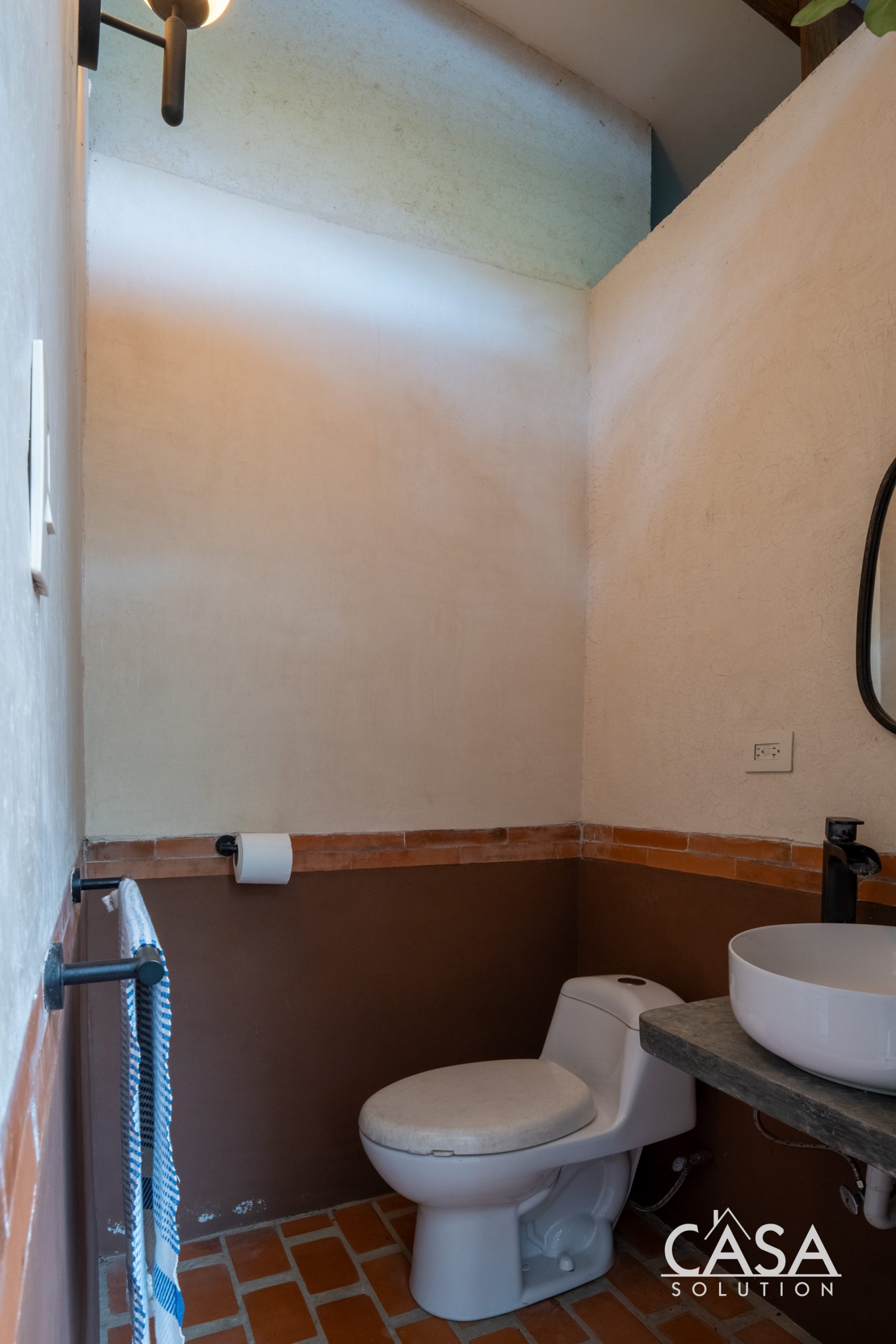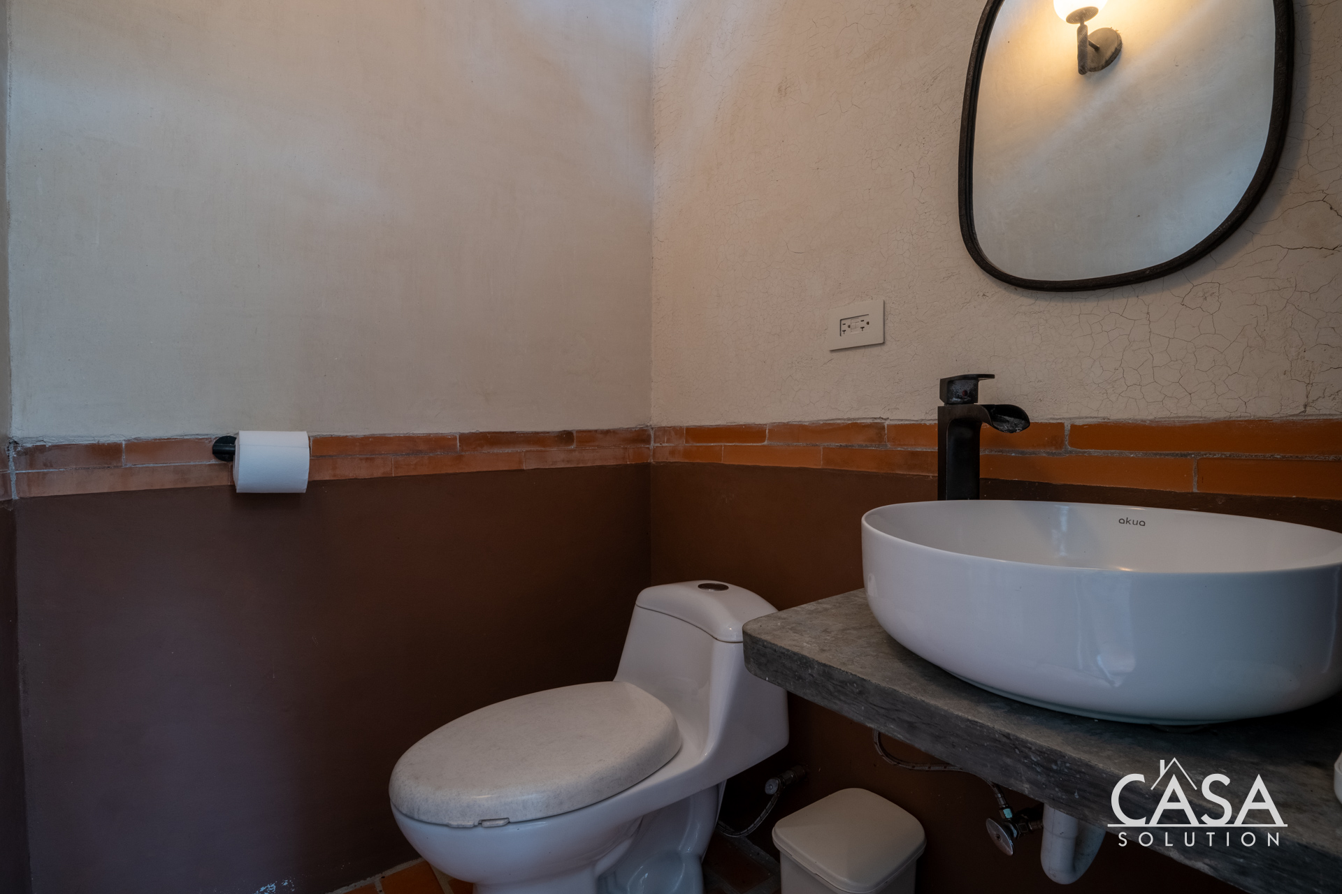 The main bathroom has an earth-toned rain shower with outdoor access, while a half bathroom on the terrace adds practicality for gatherings and daily use.
