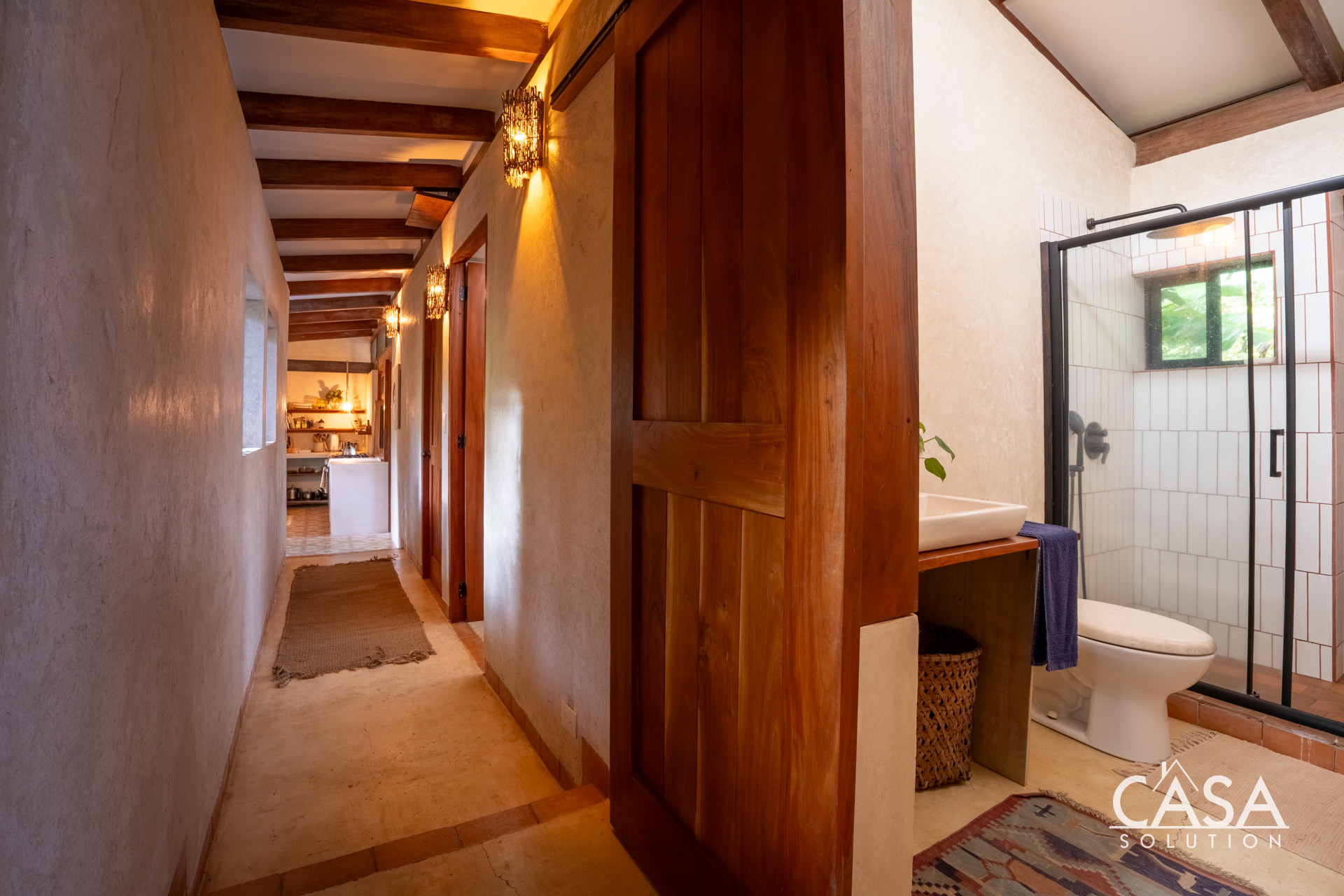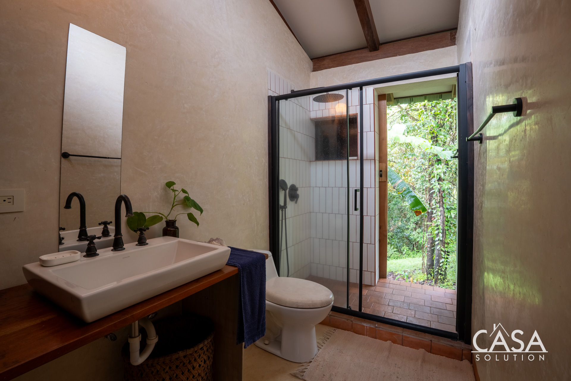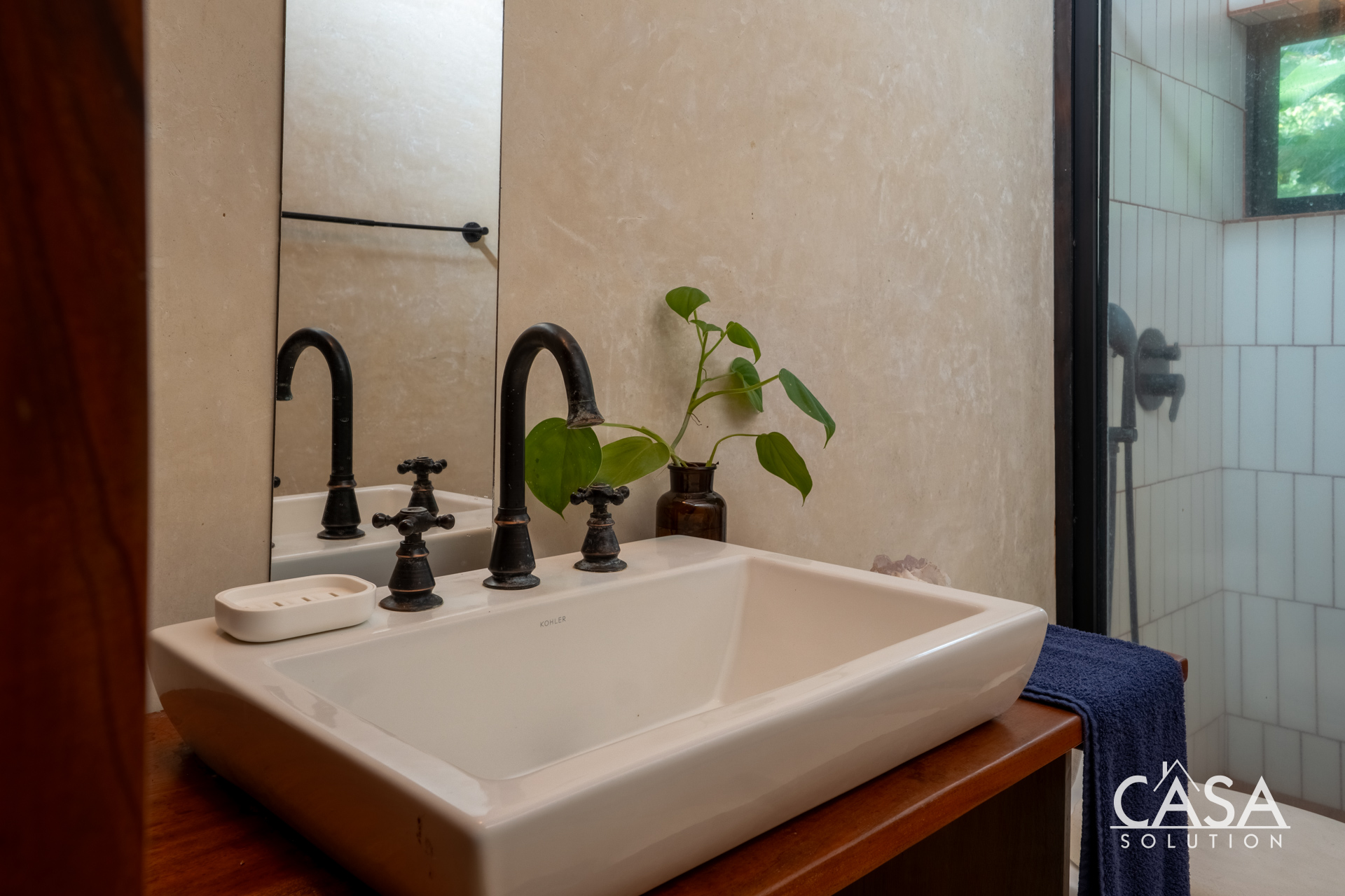 The main bathroom has an earth-toned rain shower with outdoor access, while a half bathroom on the terrace adds practicality for gatherings and daily use.