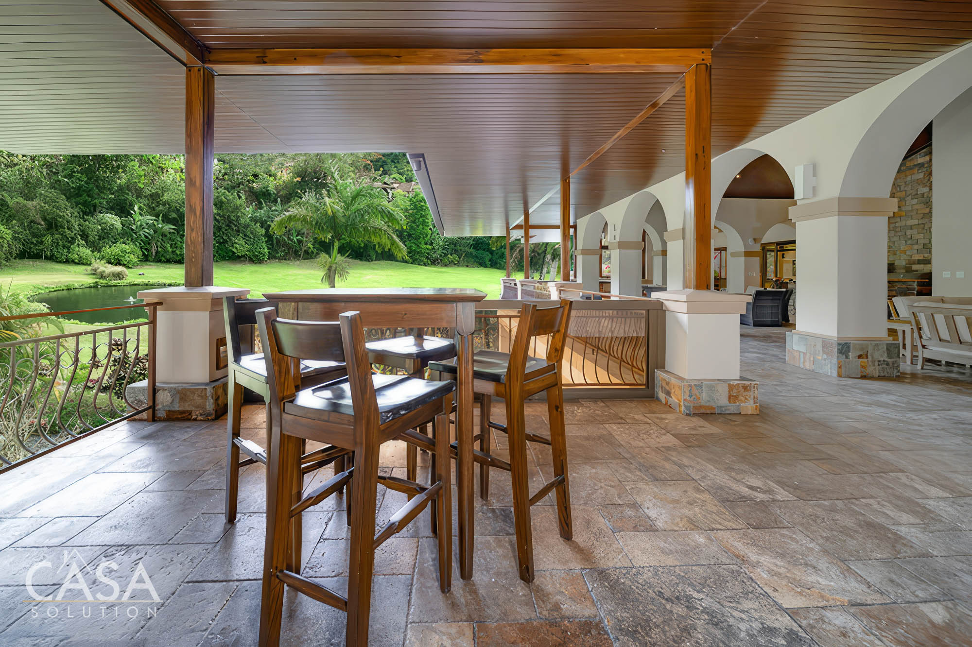 The incredible upper terrace features a full outdoor bar with TVs, a living area with fireplace, a large dining area, and a jacuzzi. This space takes full advantage of the beautiful Boquete weather and incredible gardens for enjoyment year-round. Thoughtfully placed outdoor lighting reveals a magical nighttime ambiance.