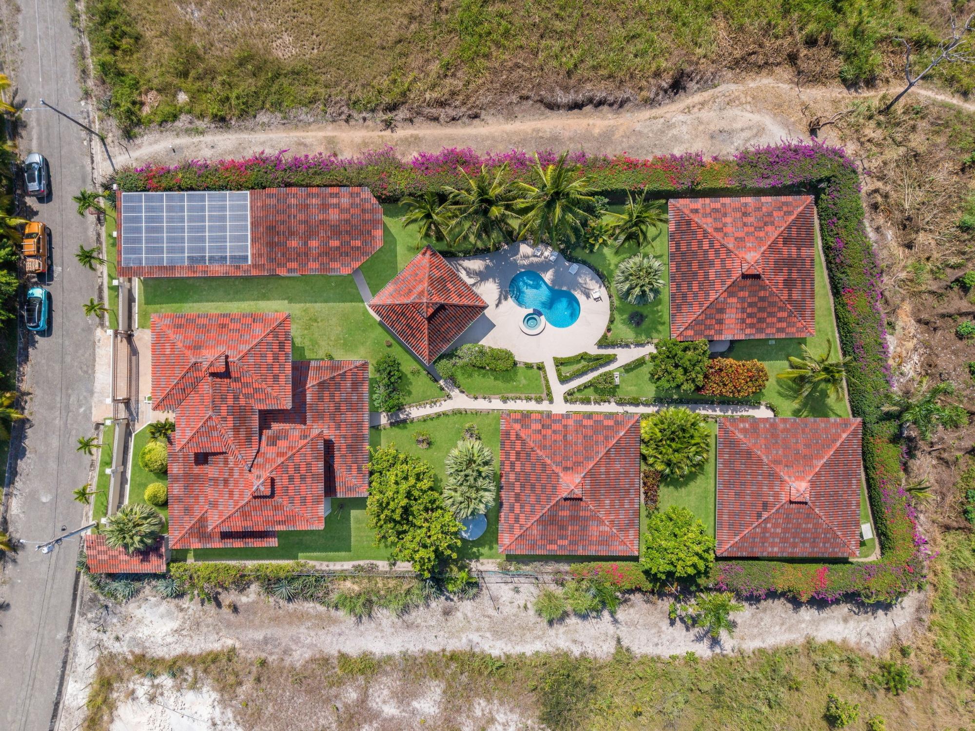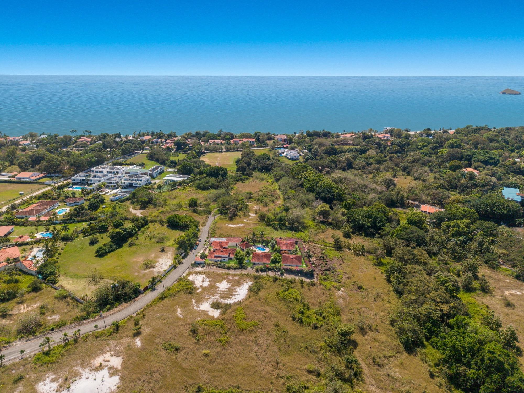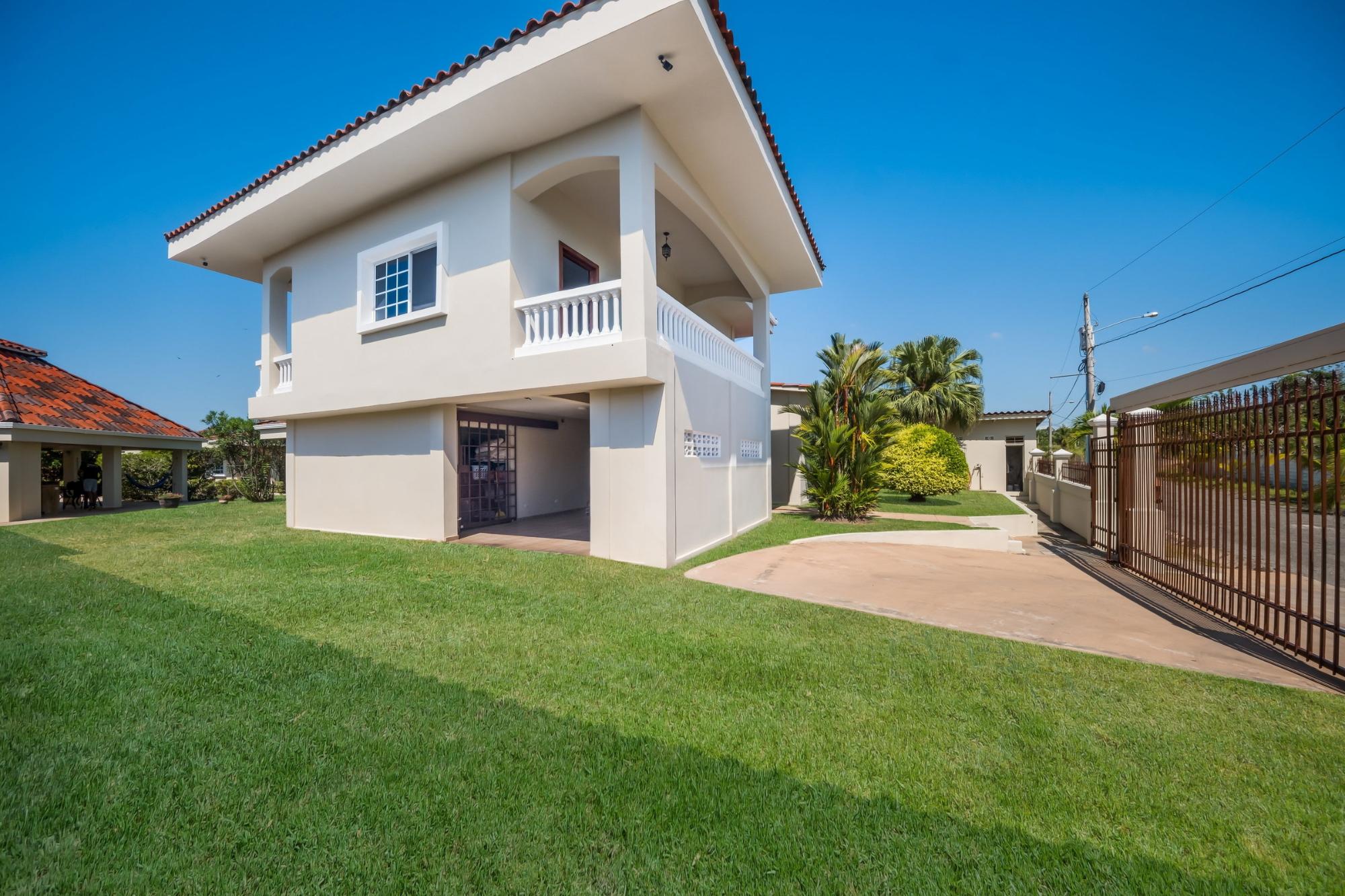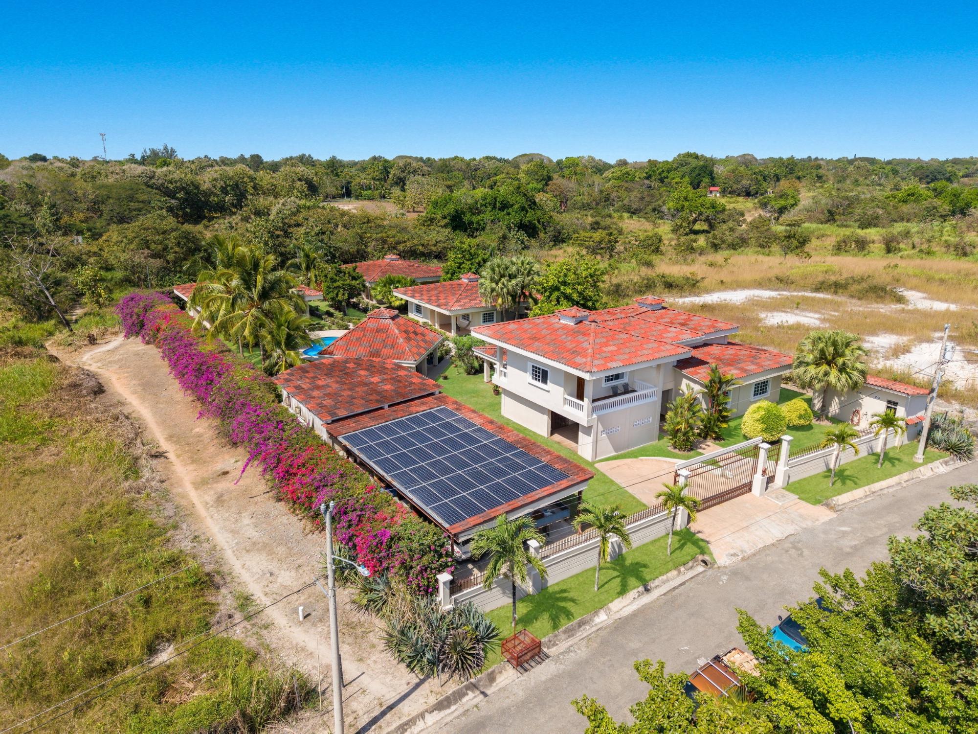 Discover your dream home in Santa Clara, Rio Hato – a property that perfectly blends modern luxury, comfort, and the natural beauty of Panama’s Pacific Coast. This stunning home offers spacious interiors, elegant finishes, and expansive outdoor spaces, making it the ideal location for relaxing family getaways or hosting unforgettable gatherings. Located just minutes from the beach, this property promises a lifestyle of tranquility and exclusivity. The property features a total land area of 3,033 m² and a main house of 380 m², fully furnished and equipped. The main house has 3 bedrooms, 3.5 bathrooms, a den, living room, kitchen, and office. The common area includes a gazebo with a grill, refrigerator, sink, and a large seating area, as well as a pool with outdoor showers and bathroom. Additionally, the property includes three guest houses, each measuring 118 m², furnished and equipped with 2 bedrooms, 2 bathrooms, living room, and kitchen. The construction is made of cement, concrete and M2 panels, providing excellent insulation, minimal maintenance and a robust structure. The property is equipped with solar panels that supply power to the main house and common areas, eliminating electricity costs. The solar system can also supply power to the guest houses if needed. Each house, including the guest houses and common areas, has its own electricity meter. The property also has a private water well with irrigation system, a comprehensive drainage system and a security system installed throughout the property. In addition, it has an electric generator, high-speed fiber optic internet with Tigo and pressure and well water pumps.