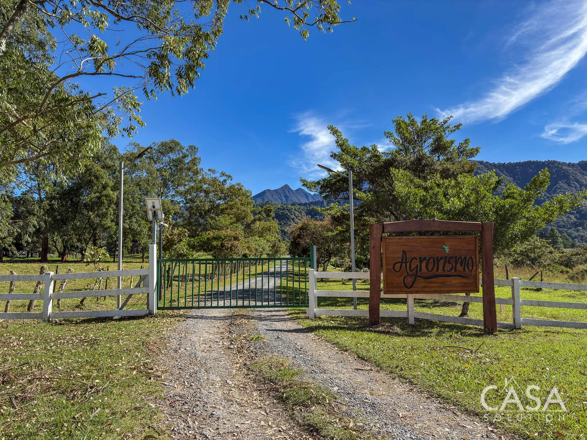Active agricultural use and preserved green space define the area. The project includes designated green areas, pine forest sections, and productive land planted with coffee. A vineyard area continues to develop within the project, with grape plants already established and in growth.