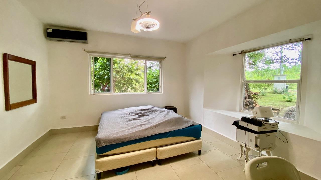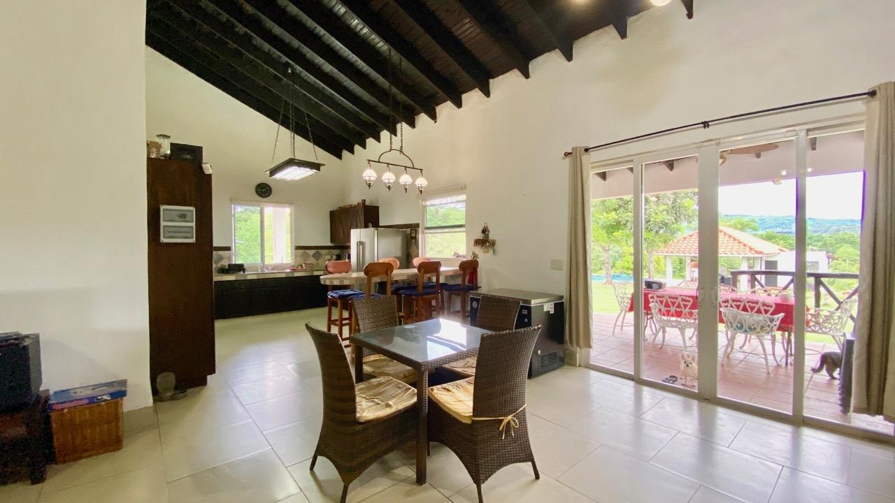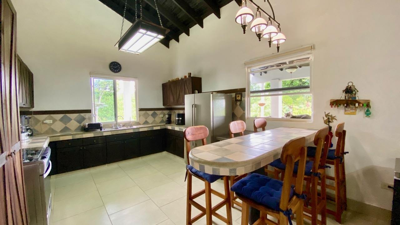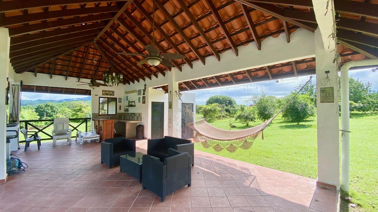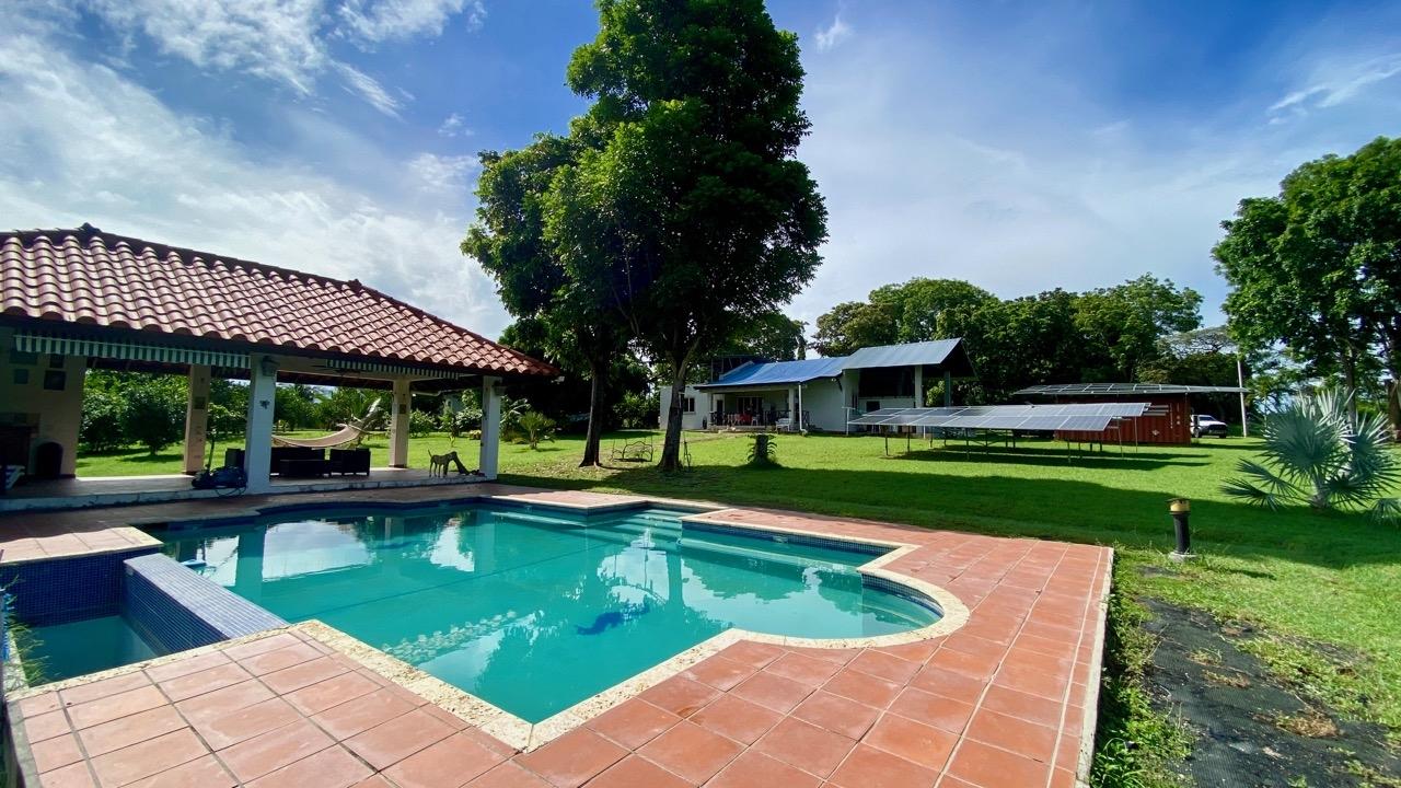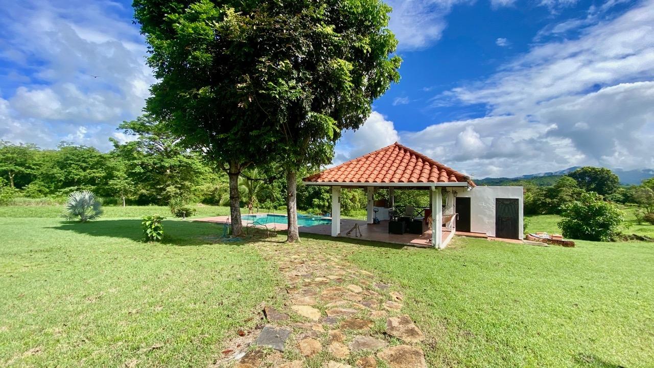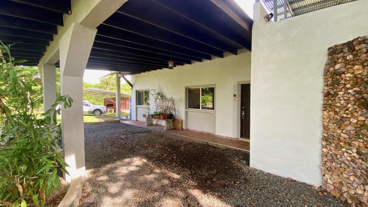 Colonial 3-bed house, with a nice pool and a large landscaped land, about 10 minutes away from Coronado. It's located in the complex Las Quintas de Cabuya, on the way to the village of Cabuya. Very friendly complex with about 20 houses, surrounded by mountains, offering some nice views and a sweet breeze all along the year. Small social area with pool and gazebos. House with colonial style, high ceilings made of solid dark wood. Built 2014. Approximately 200m2 area and 3,400m2 of garden, with fruit trees, this property enjoys a privileged location, in a dead end street. It has the following features: •Large living room, terrace access, •Open kitchen, fitted and equipped, with dining area, •1st Bedroom, with private bathroom and a mezzanine, AC & ceiling fan, •2nd Bedroom, also with private bathroom, AC & ceiling fan, •3rd Bedroom, AC & ceiling fan, •Separate full bathroom, •Covered terrace, •Outside restroom, •Pool and large gazebo with outside kitchen, brick oven, full bathroom and large storage, •Laundry room, •Garden shed, •60m2 lookout platform with water & electricity, •Many parking spaces. •Available for 55,000 USD a 20 feet refrigerated and insulated container with solar system, batteries and controls. The 3,400m2 garden is fully landscaped, with many fruits trees as papaya, piña, mango, banana, coconut, soursop, lemon, orange & mandarin. This colonial 3-bed house is a very good option for those who are looking for large family home, in a quiet and safe neighborhood. TAX EXEMPTION UNTIL 2034.