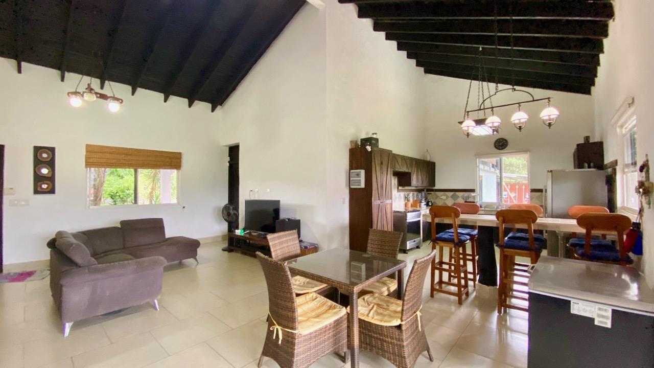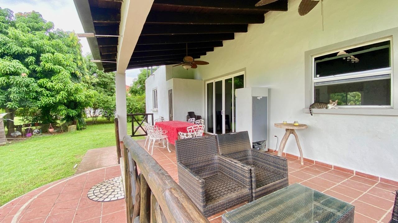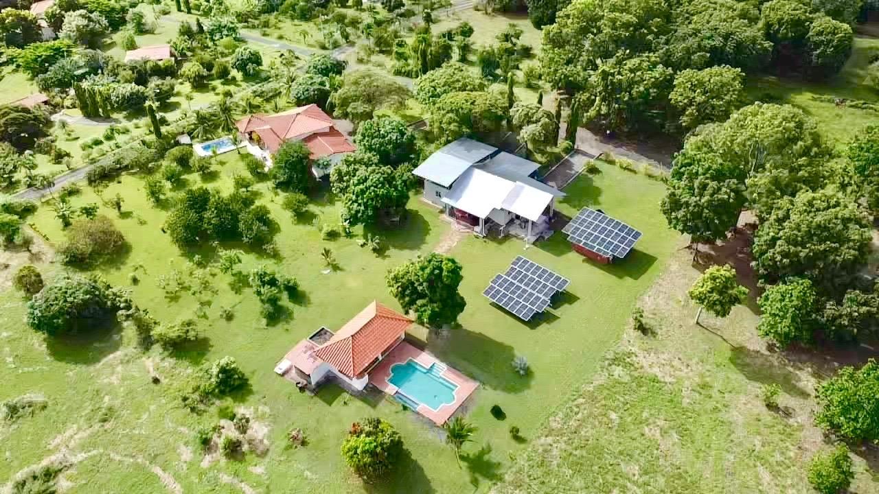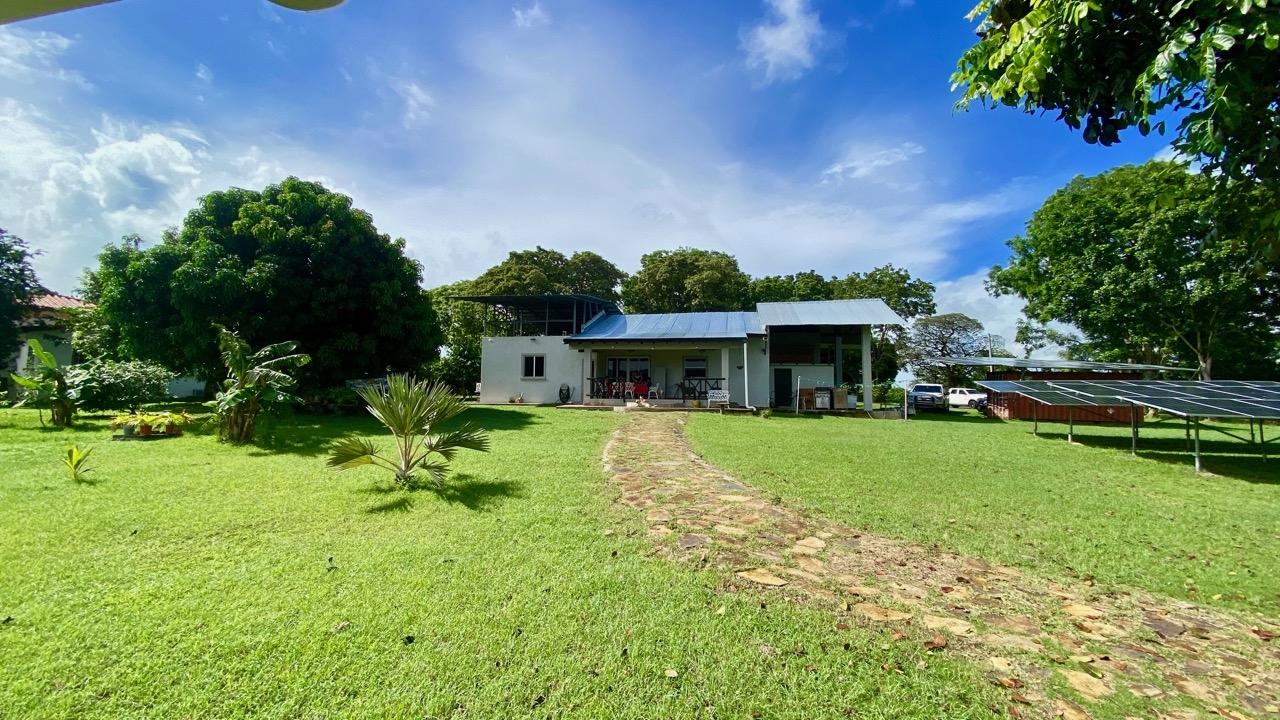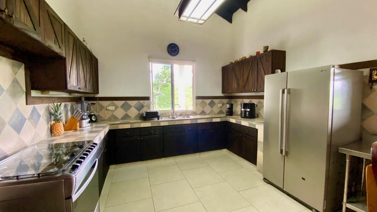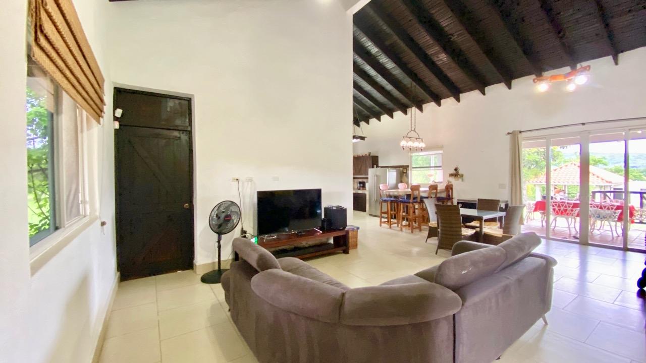 Colonial 3-bed house, with a nice pool and a large landscaped land, about 10 minutes away from Coronado. It's located in the complex Las Quintas de Cabuya, on the way to the village of Cabuya. Very friendly complex with about 20 houses, surrounded by mountains, offering some nice views and a sweet breeze all along the year. Small social area with pool and gazebos. House with colonial style, high ceilings made of solid dark wood. Built 2014. Approximately 200m2 area and 3,400m2 of garden, with fruit trees, this property enjoys a privileged location, in a dead end street. It has the following features: •Large living room, terrace access, •Open kitchen, fitted and equipped, with dining area, •1st Bedroom, with private bathroom and a mezzanine, AC & ceiling fan, •2nd Bedroom, also with private bathroom, AC & ceiling fan, •3rd Bedroom, AC & ceiling fan, •Separate full bathroom, •Covered terrace, •Outside restroom, •Pool and large gazebo with outside kitchen, brick oven, full bathroom and large storage, •Laundry room, •Garden shed, •60m2 lookout platform with water & electricity, •Many parking spaces. •Available for 55,000 USD a 20 feet refrigerated and insulated container with solar system, batteries and controls. The 3,400m2 garden is fully landscaped, with many fruits trees as papaya, piña, mango, banana, coconut, soursop, lemon, orange & mandarin. This colonial 3-bed house is a very good option for those who are looking for large family home, in a quiet and safe neighborhood. TAX EXEMPTION UNTIL 2034.