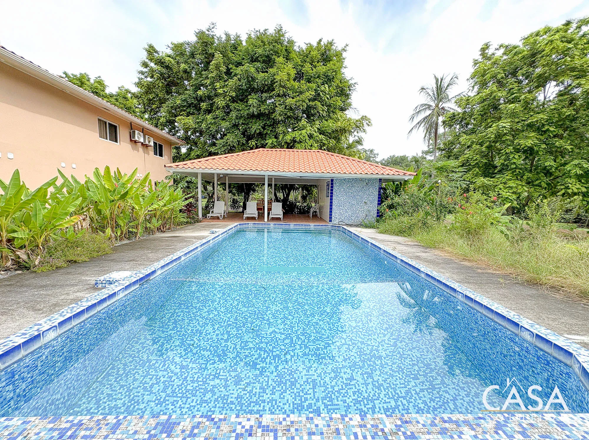Communal Area for the 4 Condos: Garden, swimming pool, terrace with partial roof, and outdoor furniture