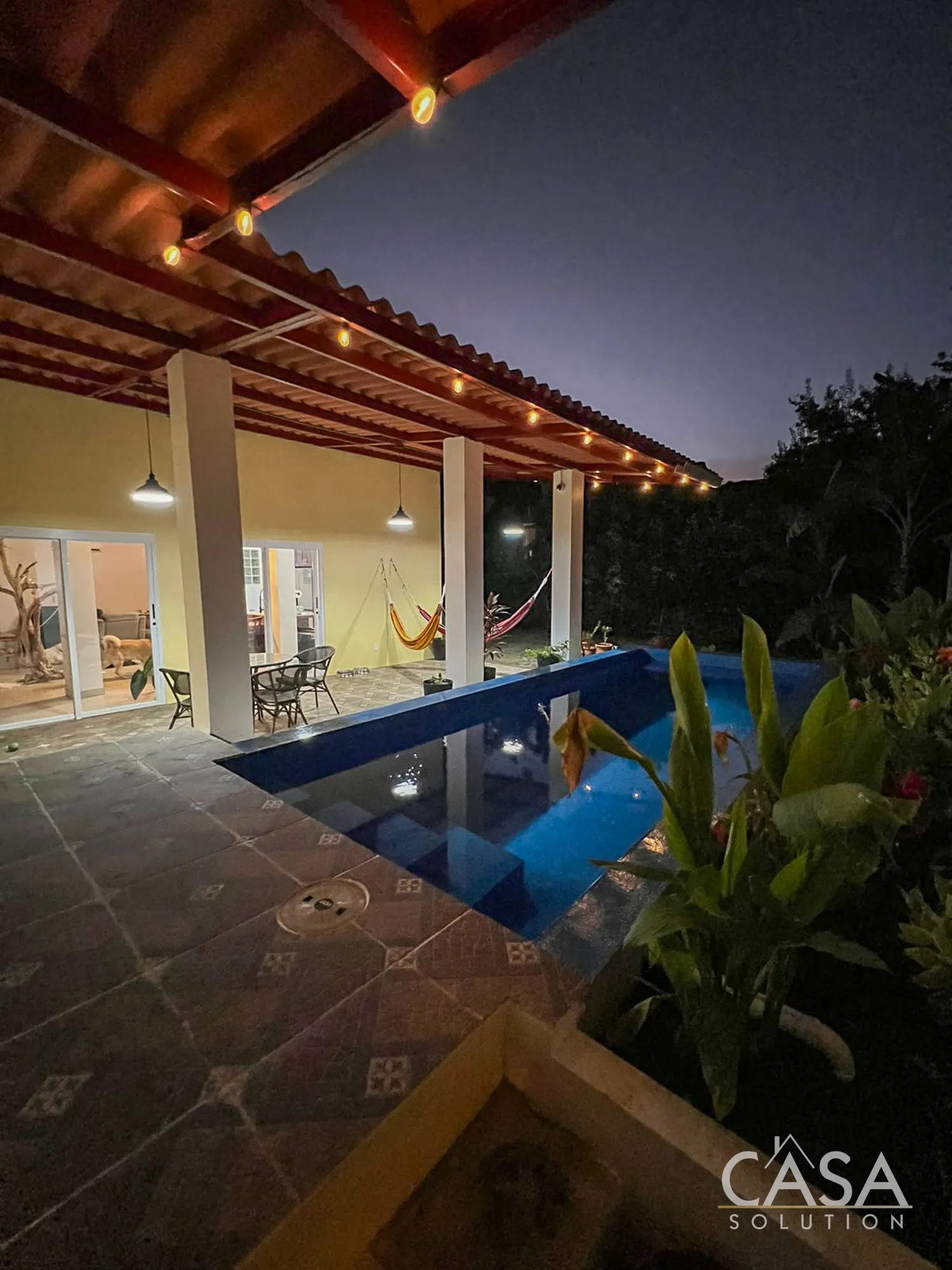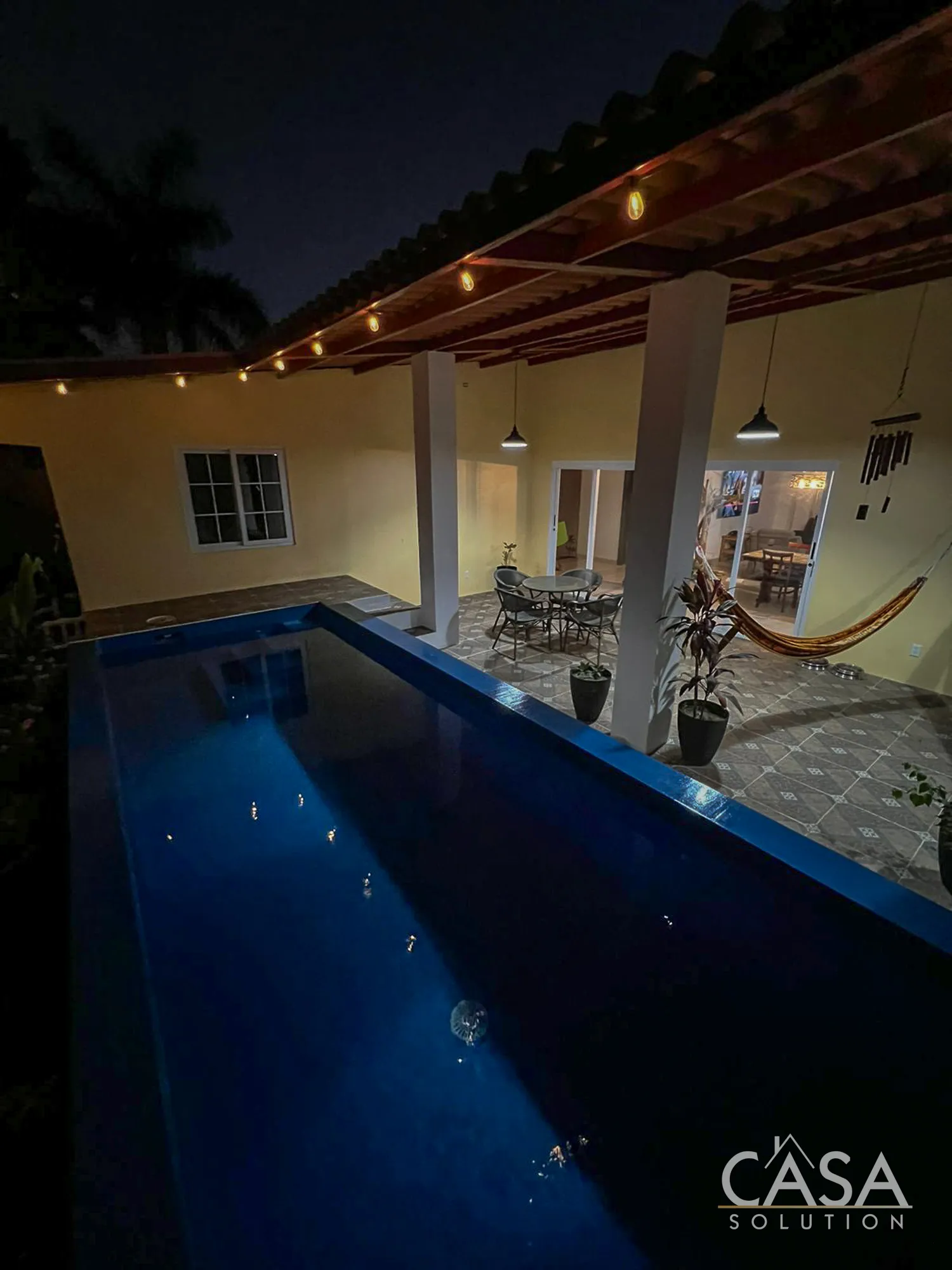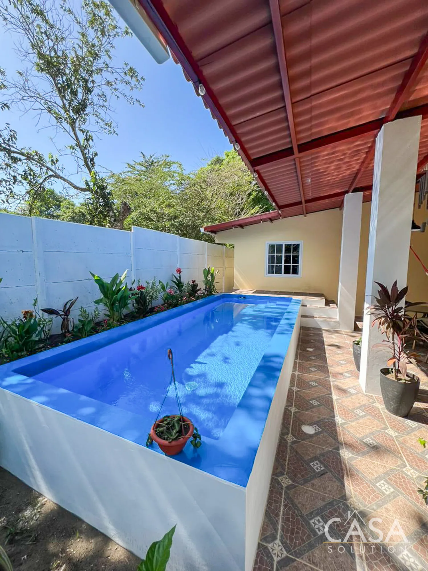 Please contact Casa Solution if you would like to view this property or have questions about this Furnished 2-bedroom home for sale in Puerto Armuelles, Chiriquí. Features include a pool, solar panels, garden with fruit trees, and gated access—just 3 minutes from the ocean
