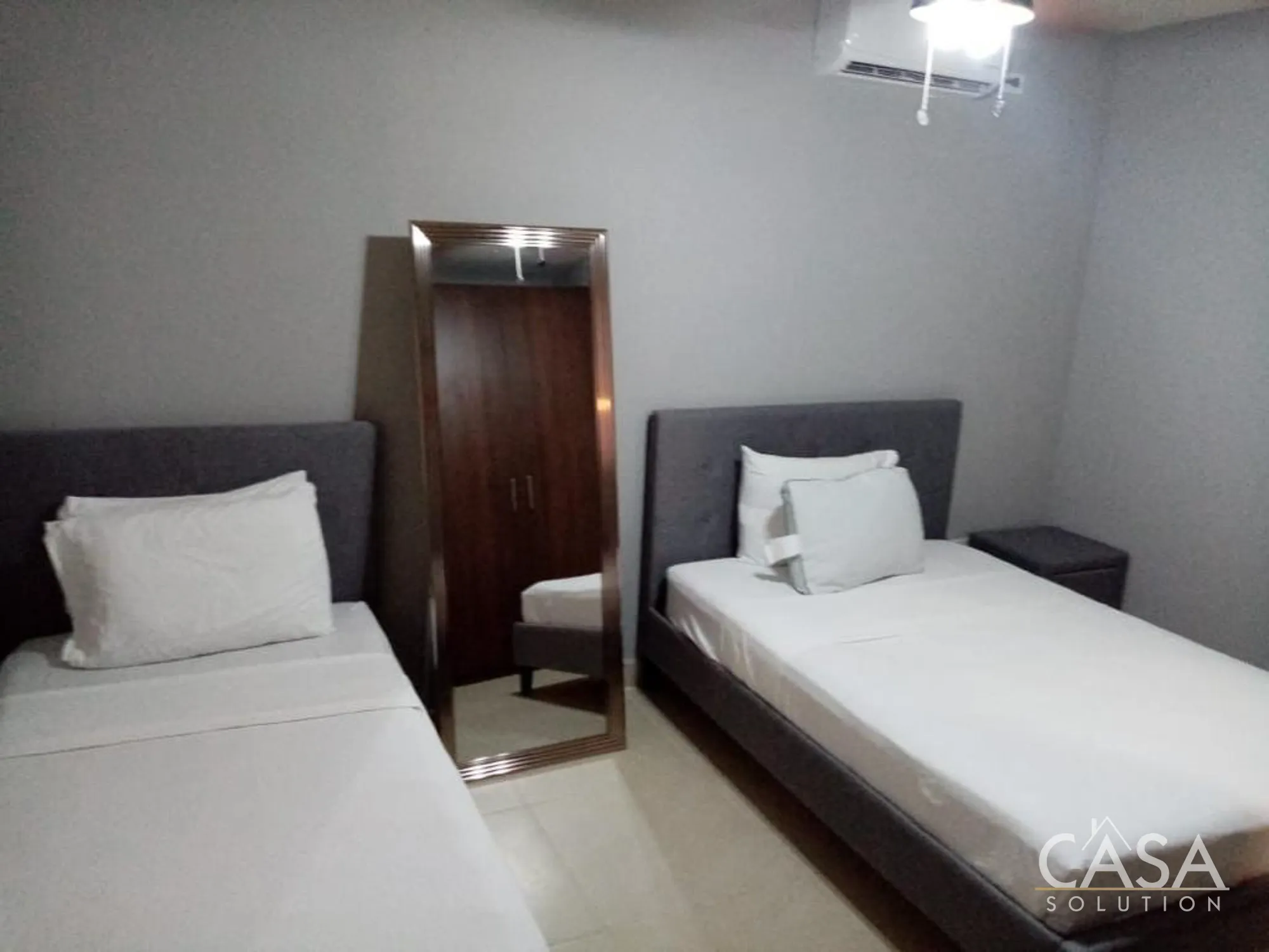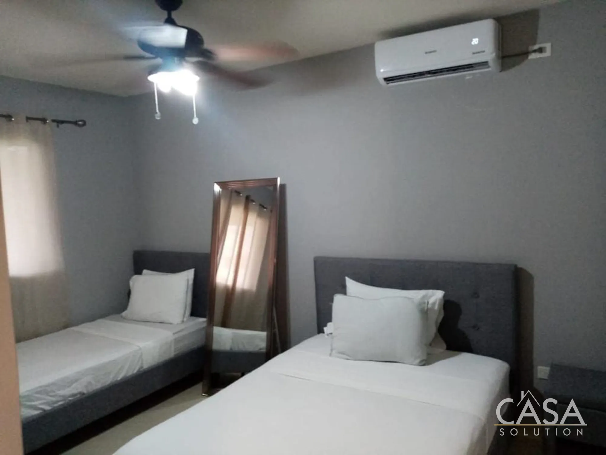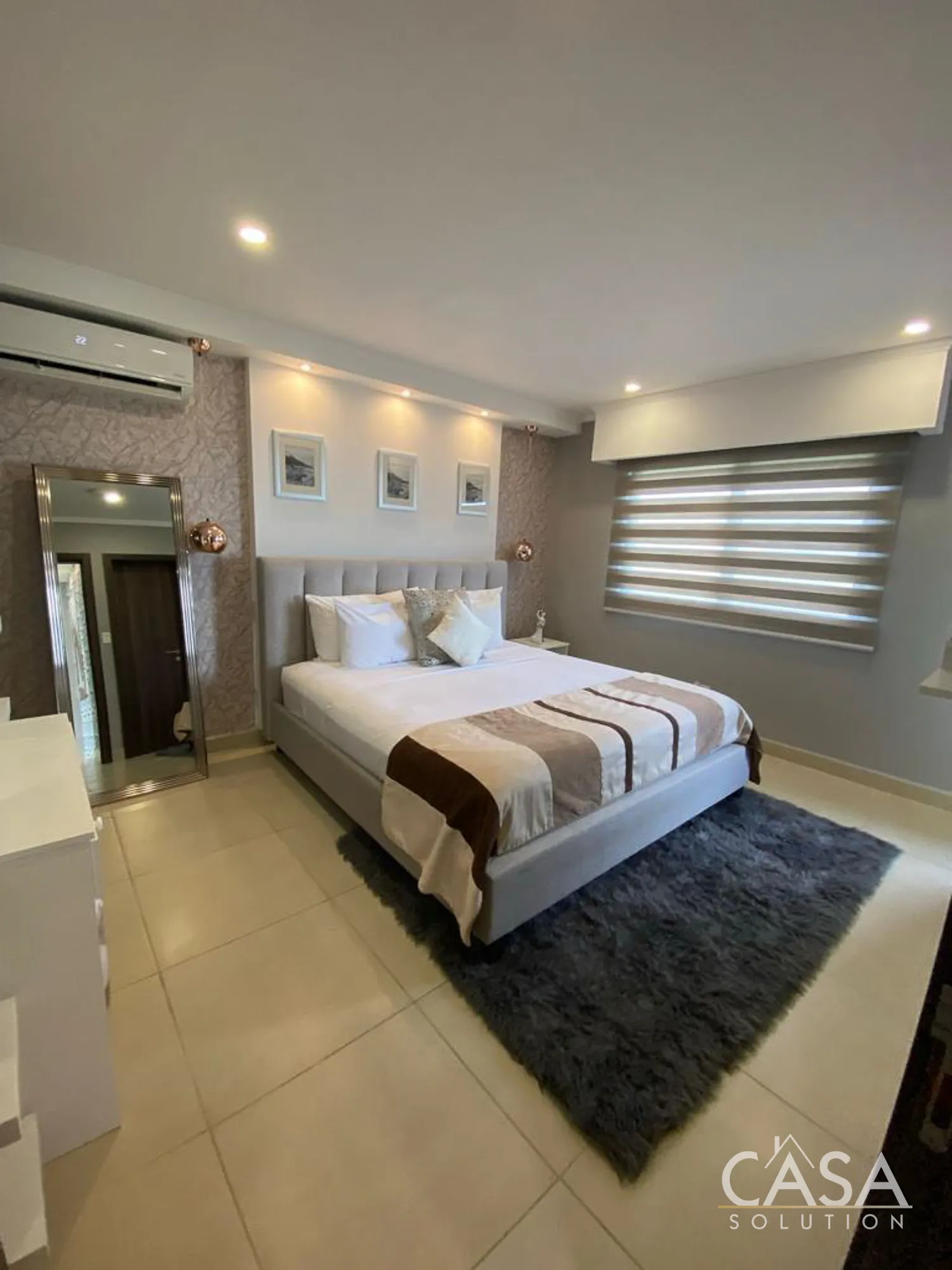 Upstairs, you’ll find two well-proportioned bedrooms, each with its own en-suite bathroom. The main bedroom is especially comfortable with air conditioning, a built-in closet, and well-planned lighting. All bathrooms feature quality tile work and modern fixtures.