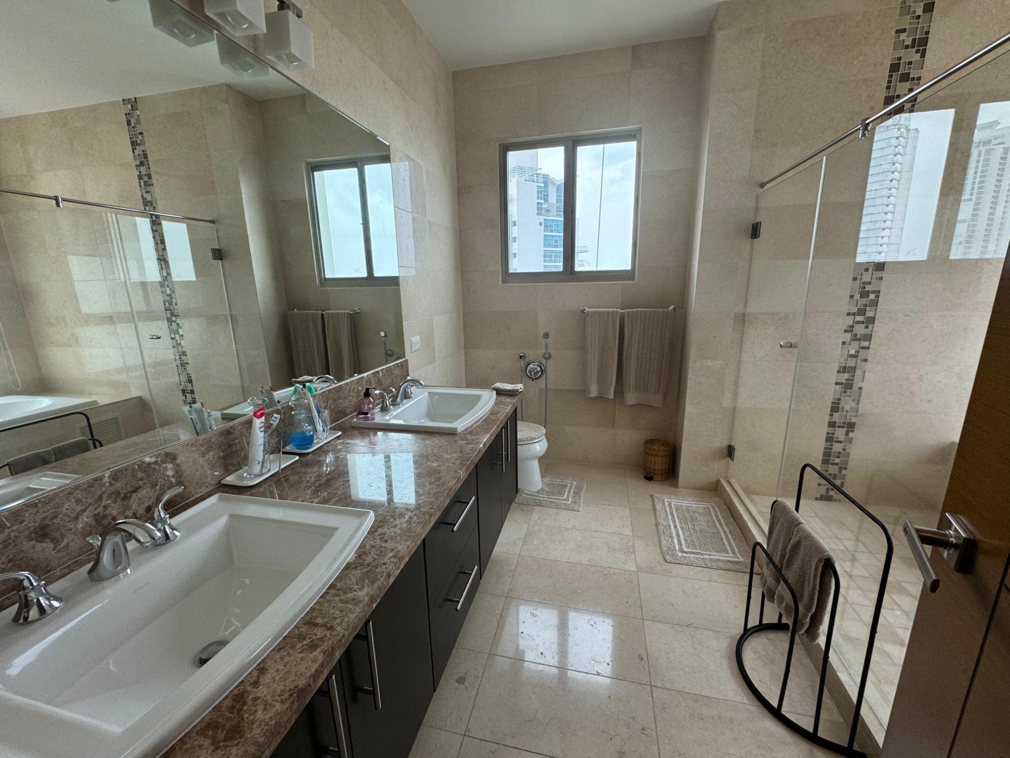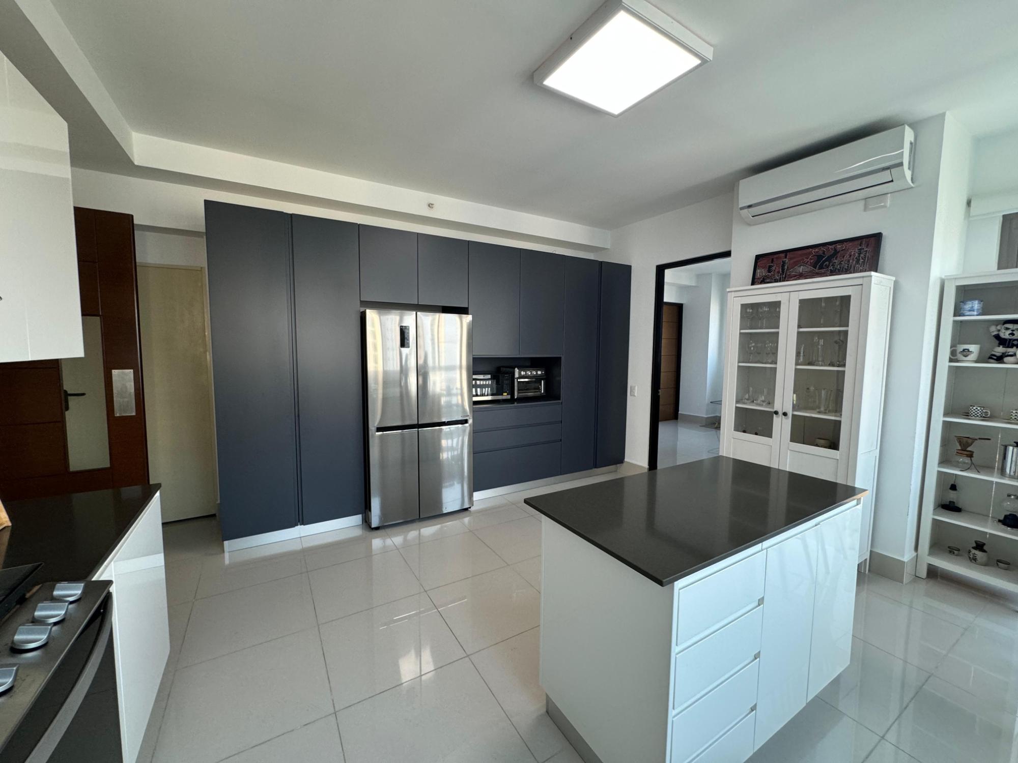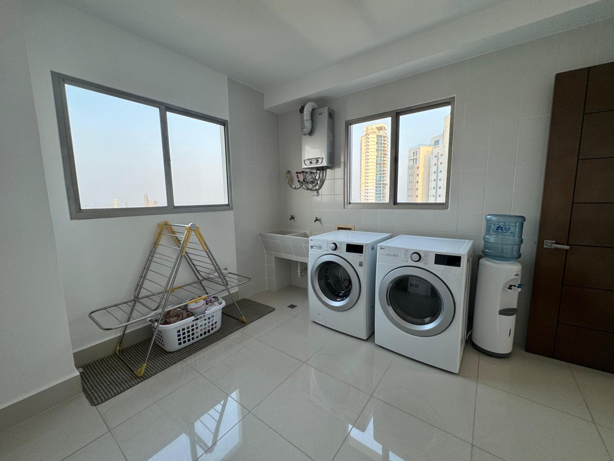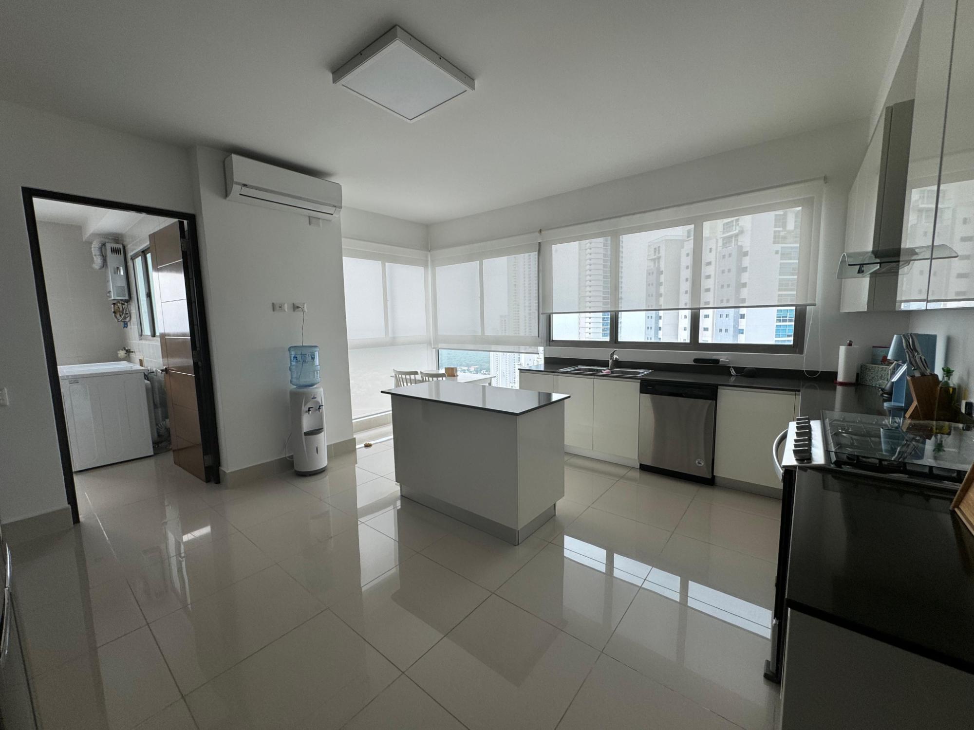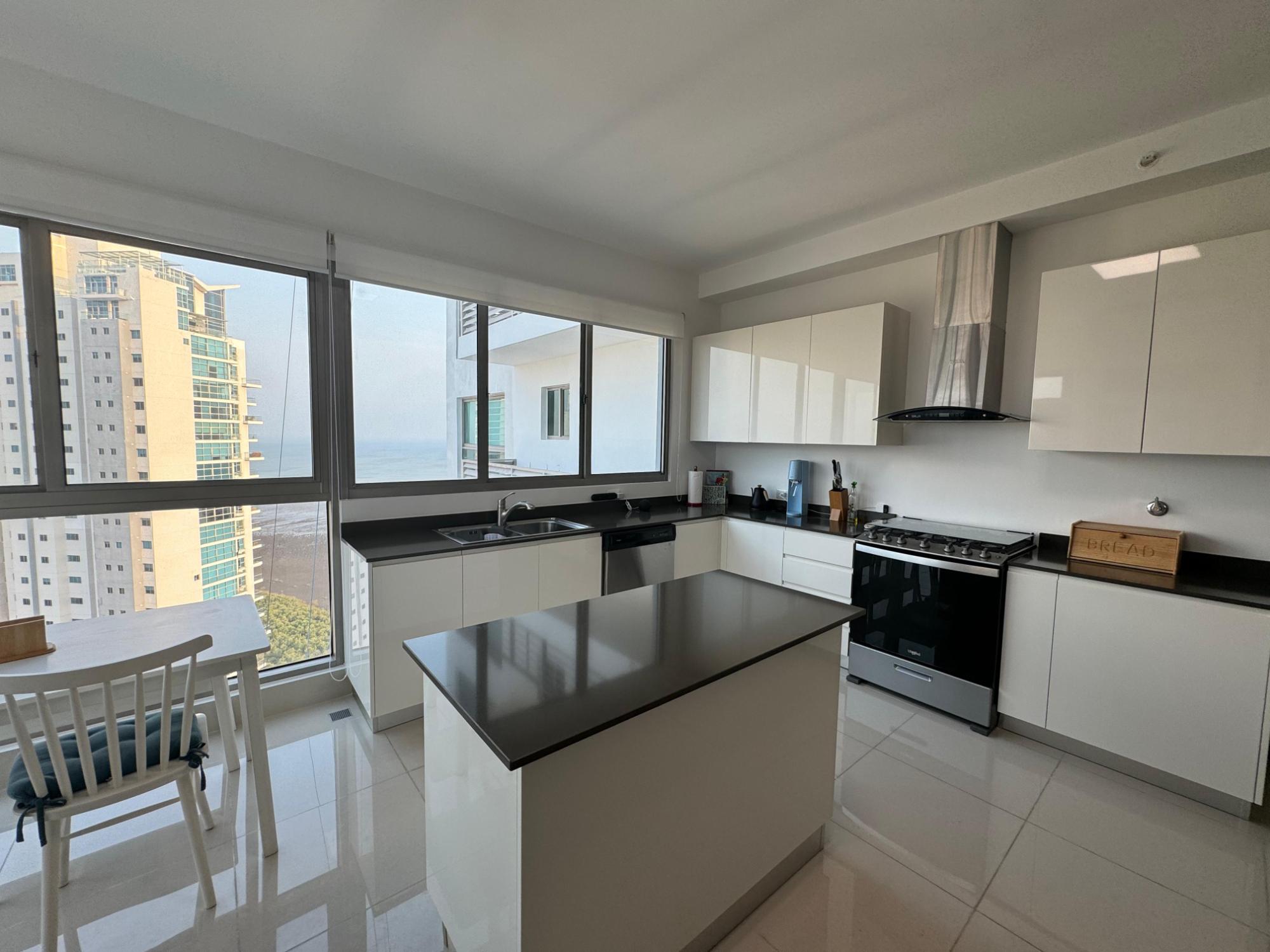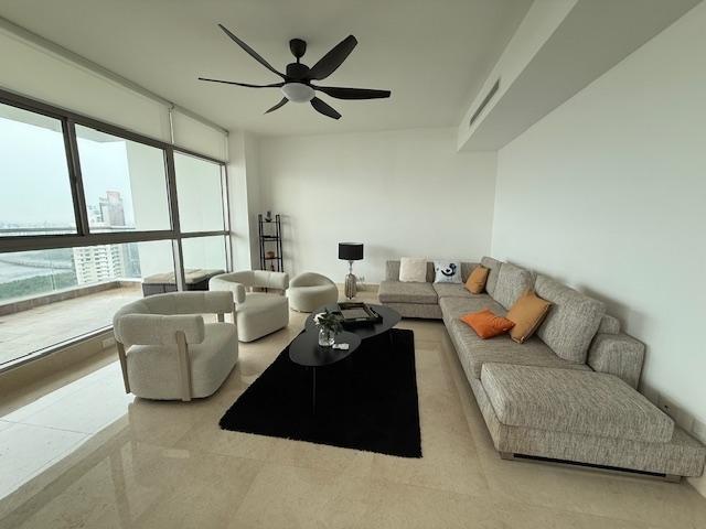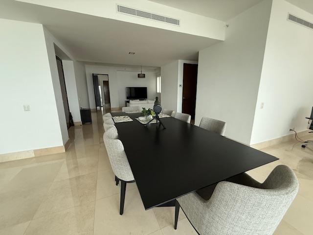 PH Paramount 313 square meters, 3 bedrooms, 3.5 bathrooms, living room, dining room, balcony with ocean and Marine Corridor views, laundry, 3 parking spaces, 1 storage room. It is rented furnished, with appliances, central air conditioning, and split units in bedrooms and kitchen.