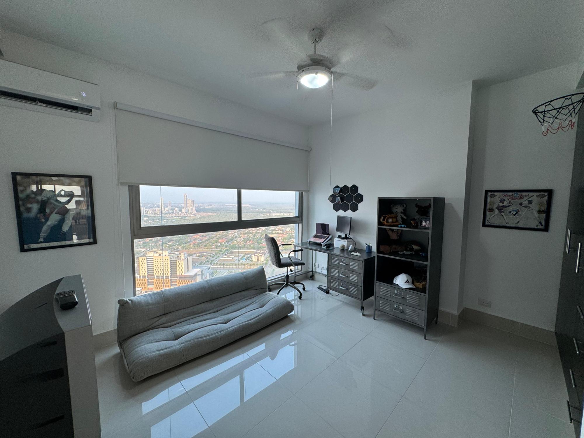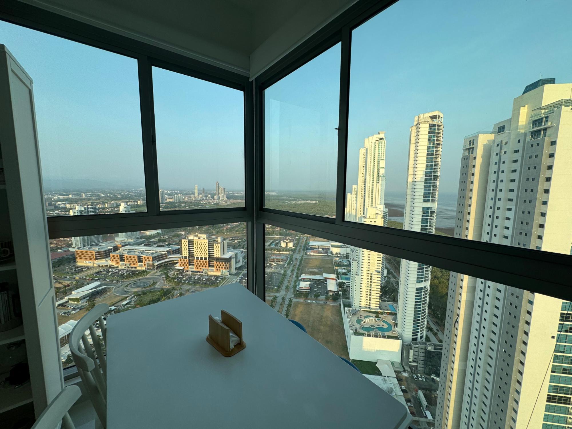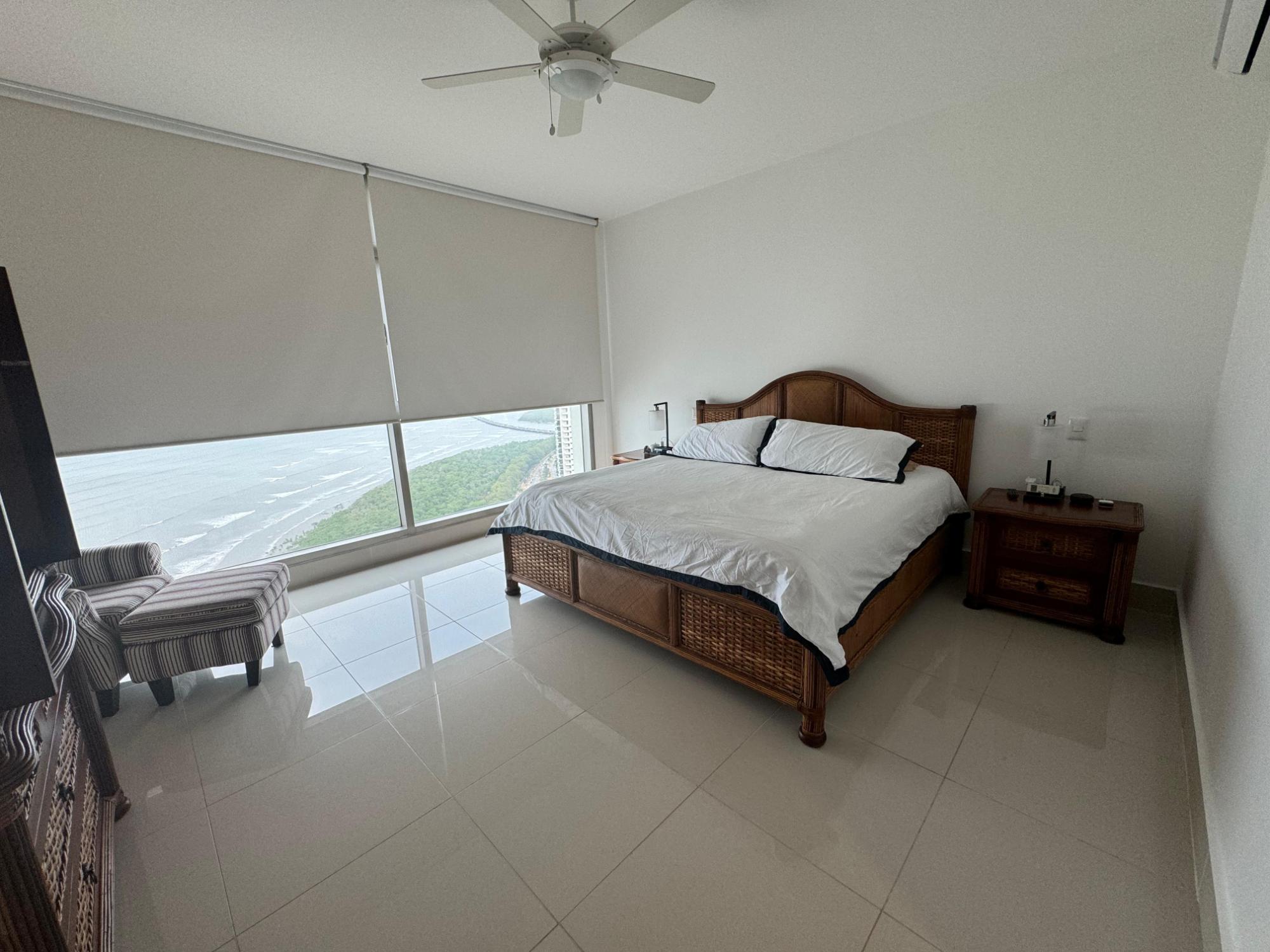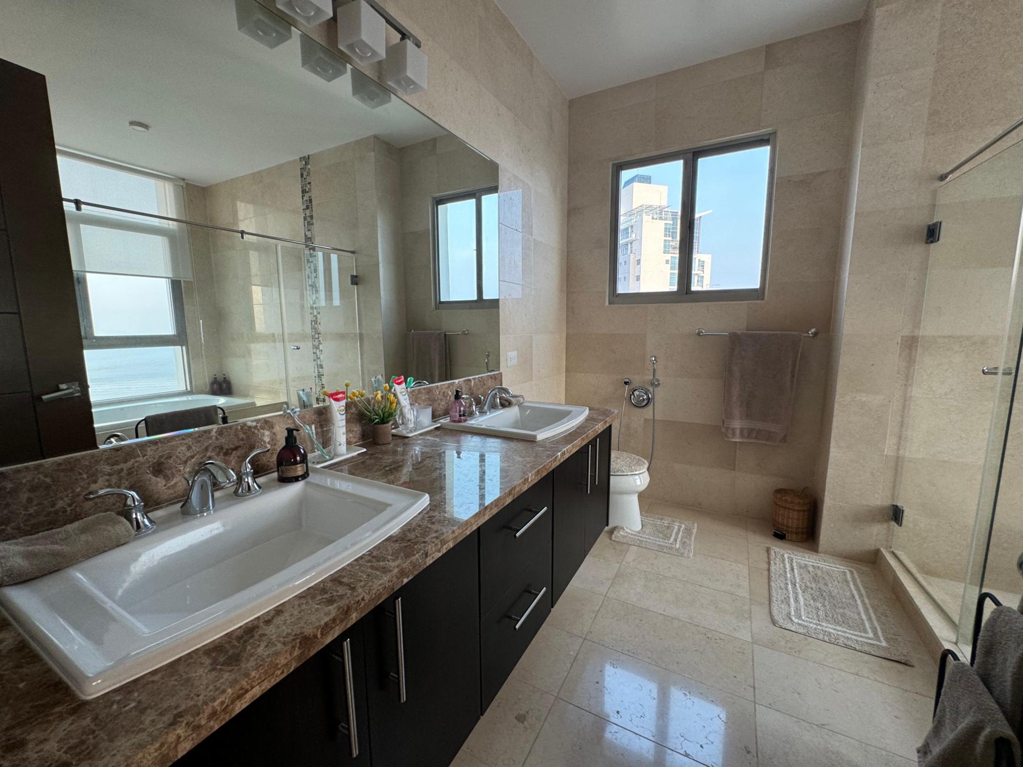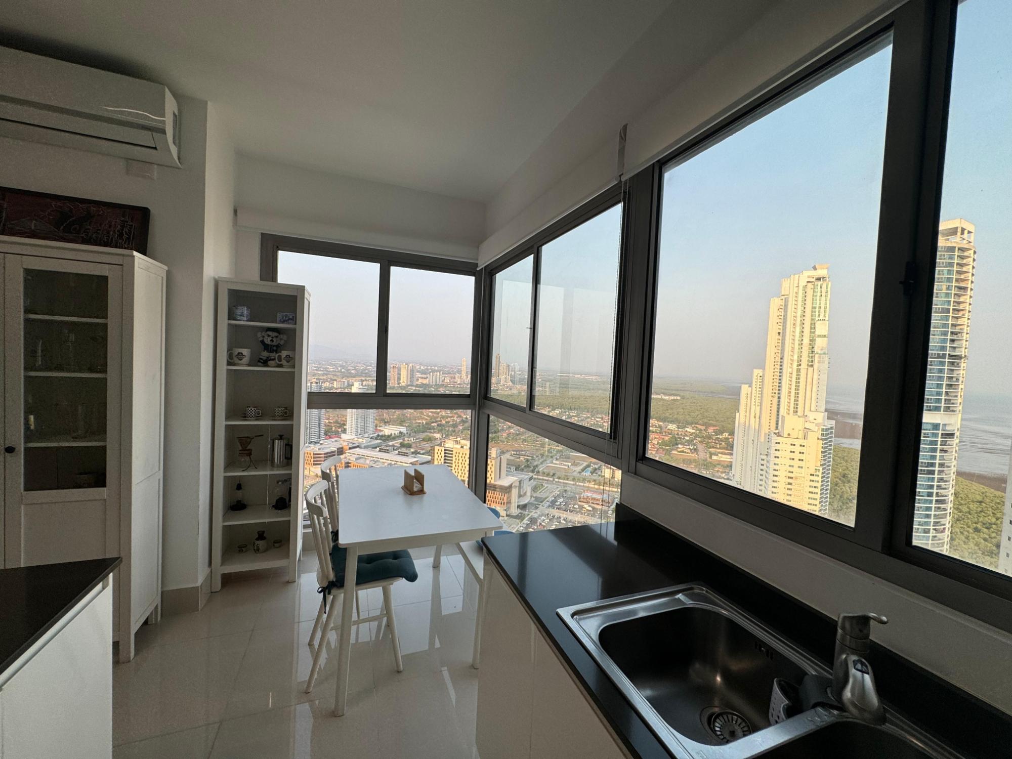 PH Paramount 313 square meters, 3 bedrooms, 3.5 bathrooms, living room, dining room, balcony with ocean and Marine Corridor views, laundry, 3 parking spaces, 1 storage room. It is rented furnished, with appliances, central air conditioning, and split units in bedrooms and kitchen.