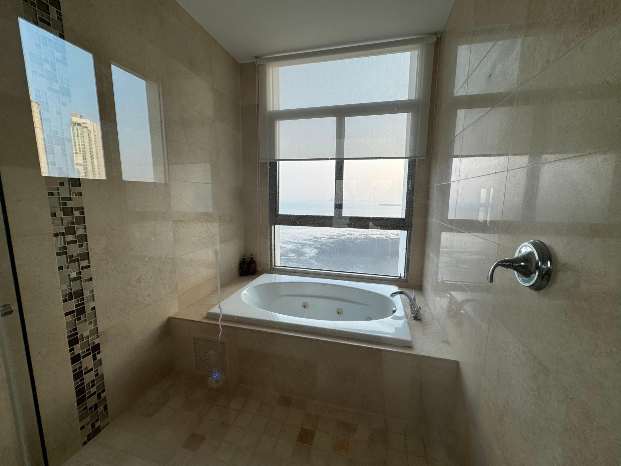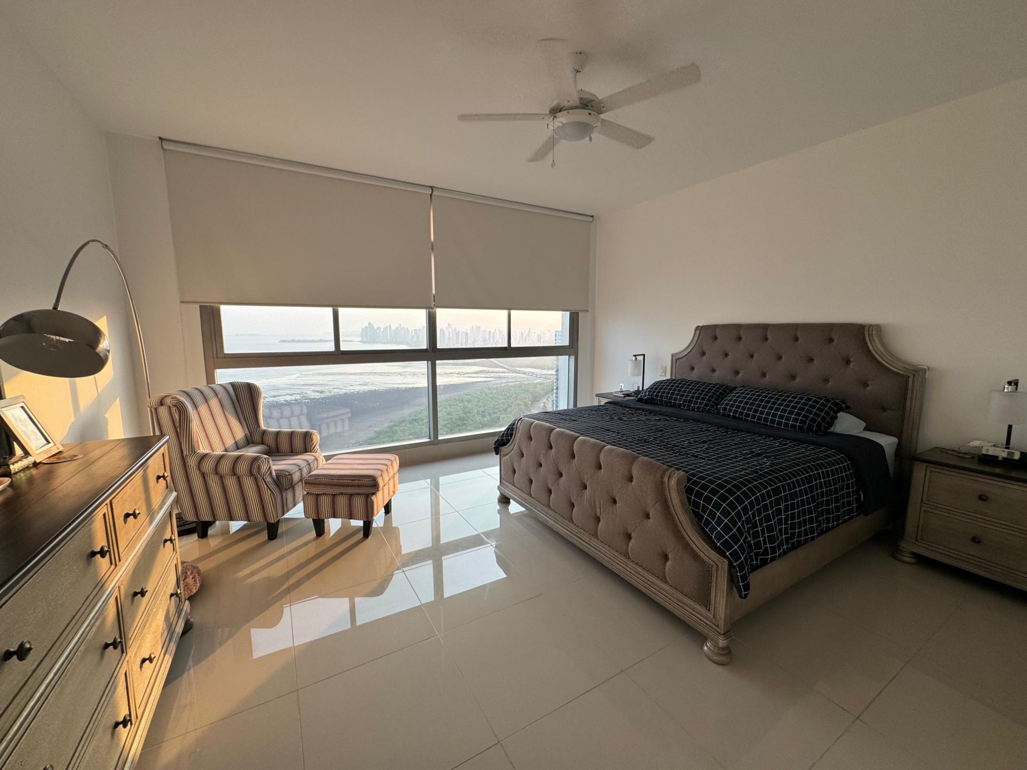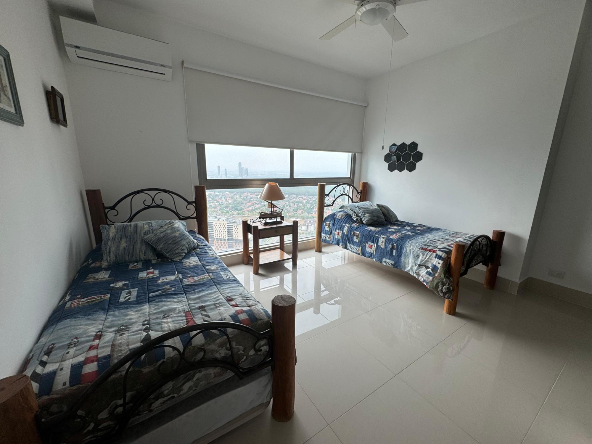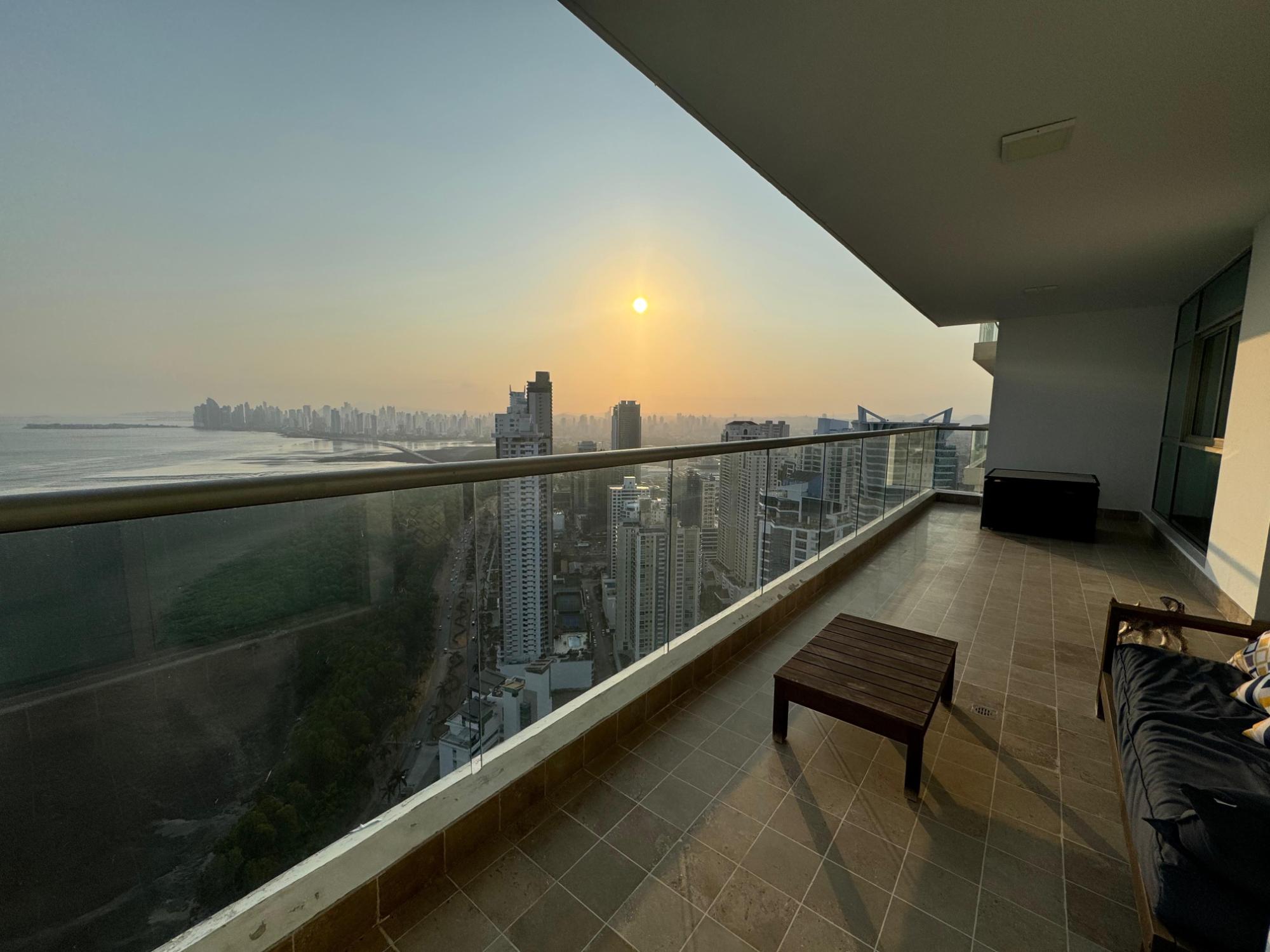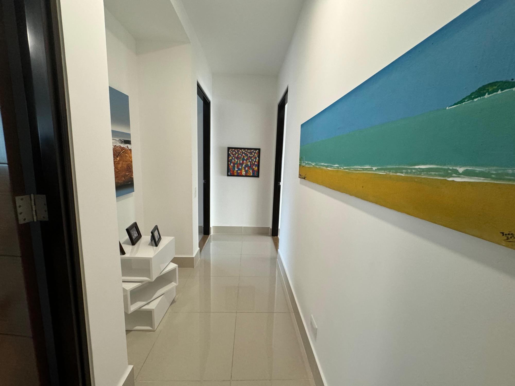 PH Paramount 313 square meters, 3 bedrooms, 3.5 bathrooms, living room, dining room, balcony with ocean and Marine Corridor views, laundry, 3 parking spaces, 1 storage room. It is rented furnished, with appliances, central air conditioning, and split units in bedrooms and kitchen.