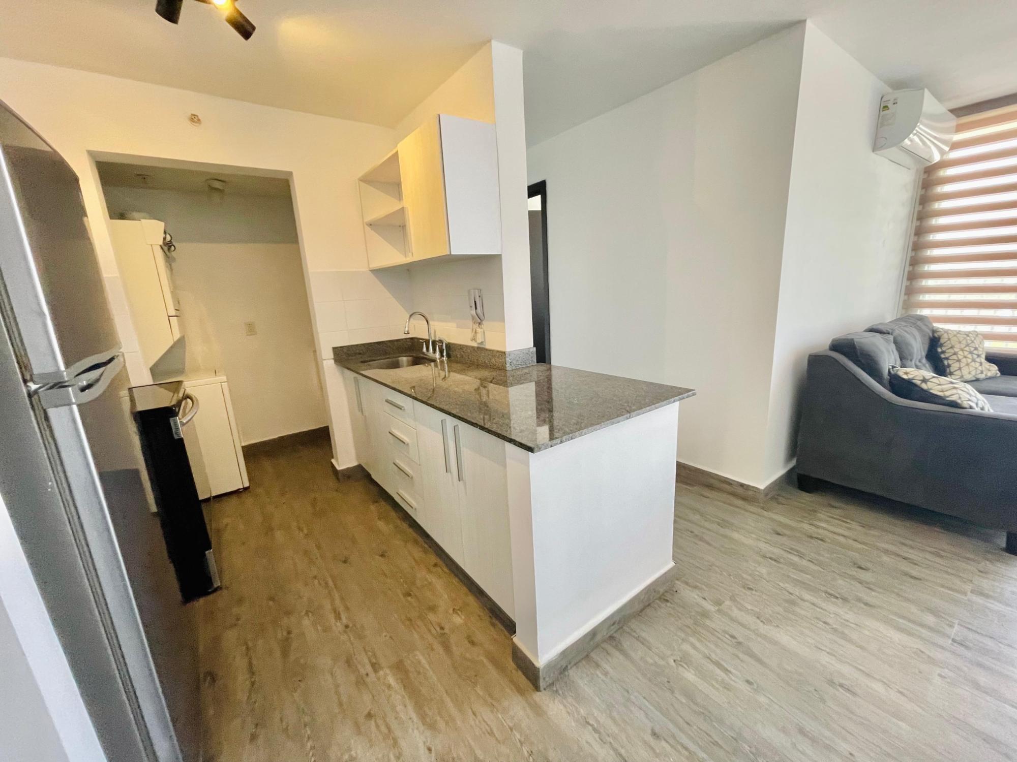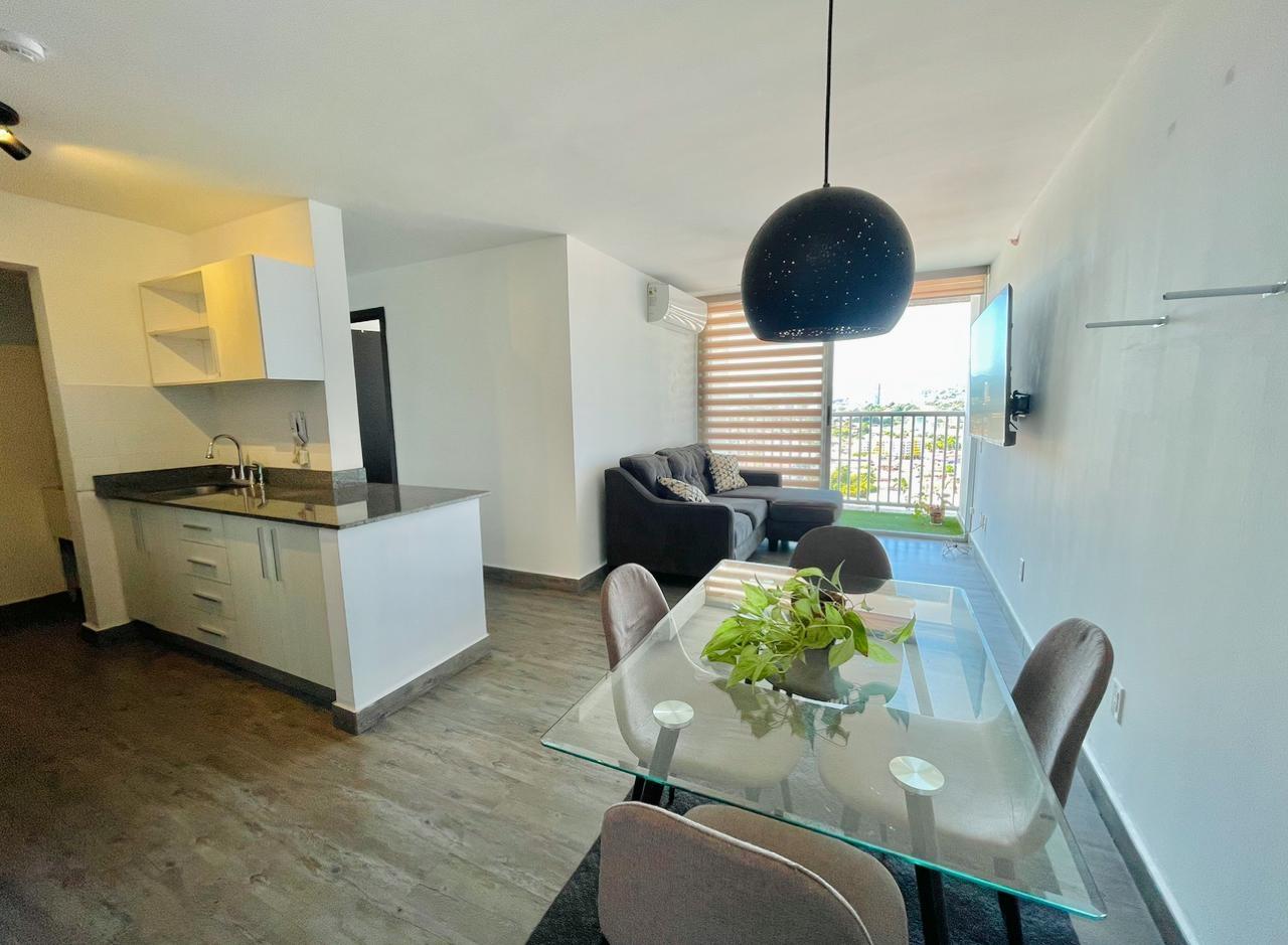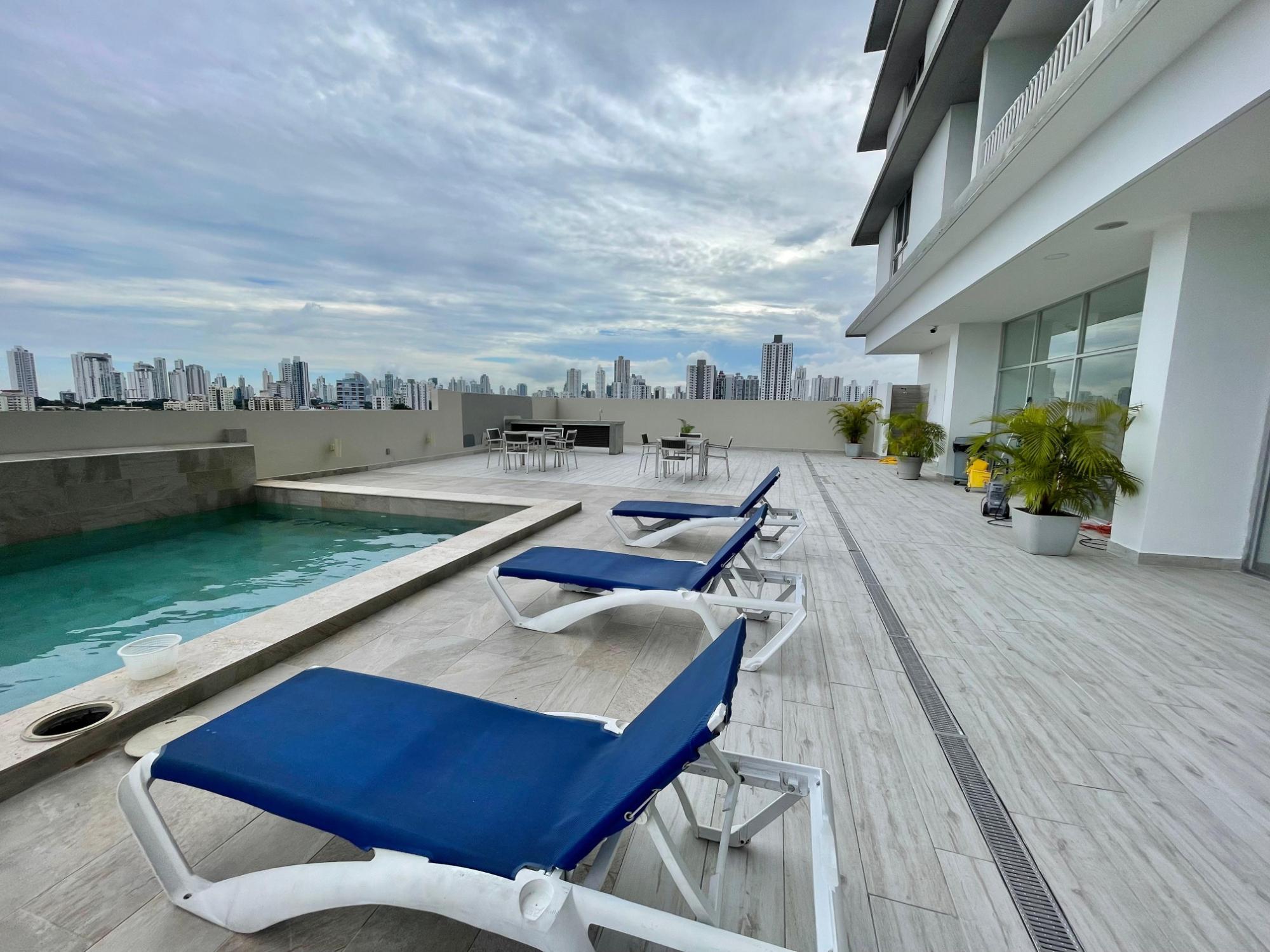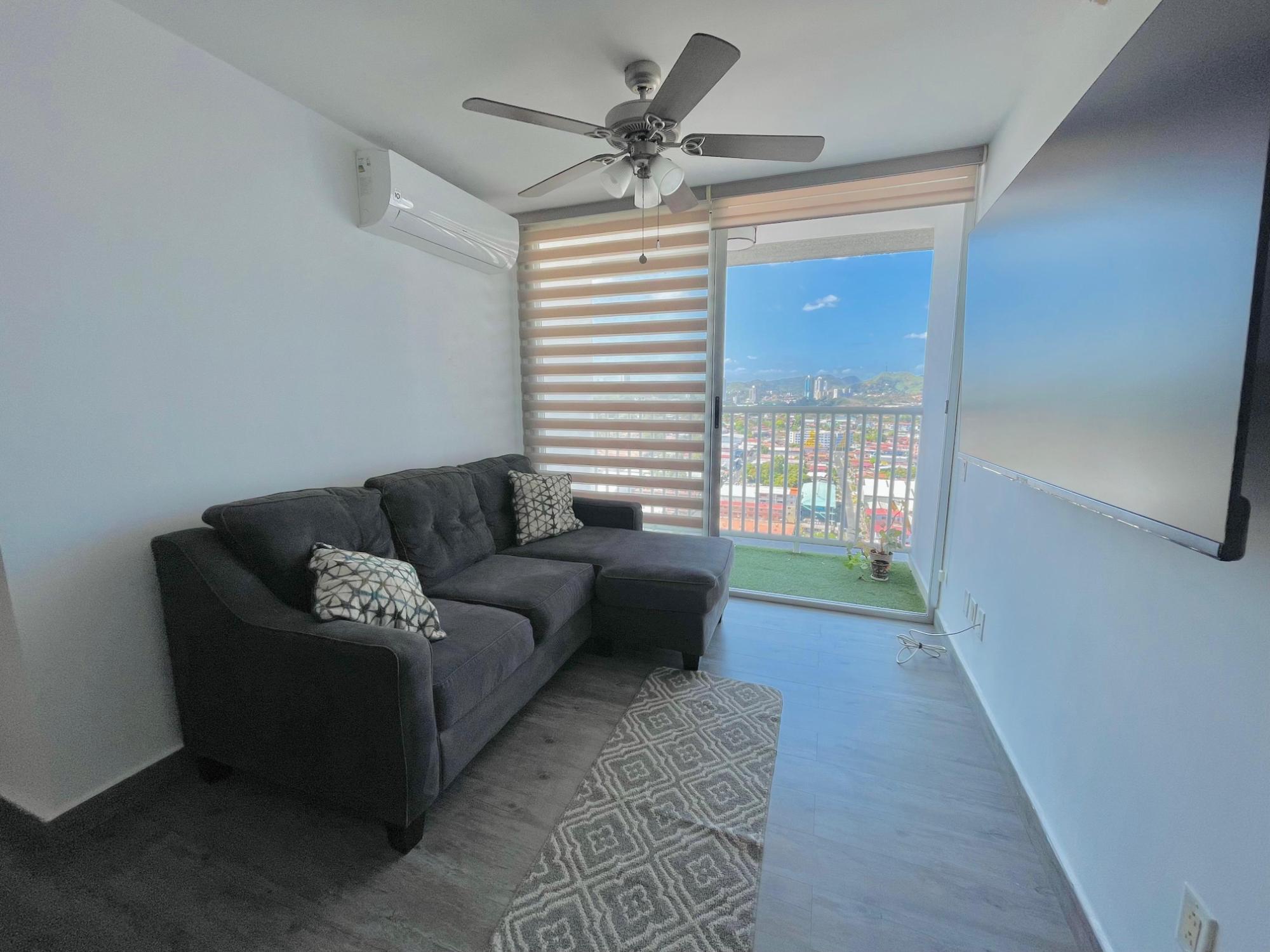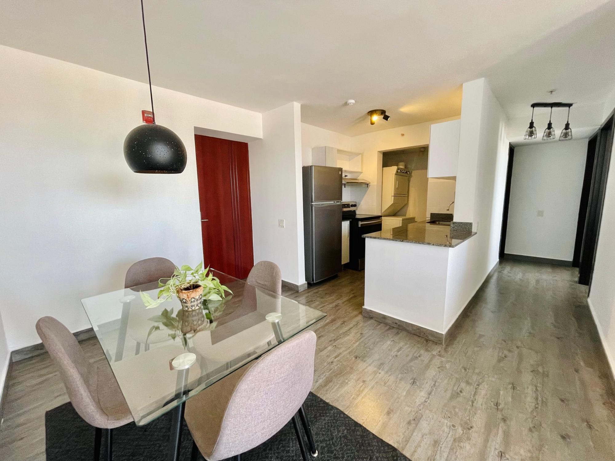Furnished Apartment for Rent in Parque Lefevre - PH Alegría PH Alegría has an excellent strategic location on Vía España, close to supermarkets, pharmacies, bakeries, restaurants and minutes from Costa del Este and San Francisco, due to its different access routes and public transportation. The apartment has: 66m2, 2 bedrooms, 2 full bathrooms, 1 parking, White Line, Inverter air conditioners, Open kitchen with granite countertops, Modern furniture, Lamps and blinds, Remodeled, Balcony. The building has a social area, party room, gym, swimming pool, playground, lobby, power plant, water tank, power plant, visitor parking and 24 hour security.