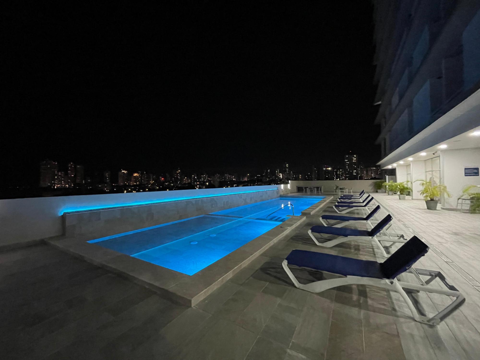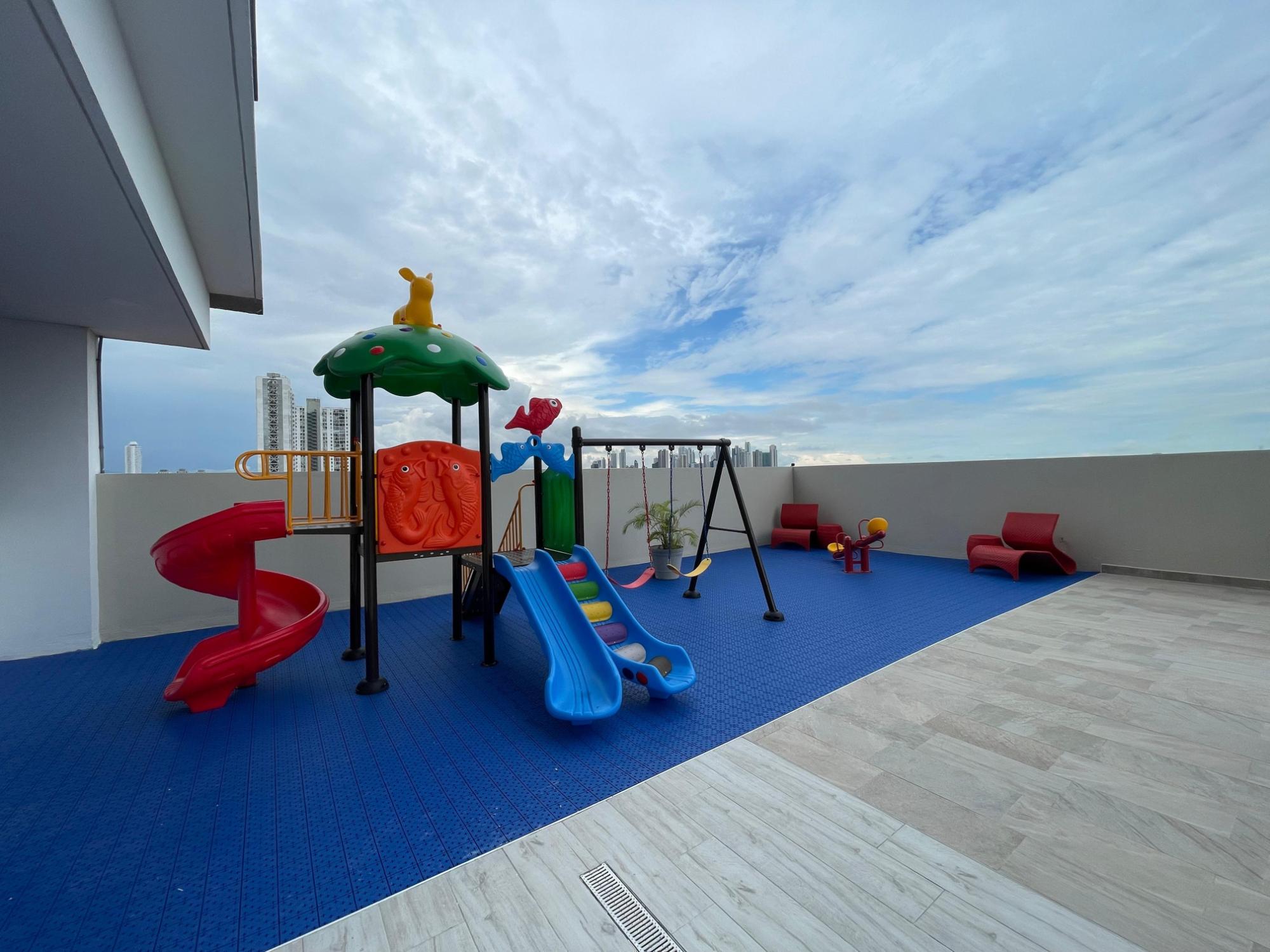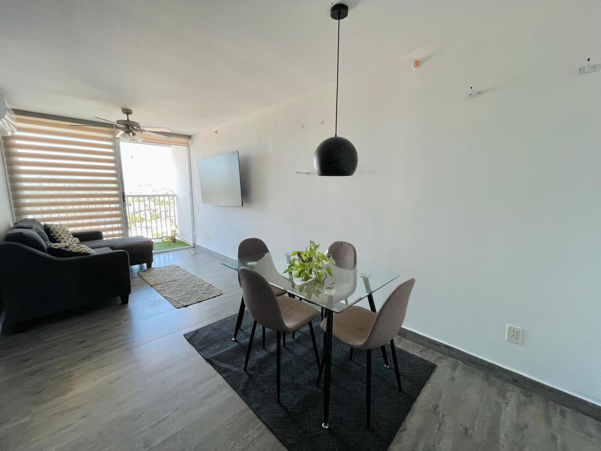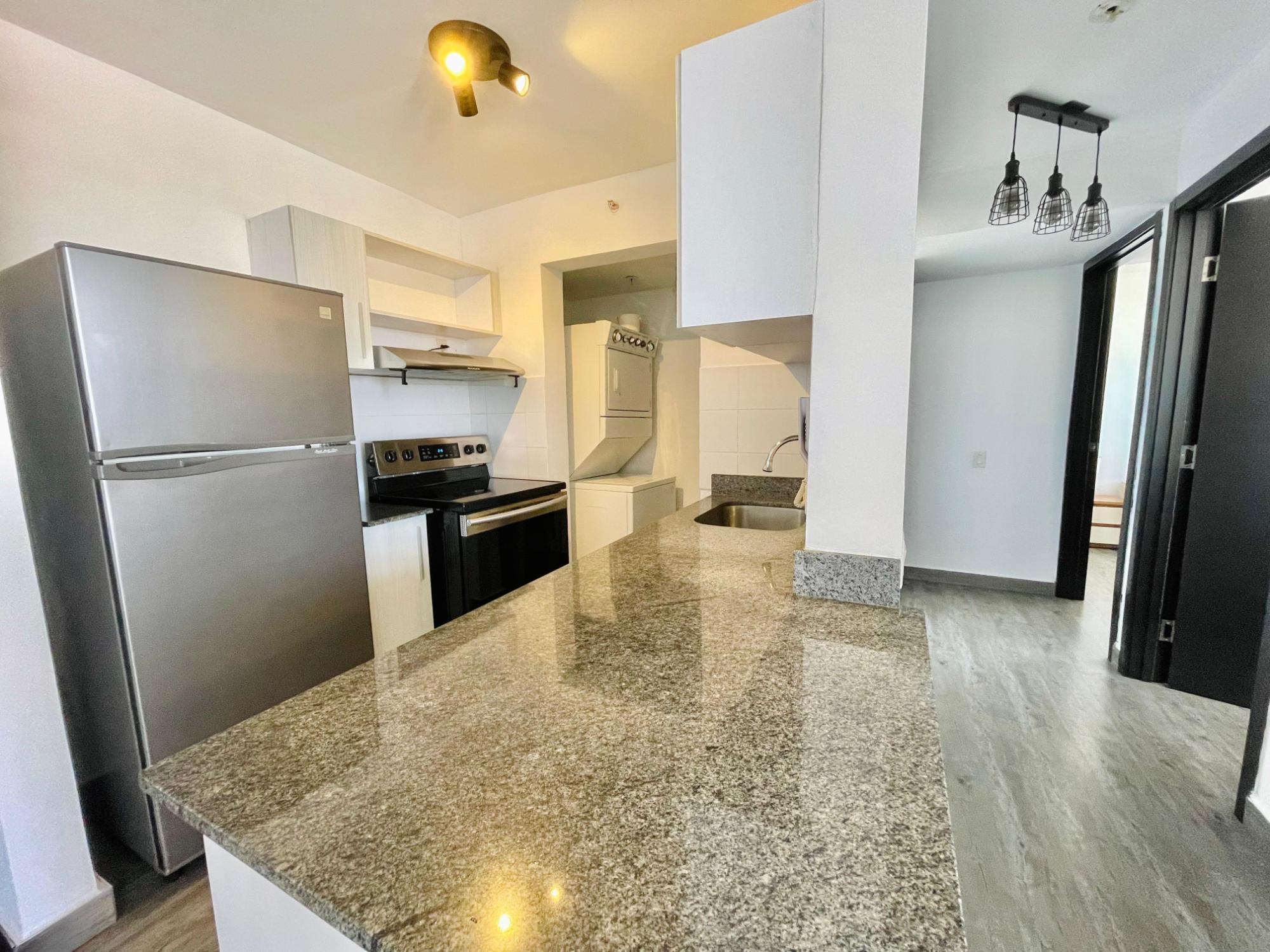 Furnished Apartment for Rent in Parque Lefevre - PH Alegría PH Alegría has an excellent strategic location on Vía España, close to supermarkets, pharmacies, bakeries, restaurants and minutes from Costa del Este and San Francisco, due to its different access routes and public transportation. The apartment has: 66m2, 2 bedrooms, 2 full bathrooms, 1 parking, White Line, Inverter air conditioners, Open kitchen with granite countertops, Modern furniture, Lamps and blinds, Remodeled, Balcony. The building has a social area, party room, gym, swimming pool, playground, lobby, power plant, water tank, power plant, visitor parking and 24 hour security.