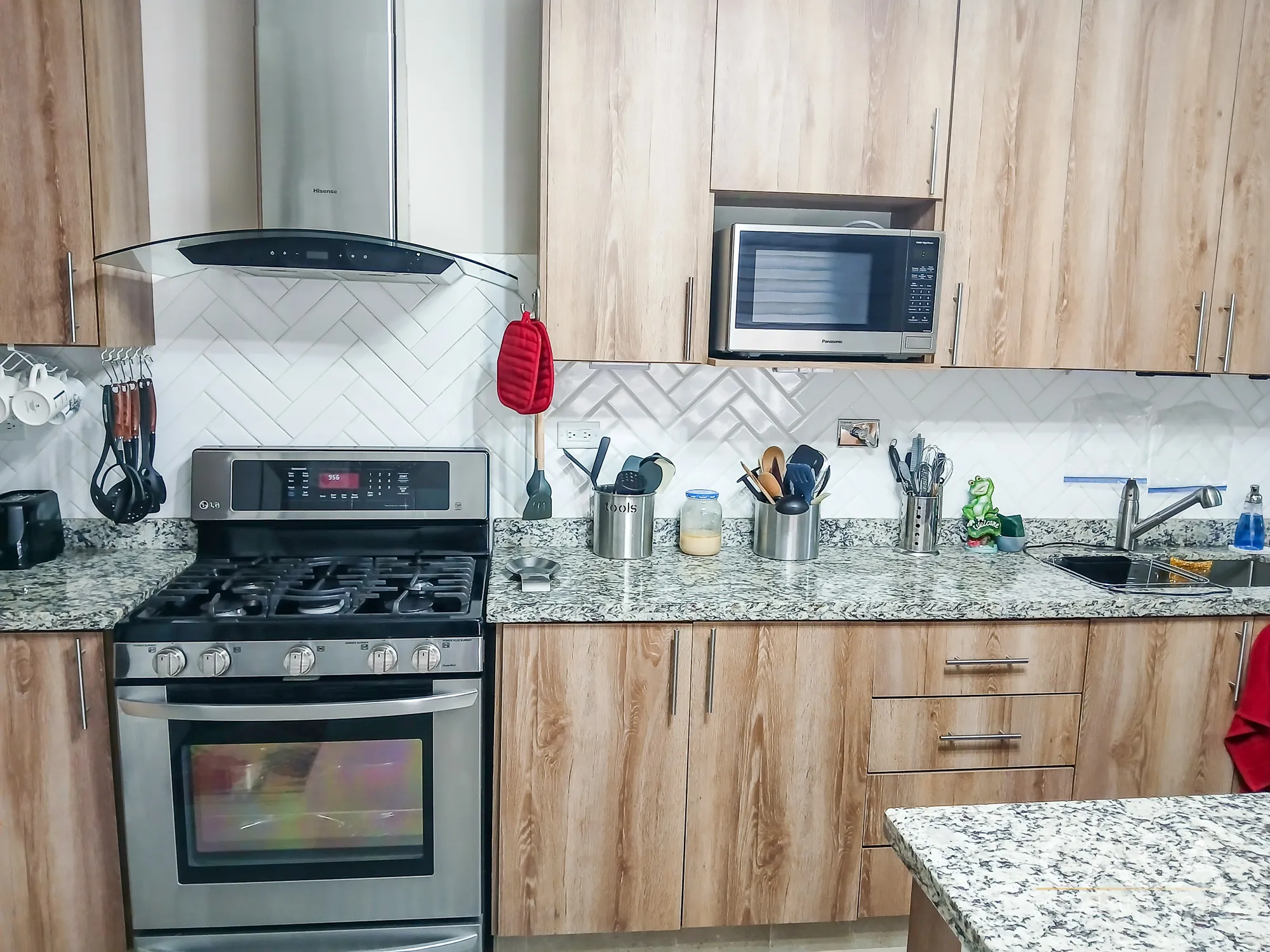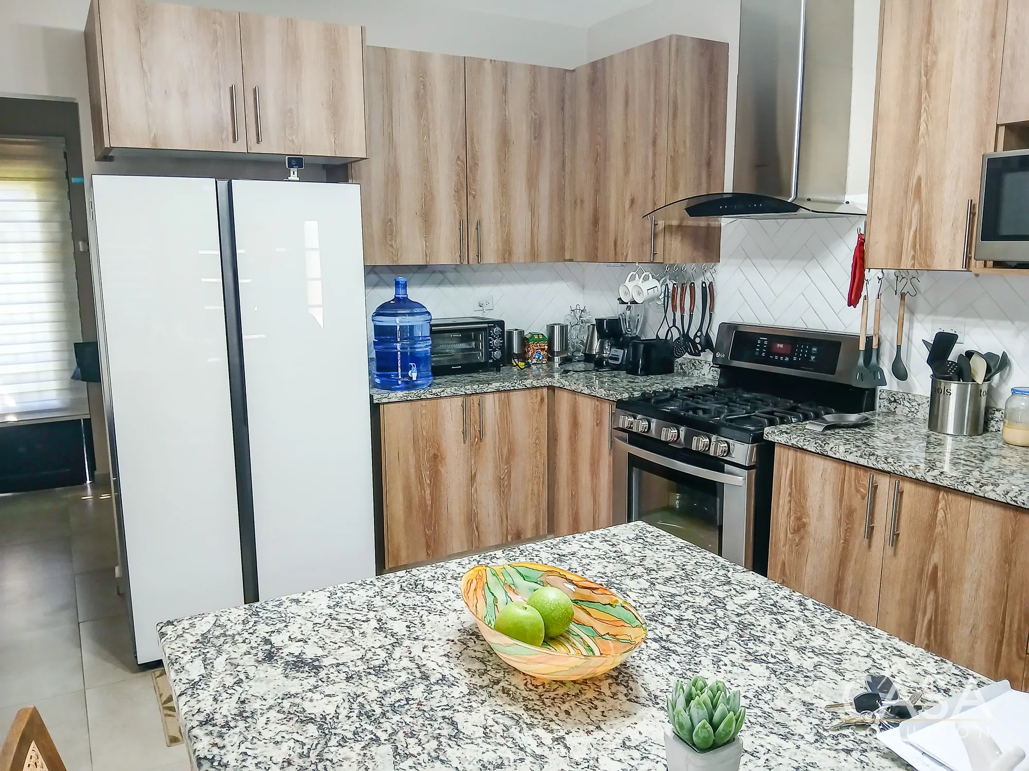 The kitchen includes a stove, refrigerator, microwave, extractor, washer, and dryer, all already installed and ready for use. The setup allows the kitchen to function immediately without the need for upgrades or additional installation.