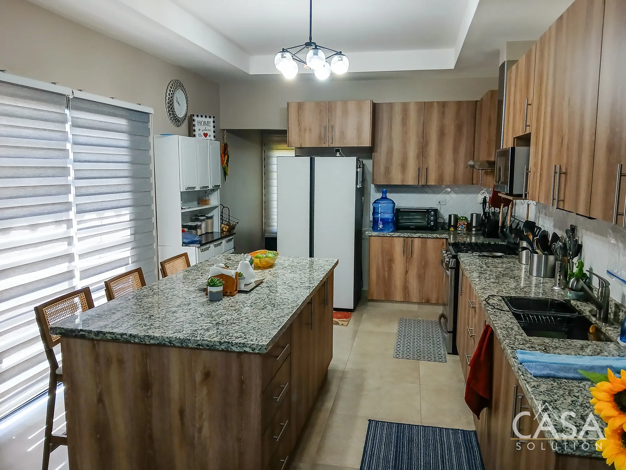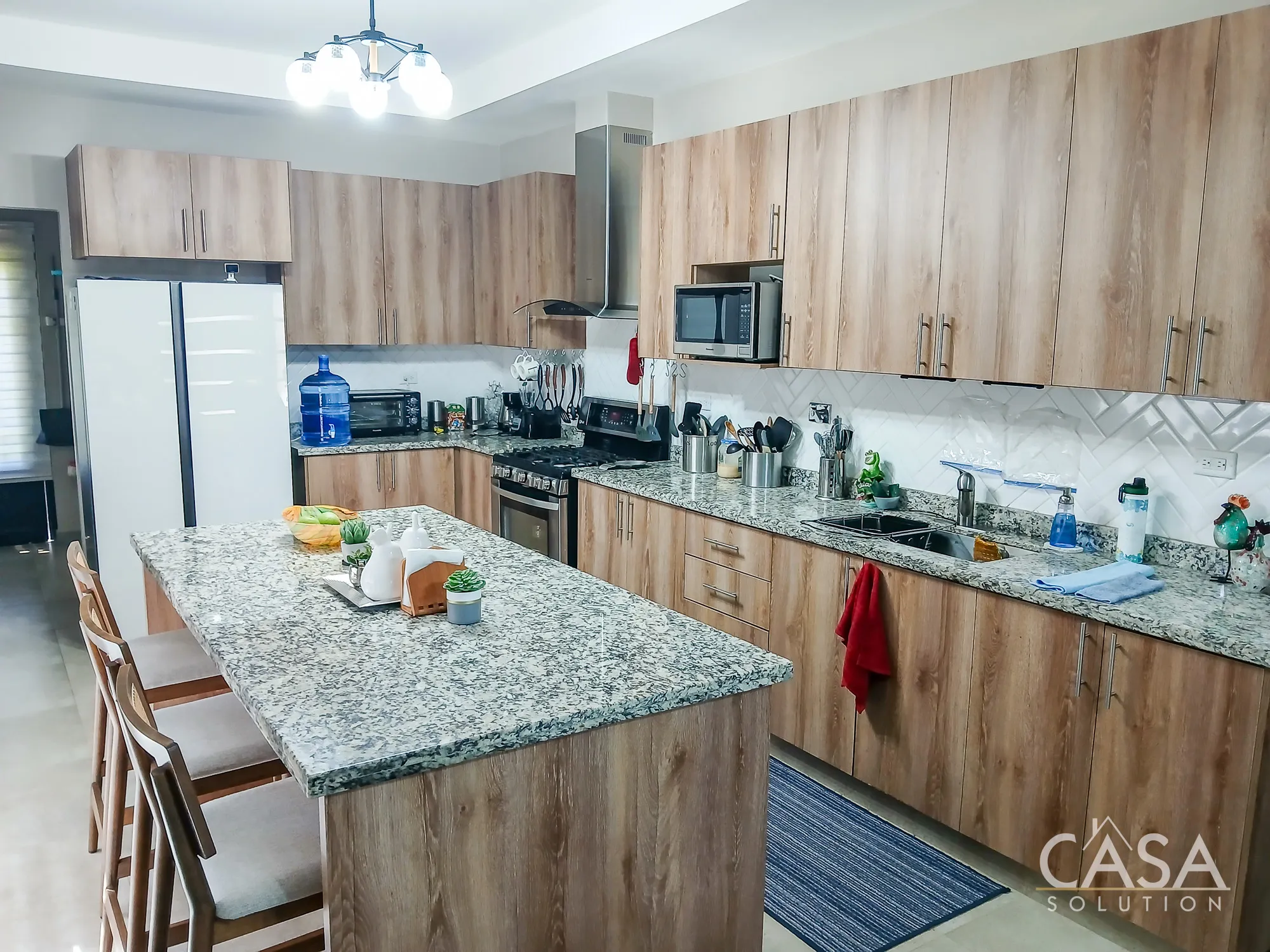 The kitchen includes granite countertops, full cabinetry, and a central island that provides additional workspace and storage.