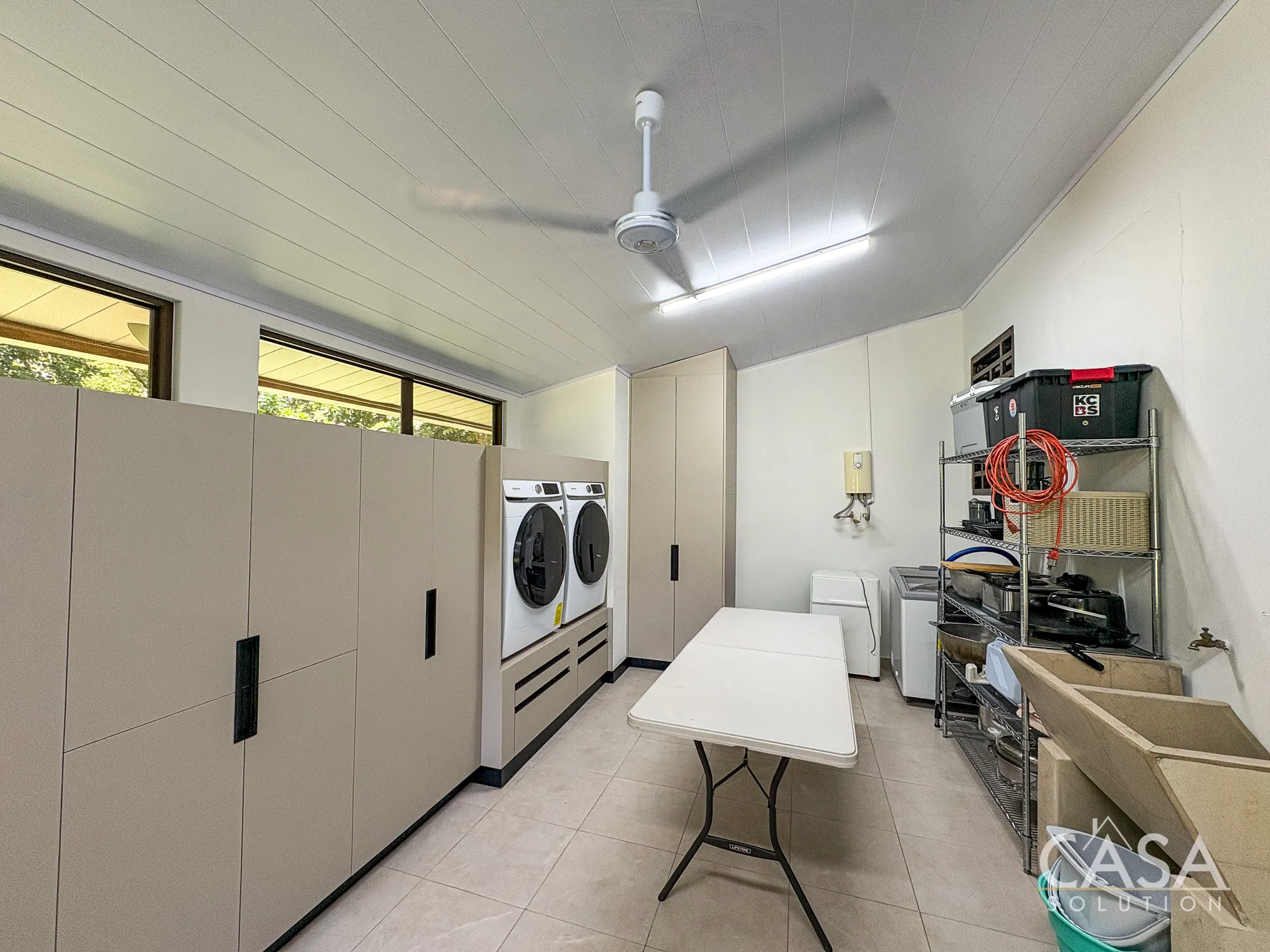 A dedicated laundry room, along with a service room and full bathroom, adds practicality for long-term living.