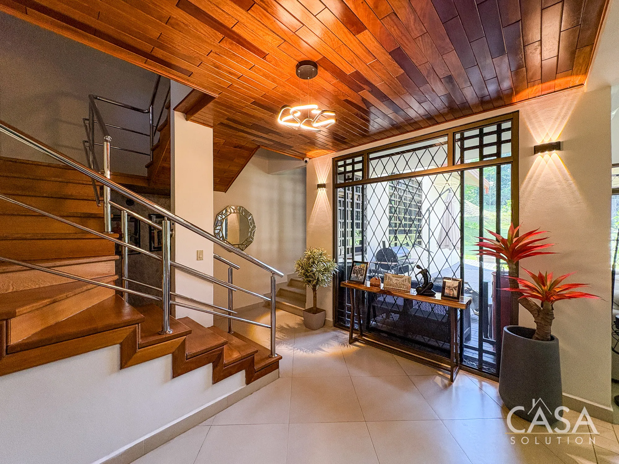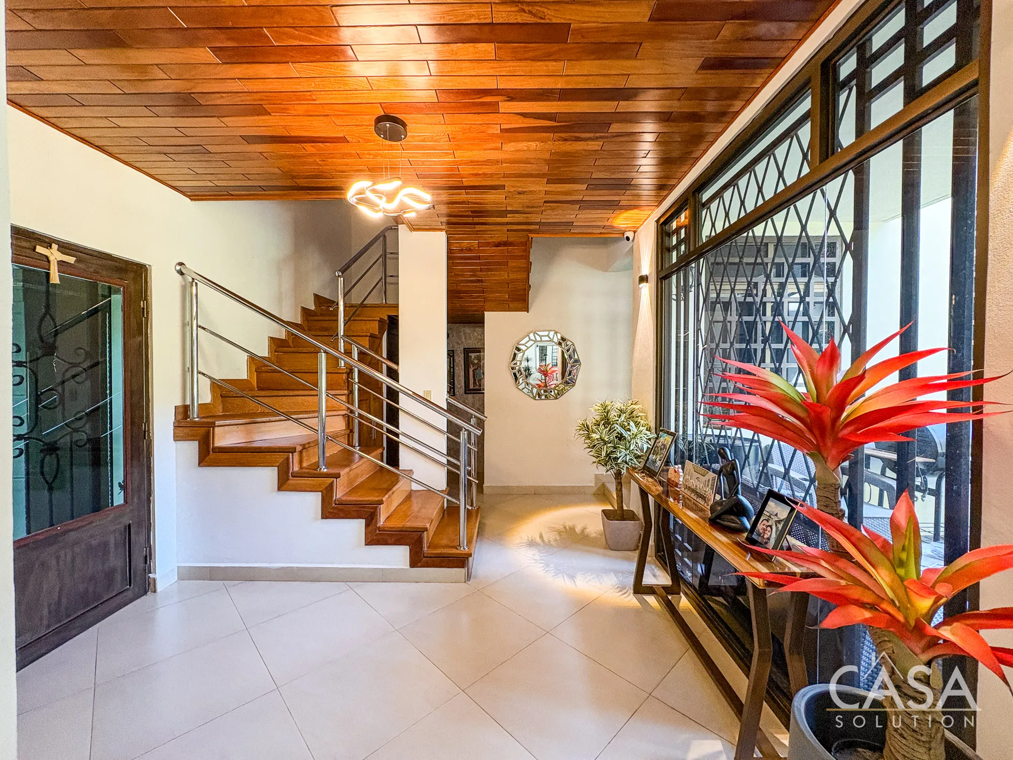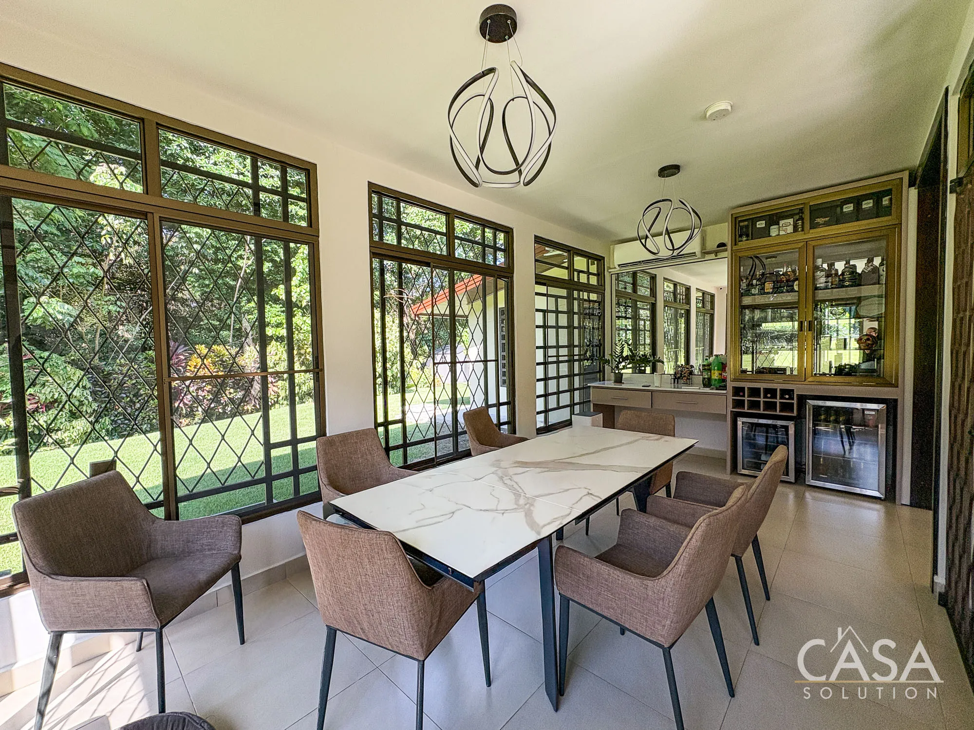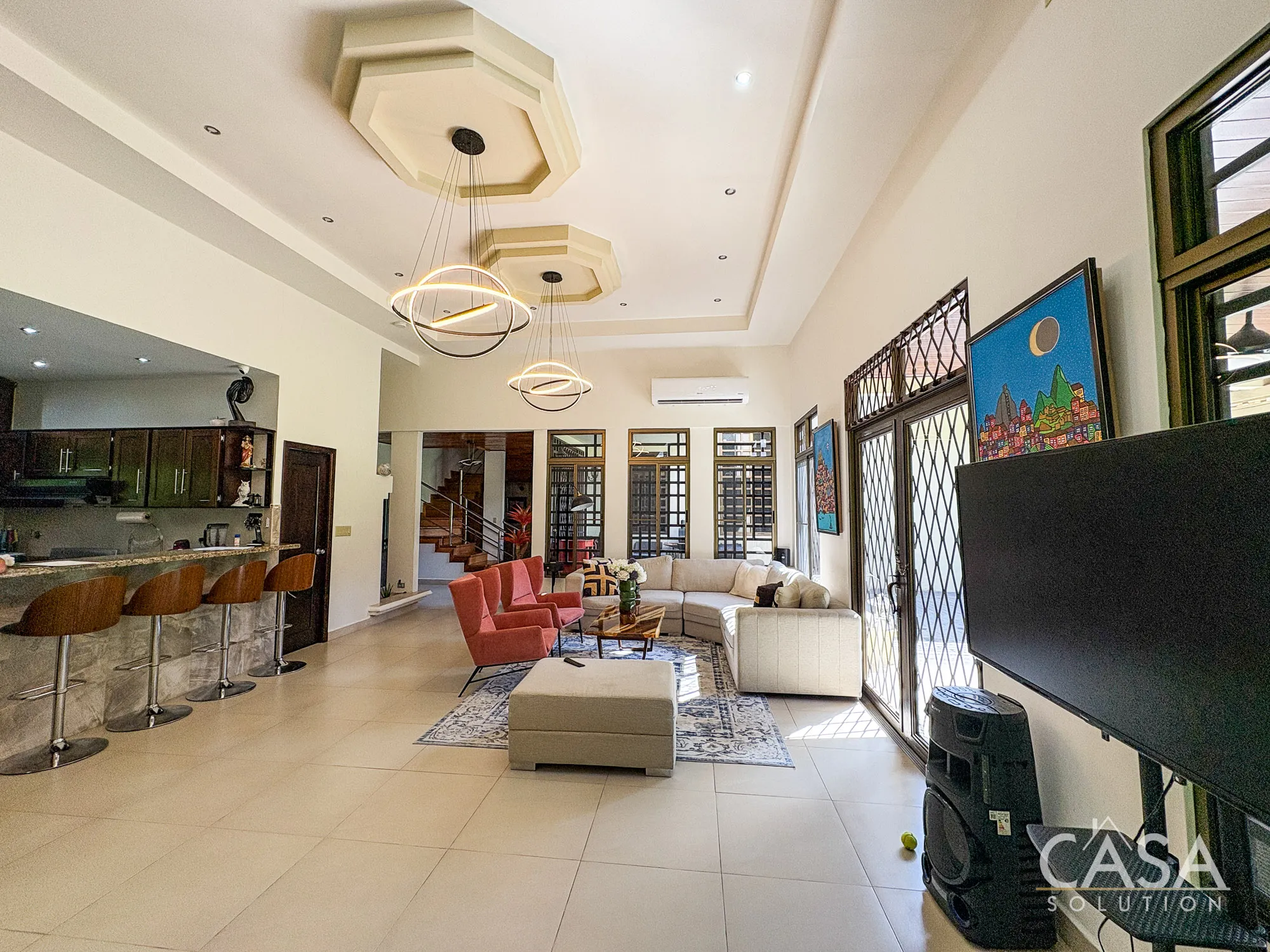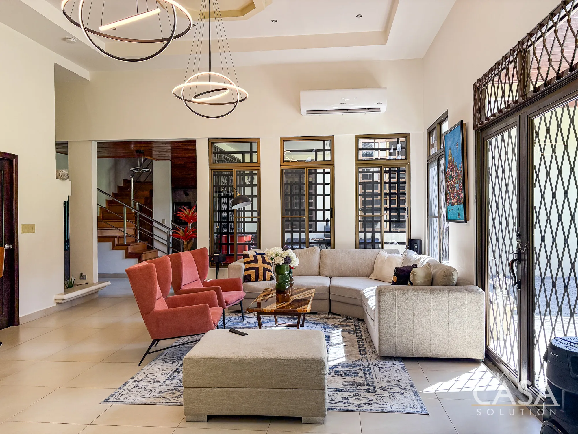 From the moment you enter, the scale of the home is noticeable. The main living area features double-height ceilings and large windows that bring in natural light and connect directly to the garden.