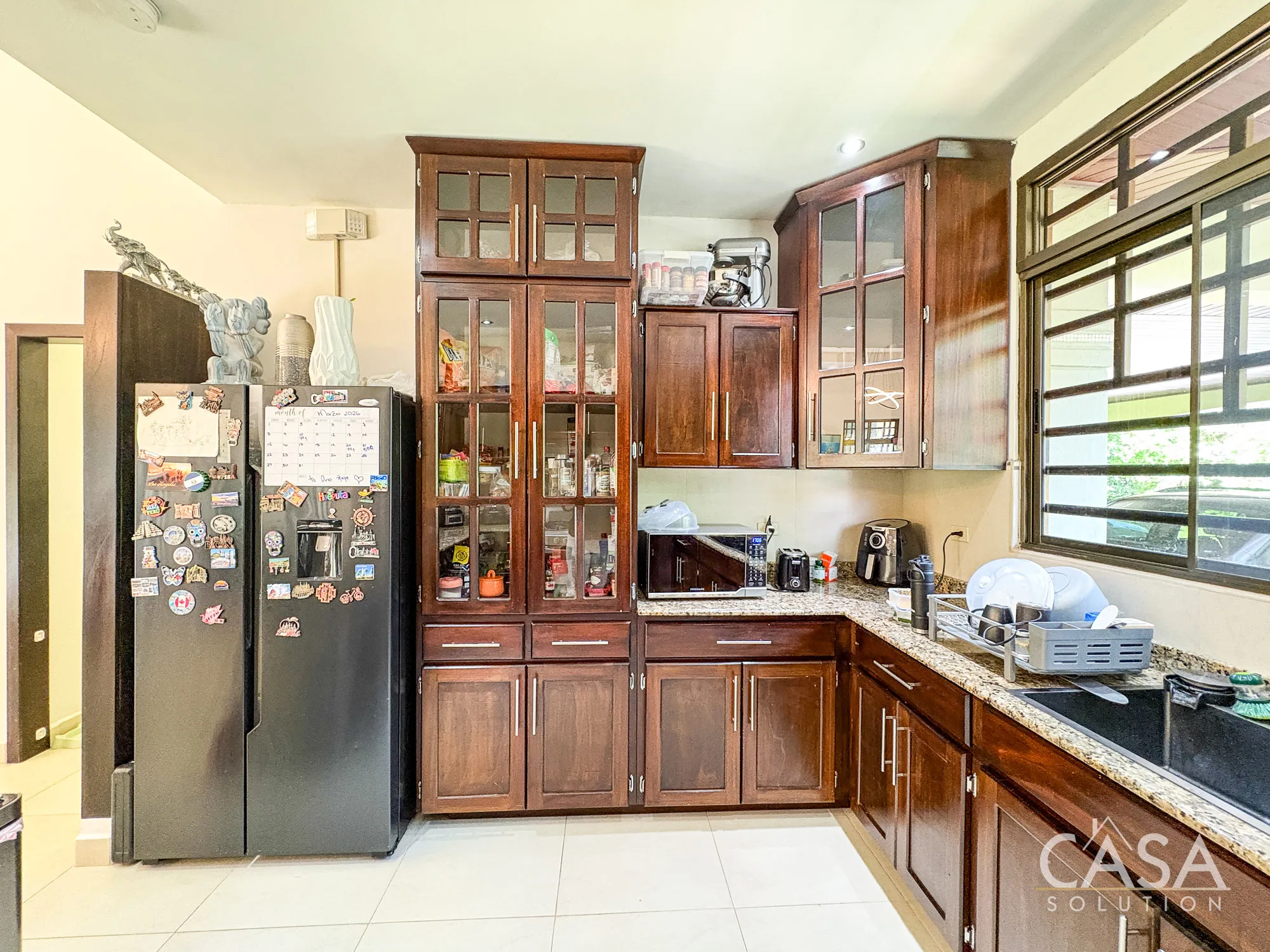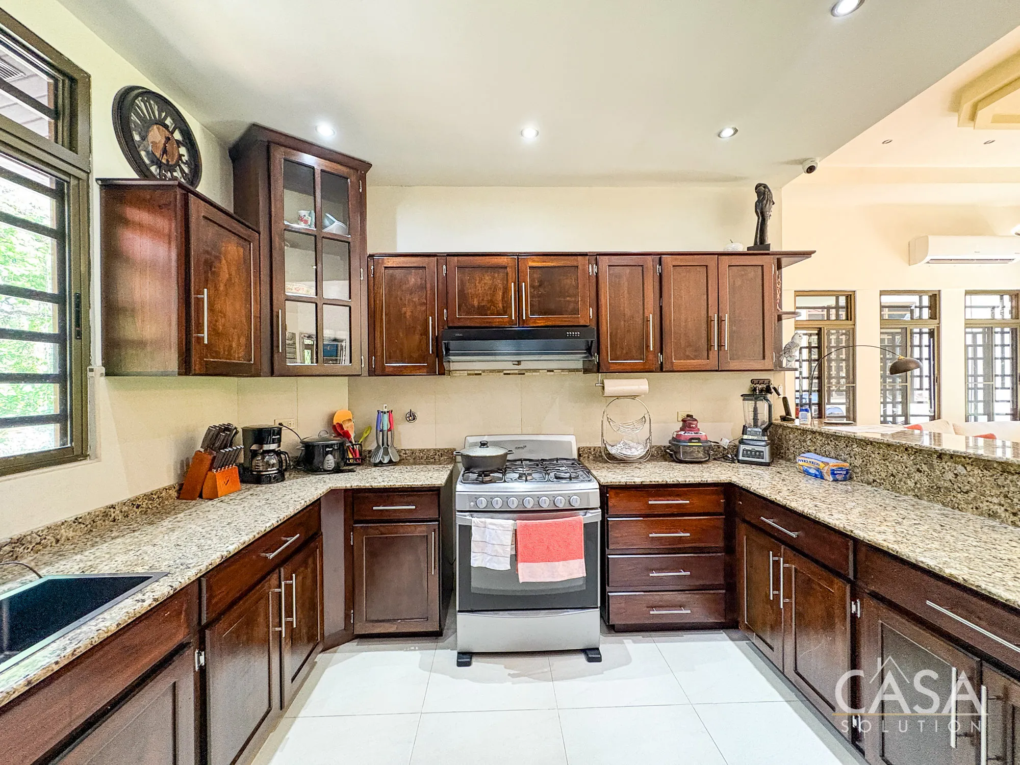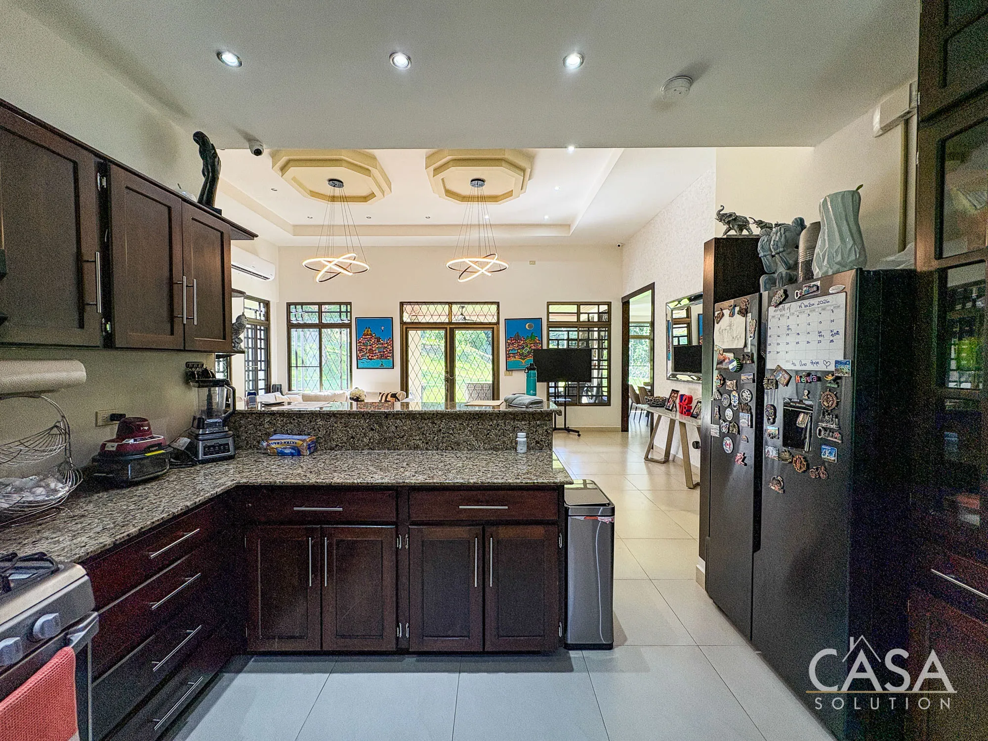 The kitchen is well distributed with ample cabinetry and counter space, connected directly to the social areas.