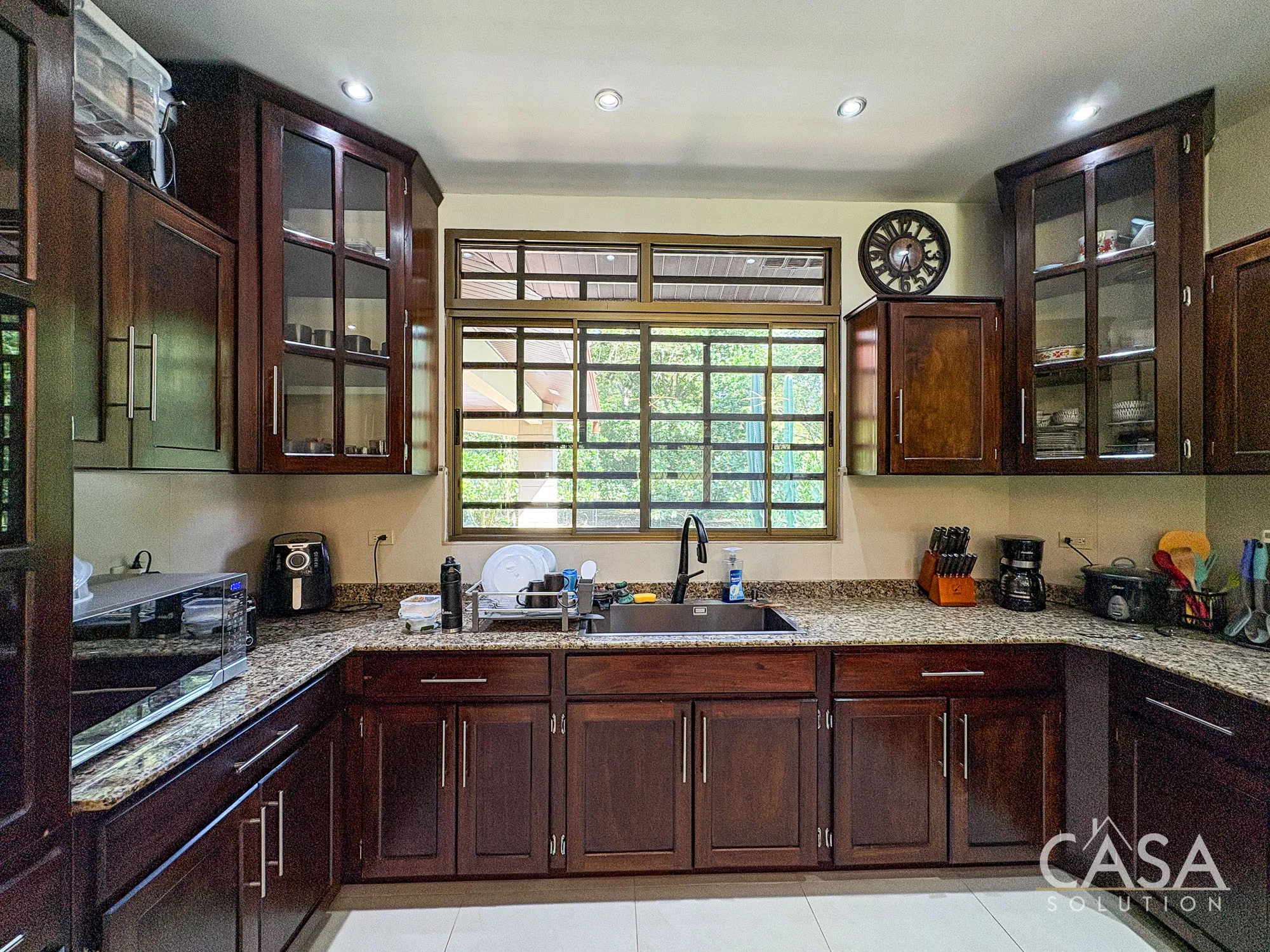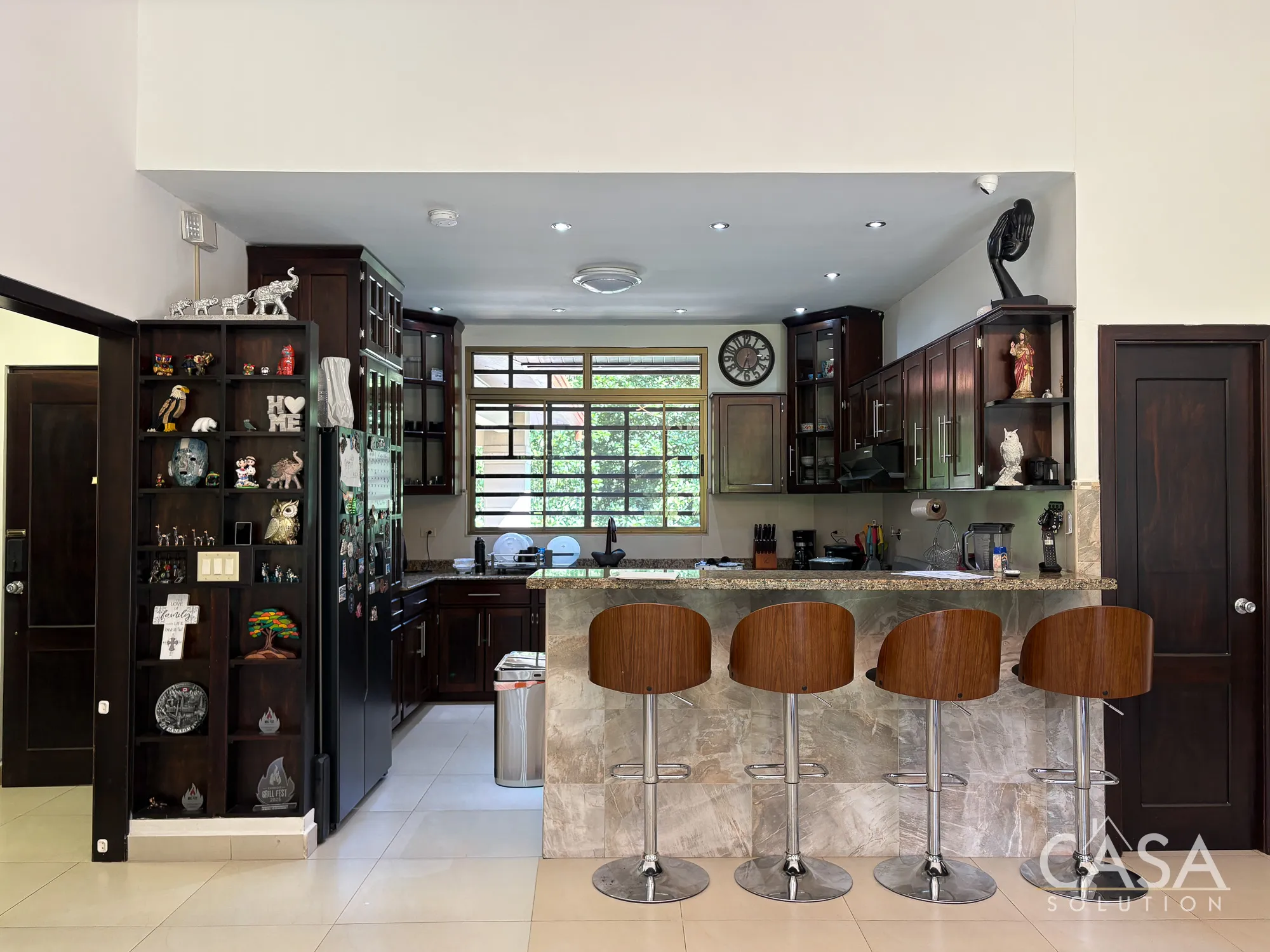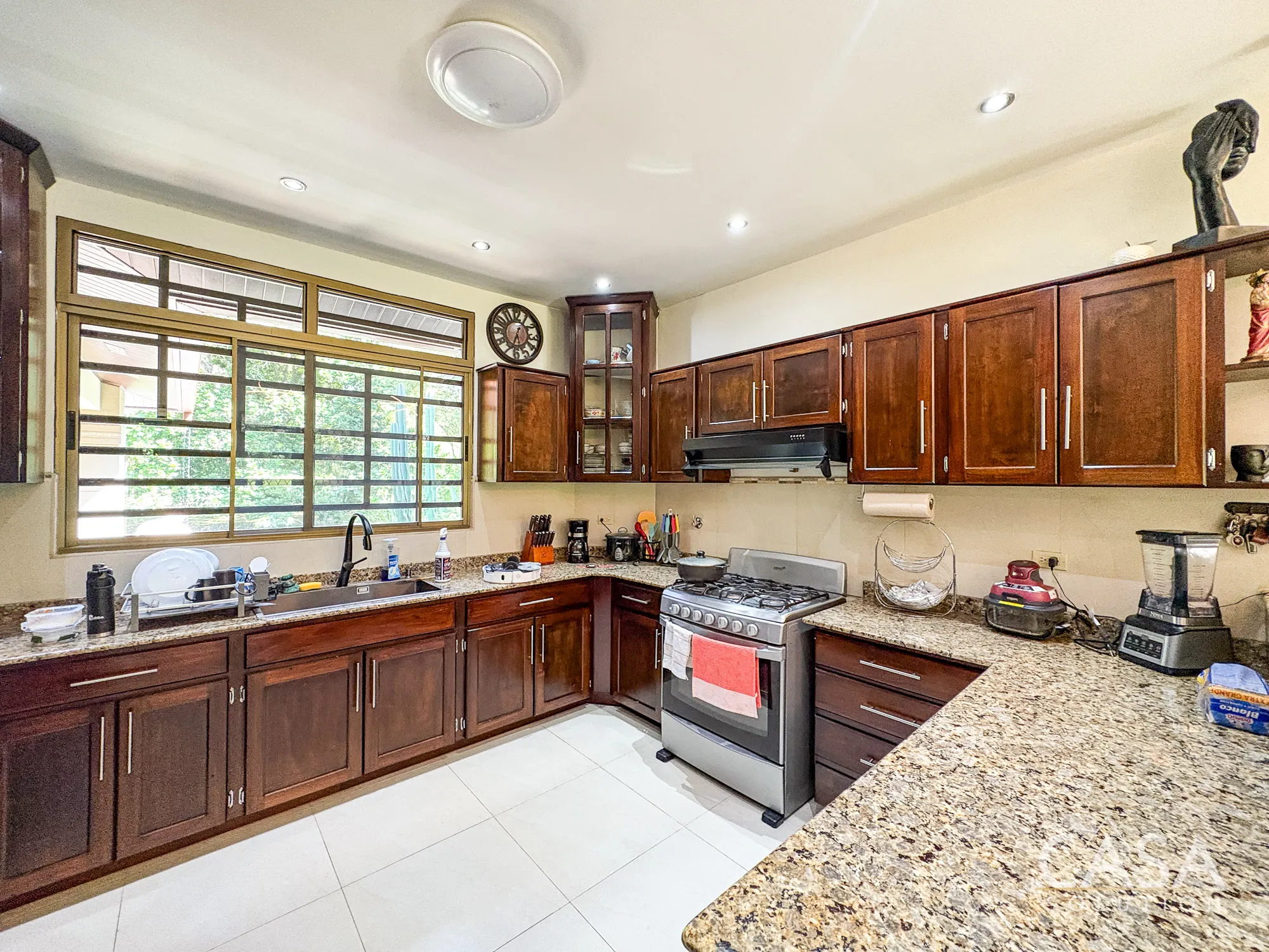 The kitchen is well distributed with ample cabinetry and counter space, connected directly to the social areas.