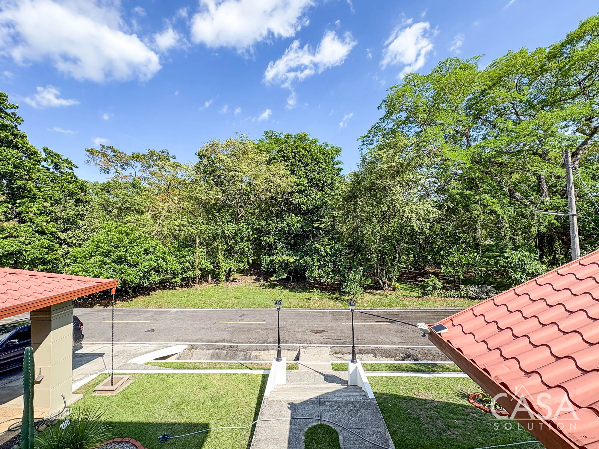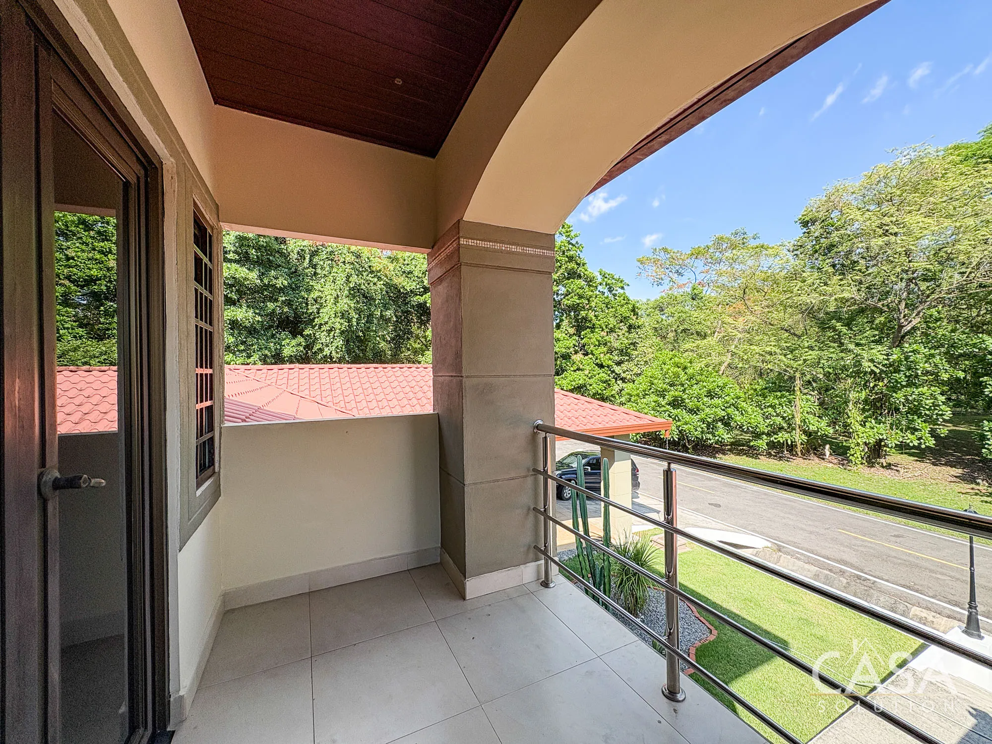 An upper-level balcony provides an additional outdoor space overlooking the street and surrounding greenery.