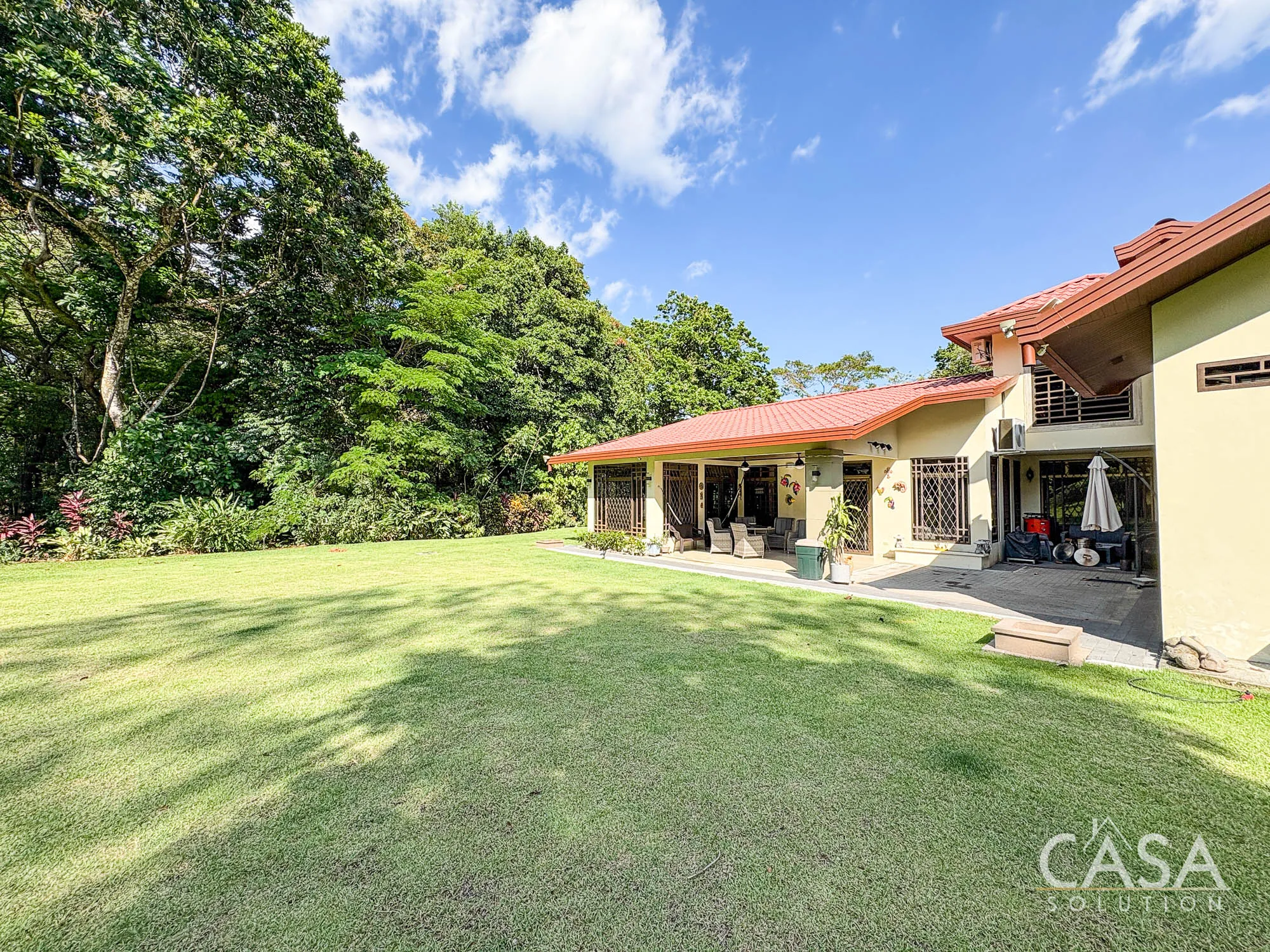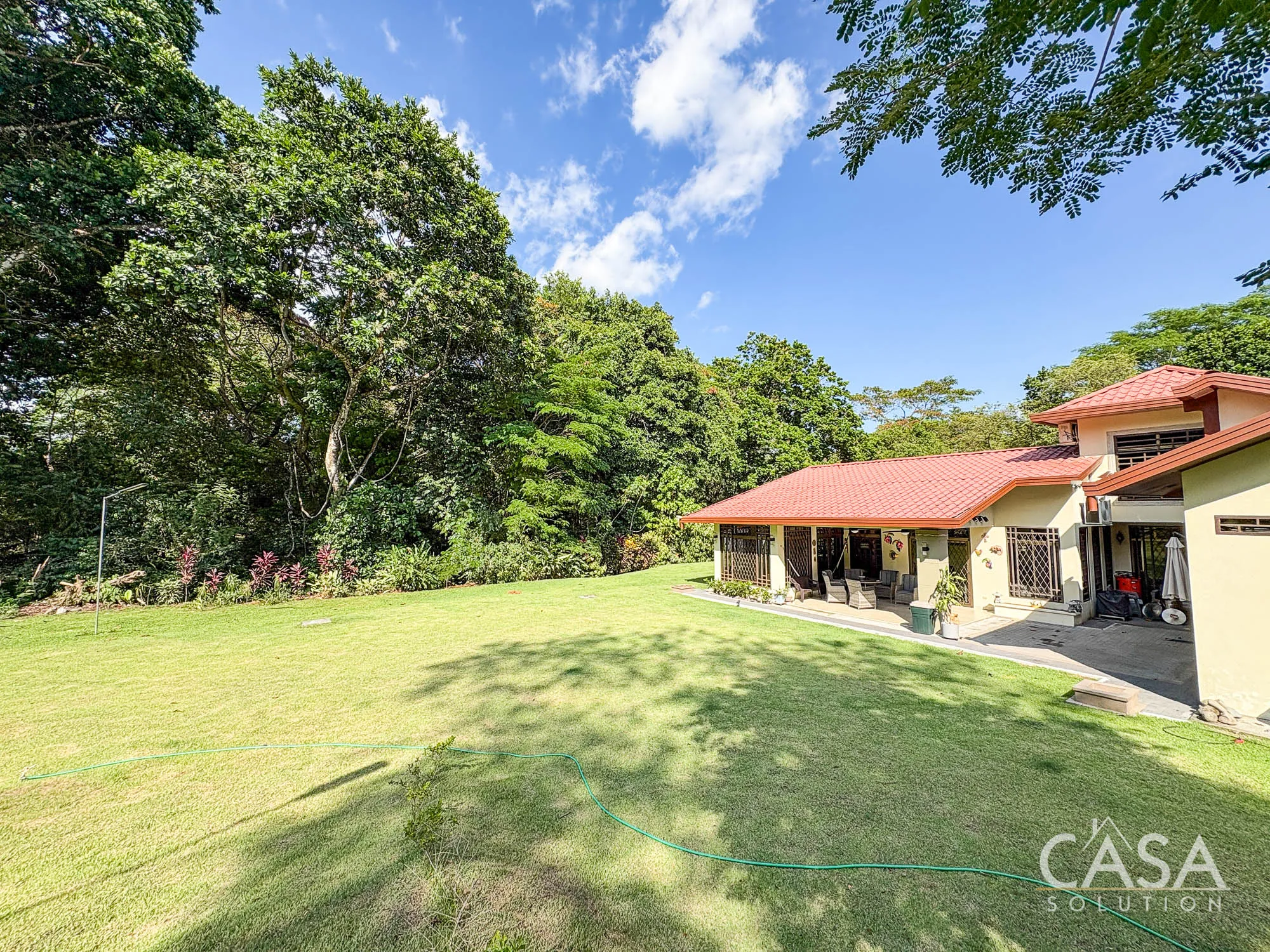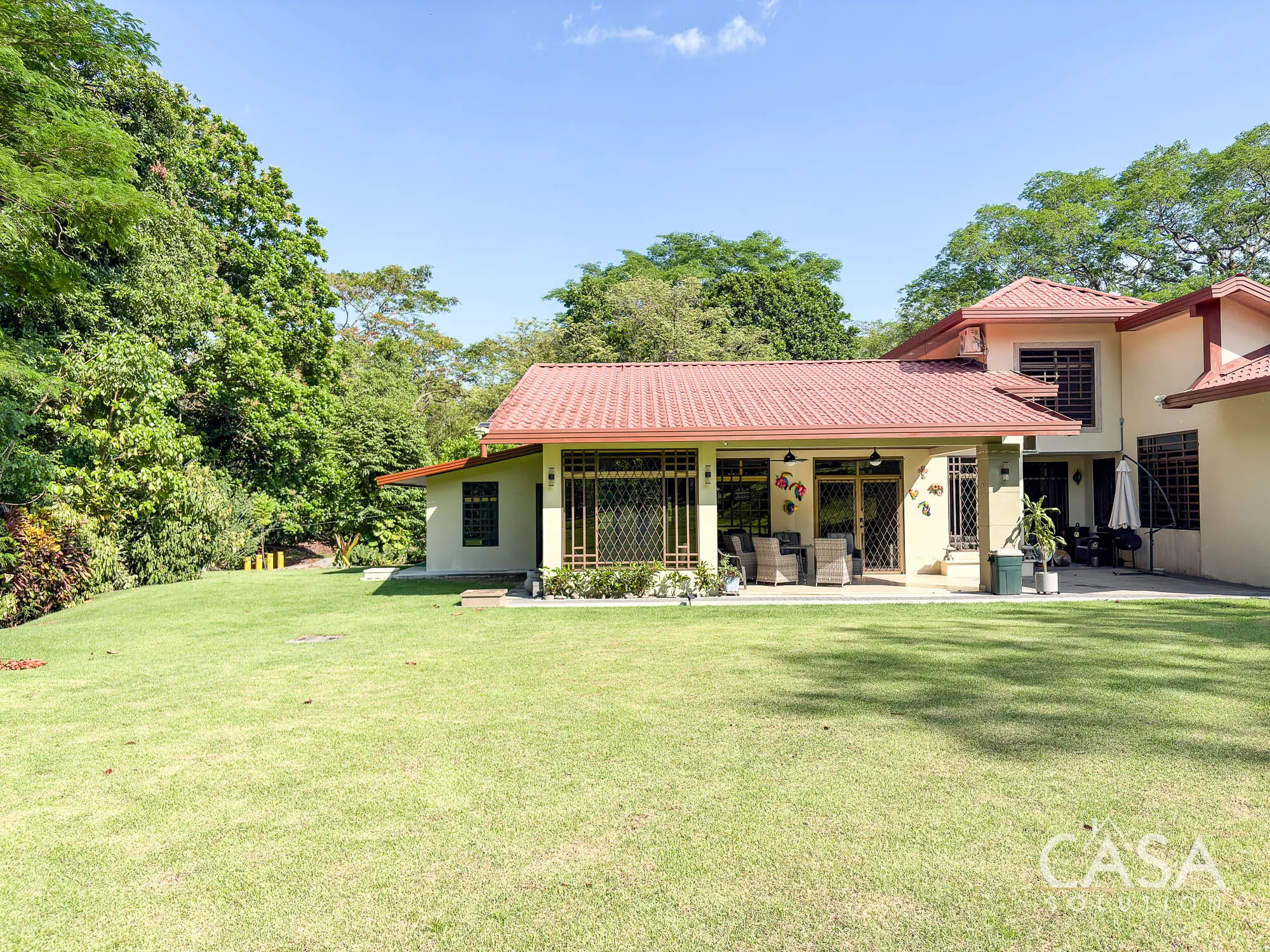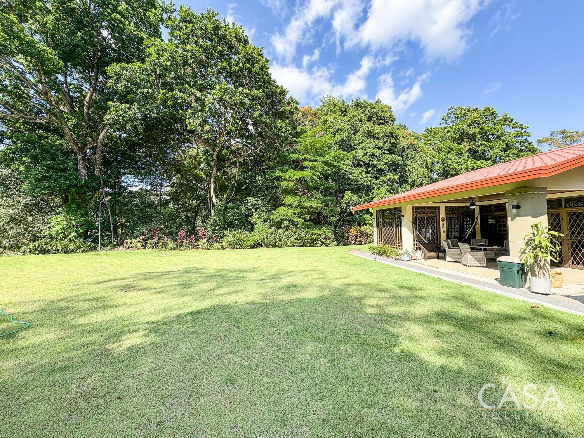 The covered terrace connects directly to the garden, creating a space that naturally extends the living area outdoors. The size of the lot allows for privacy while still maintaining an open feel.
