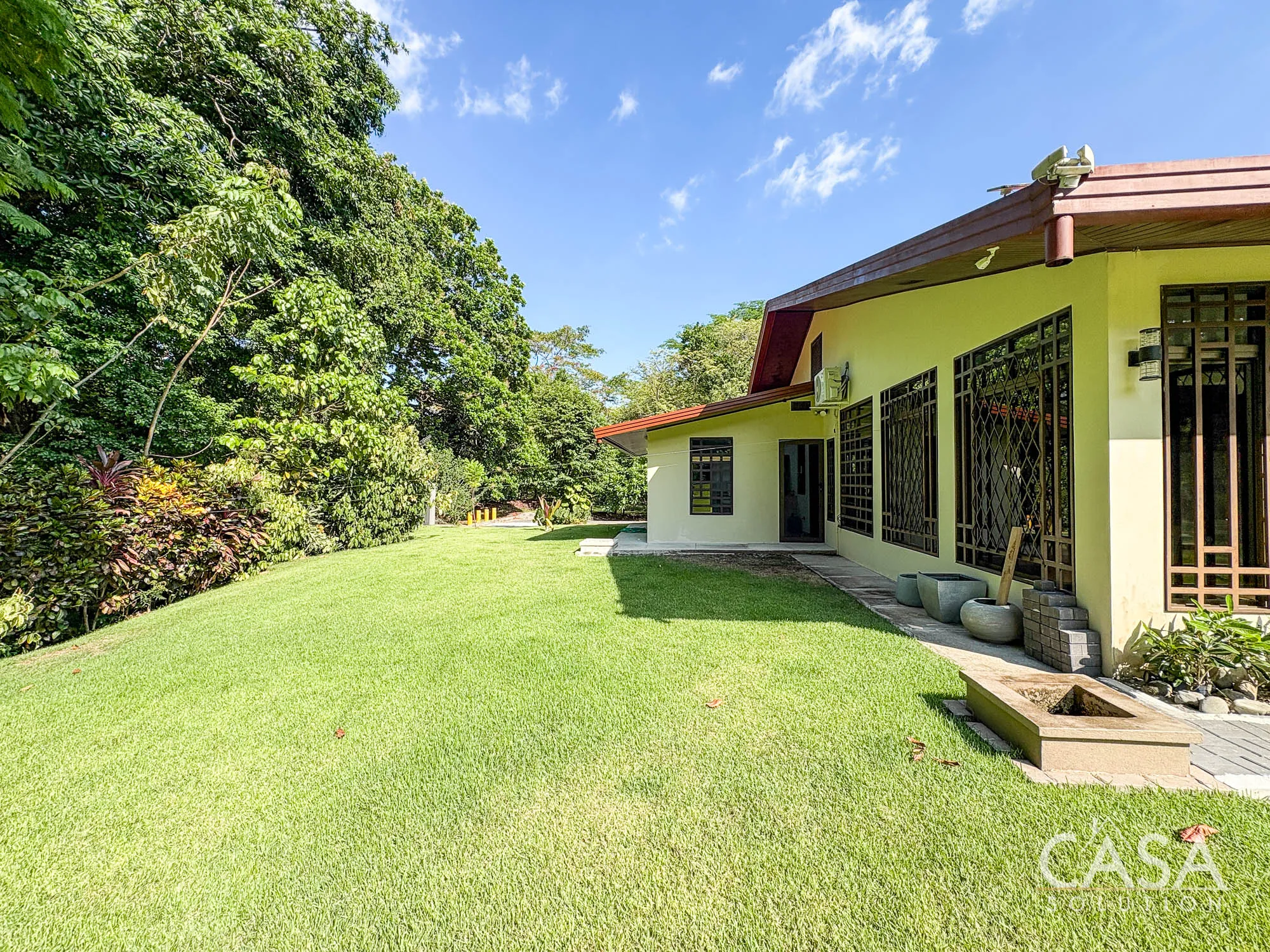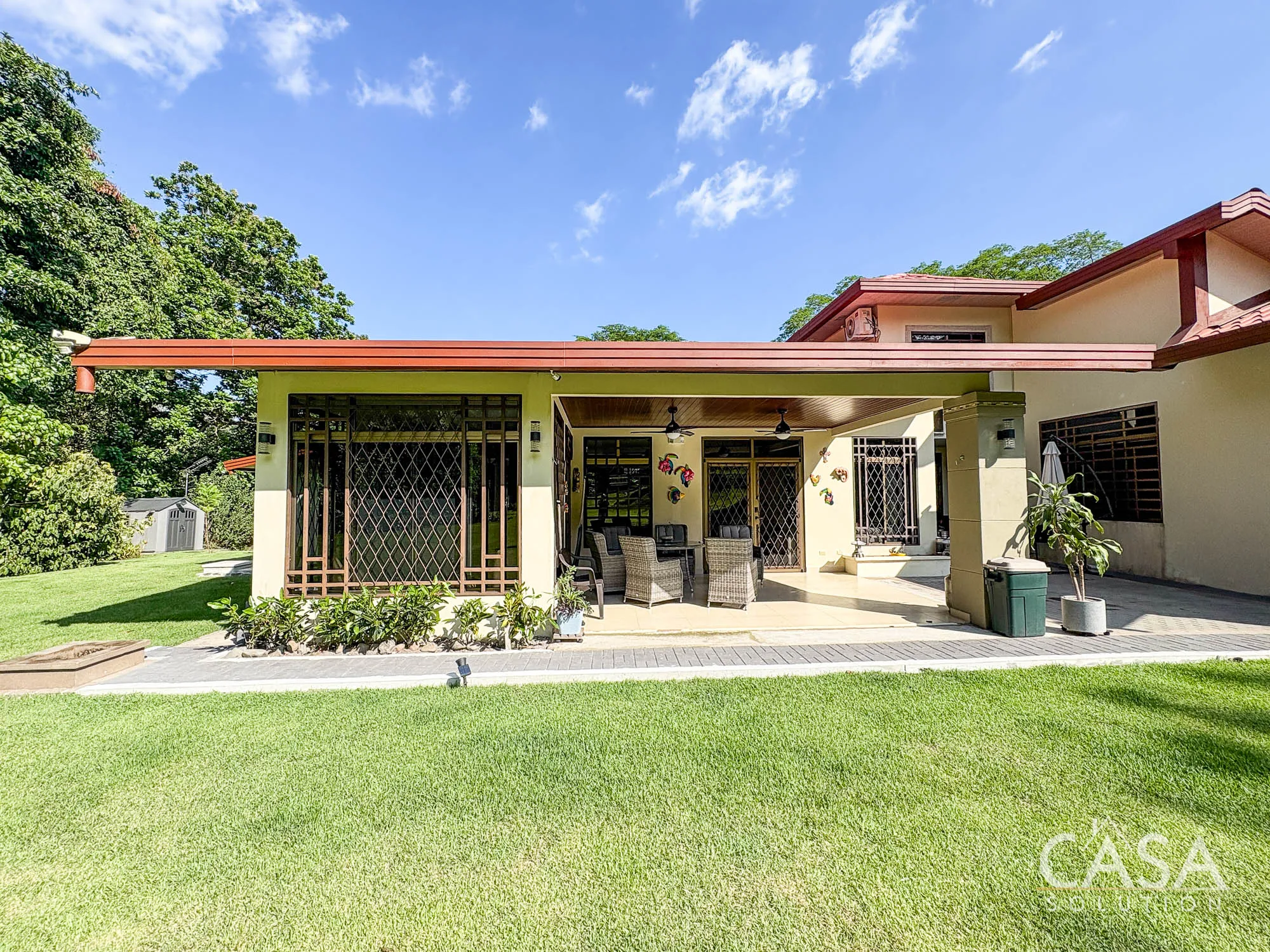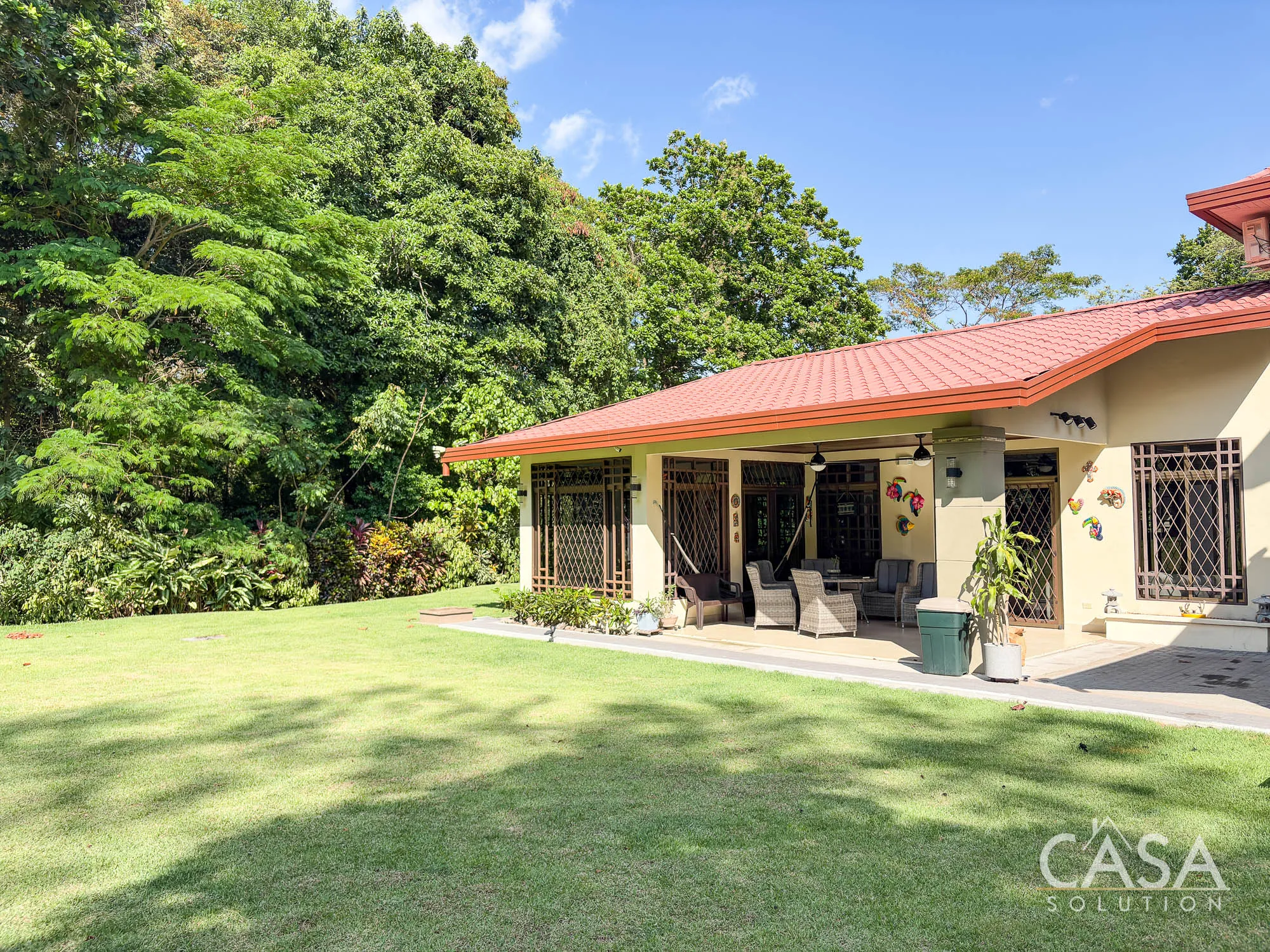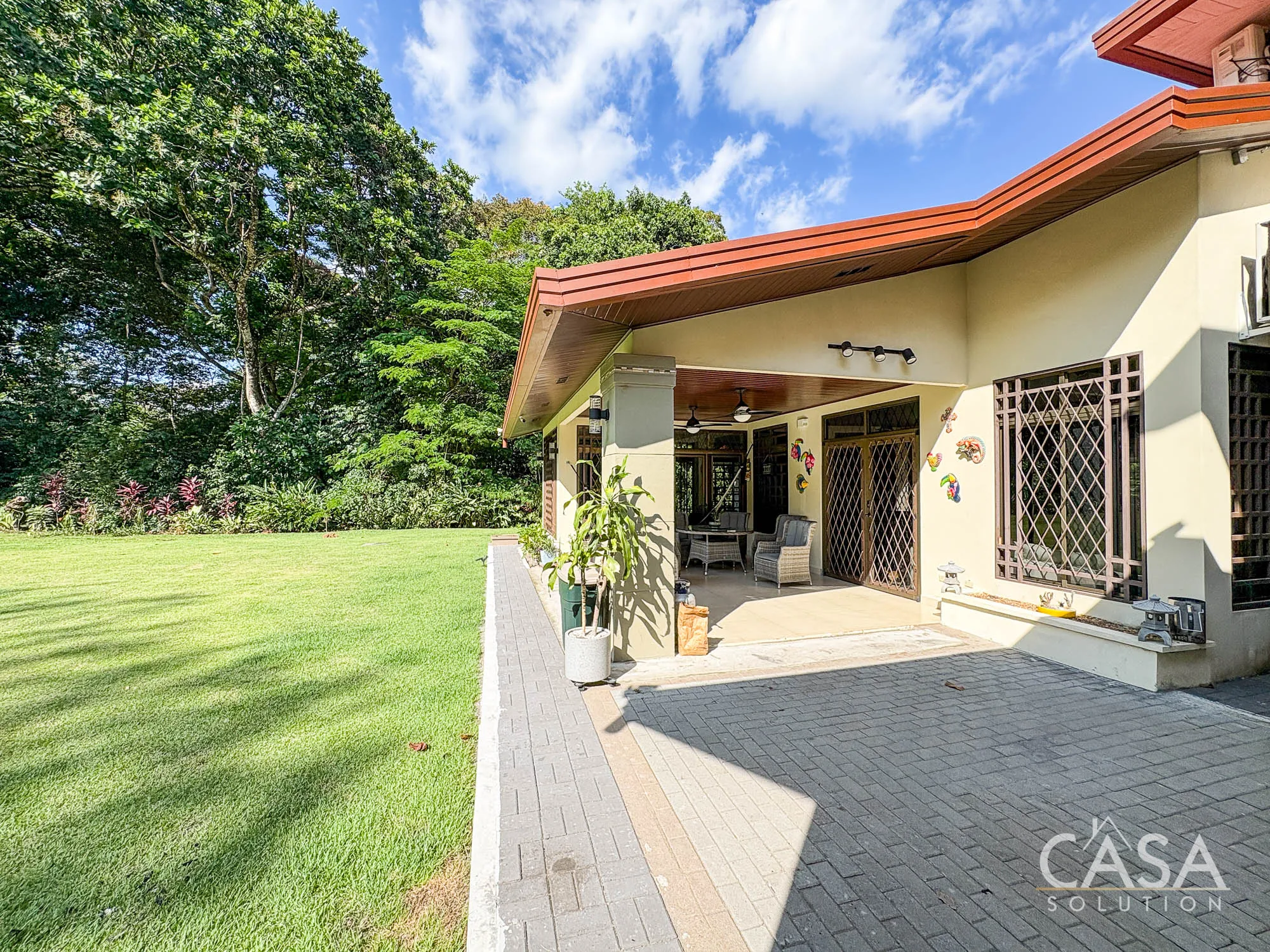 The covered terrace connects directly to the garden, creating a space that naturally extends the living area outdoors. The size of the lot allows for privacy while still maintaining an open feel.