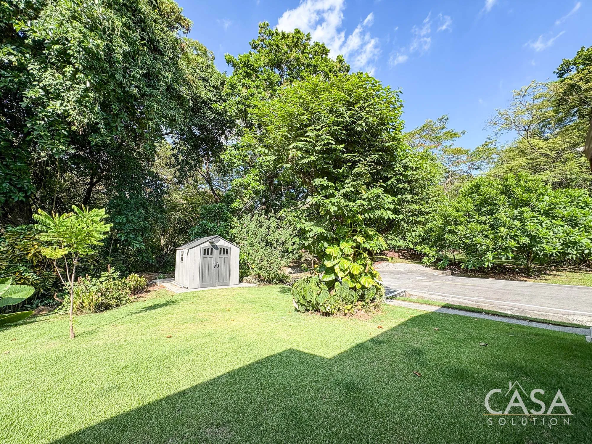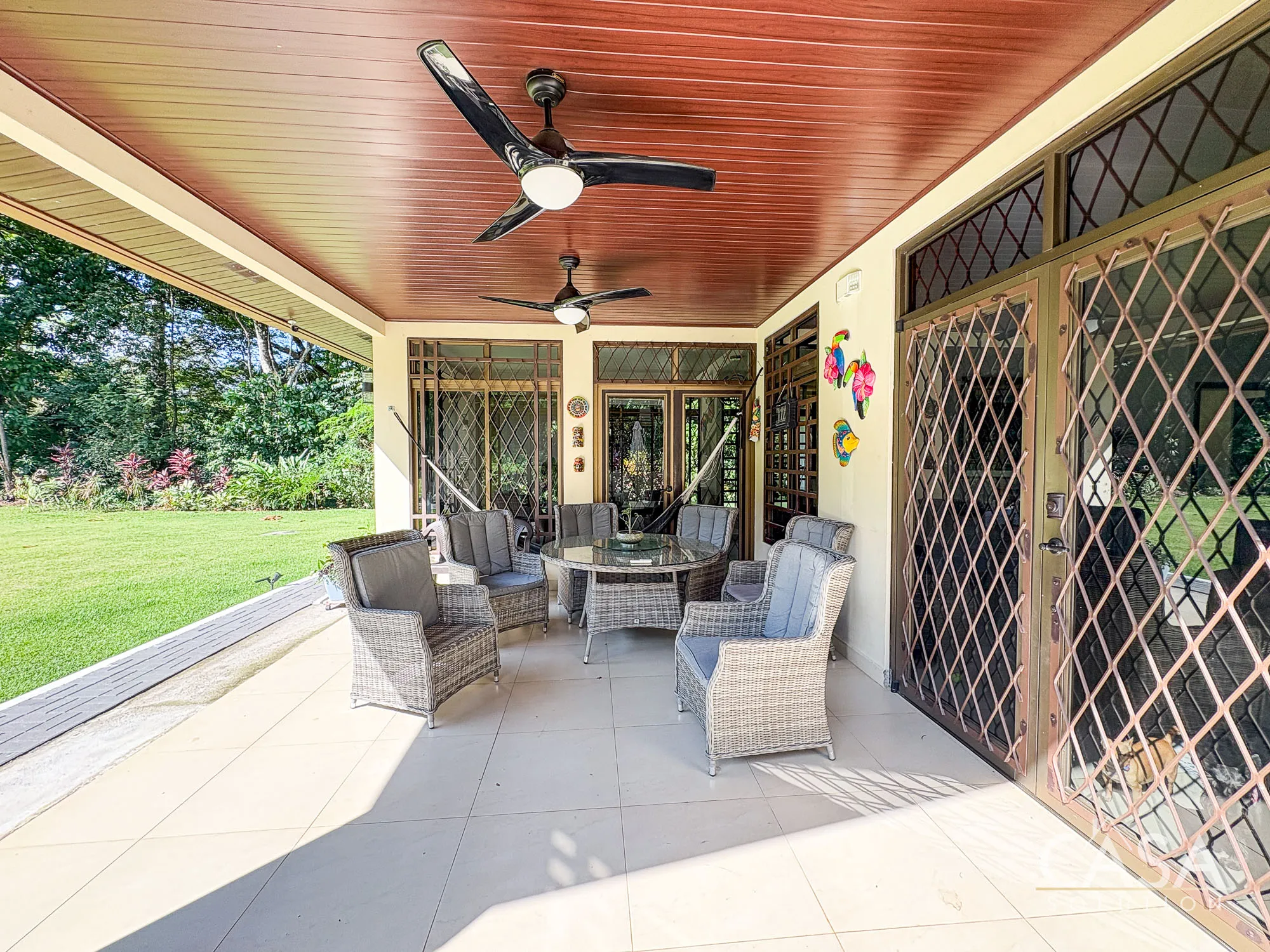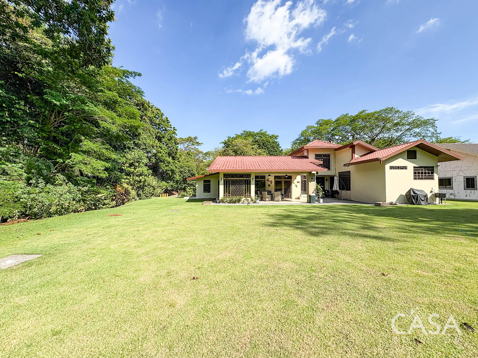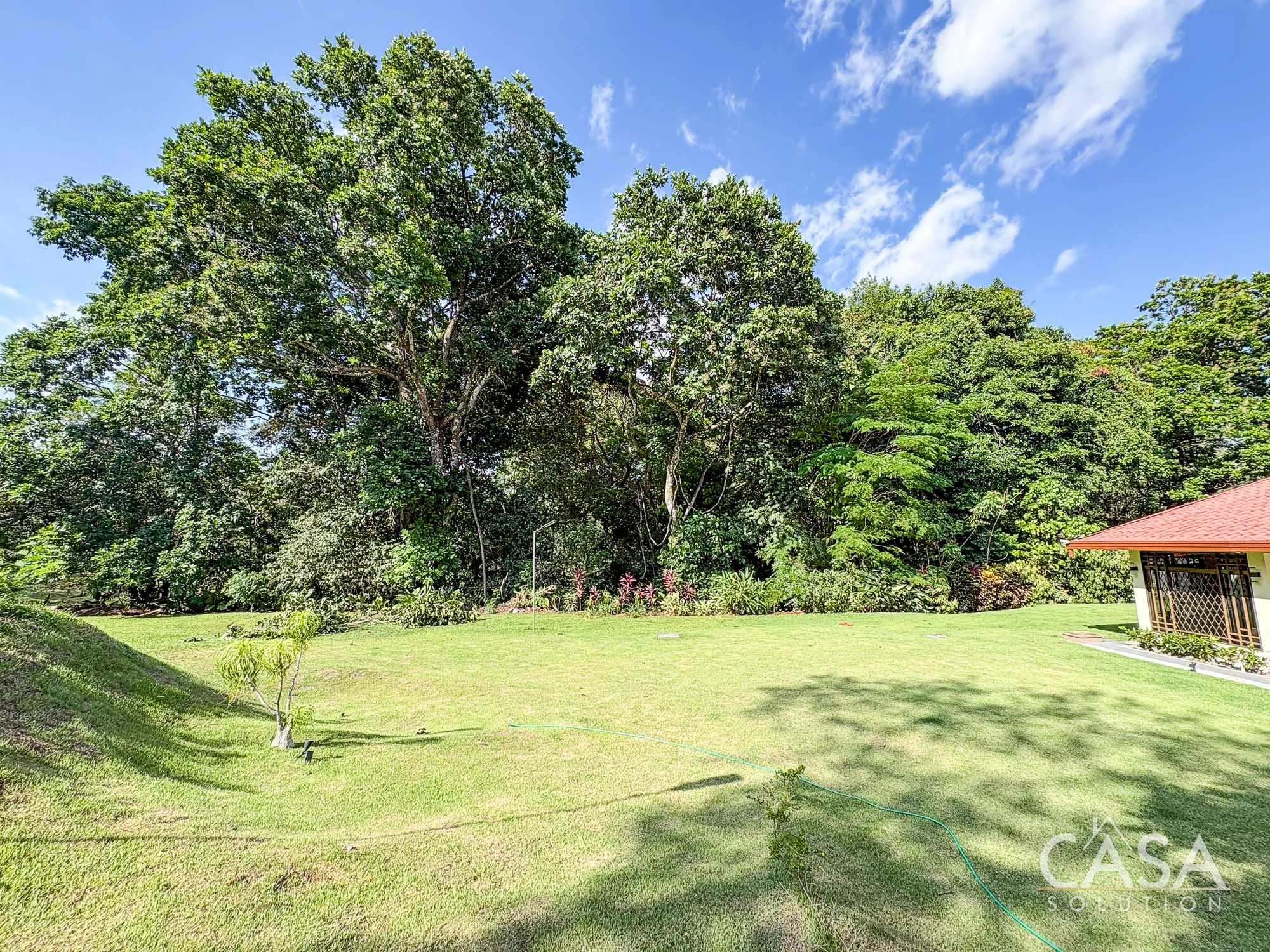 The covered terrace connects directly to the garden, creating a space that naturally extends the living area outdoors. The size of the lot allows for privacy while still maintaining an open feel.
