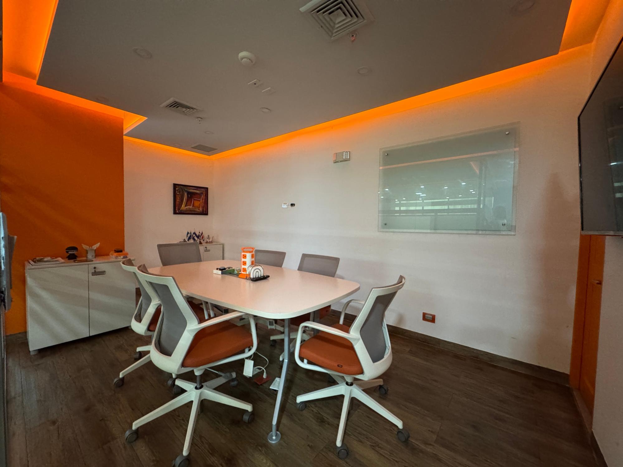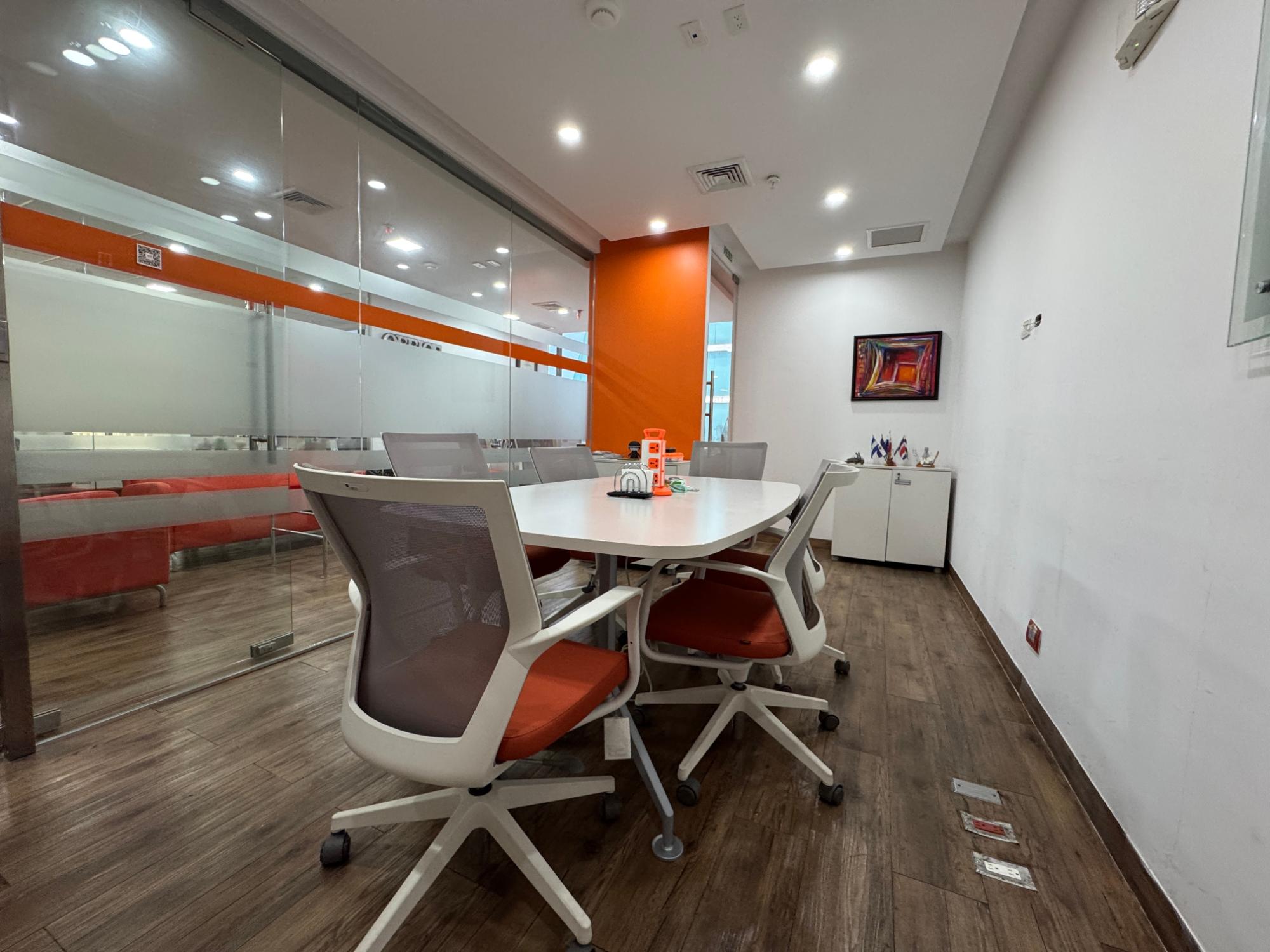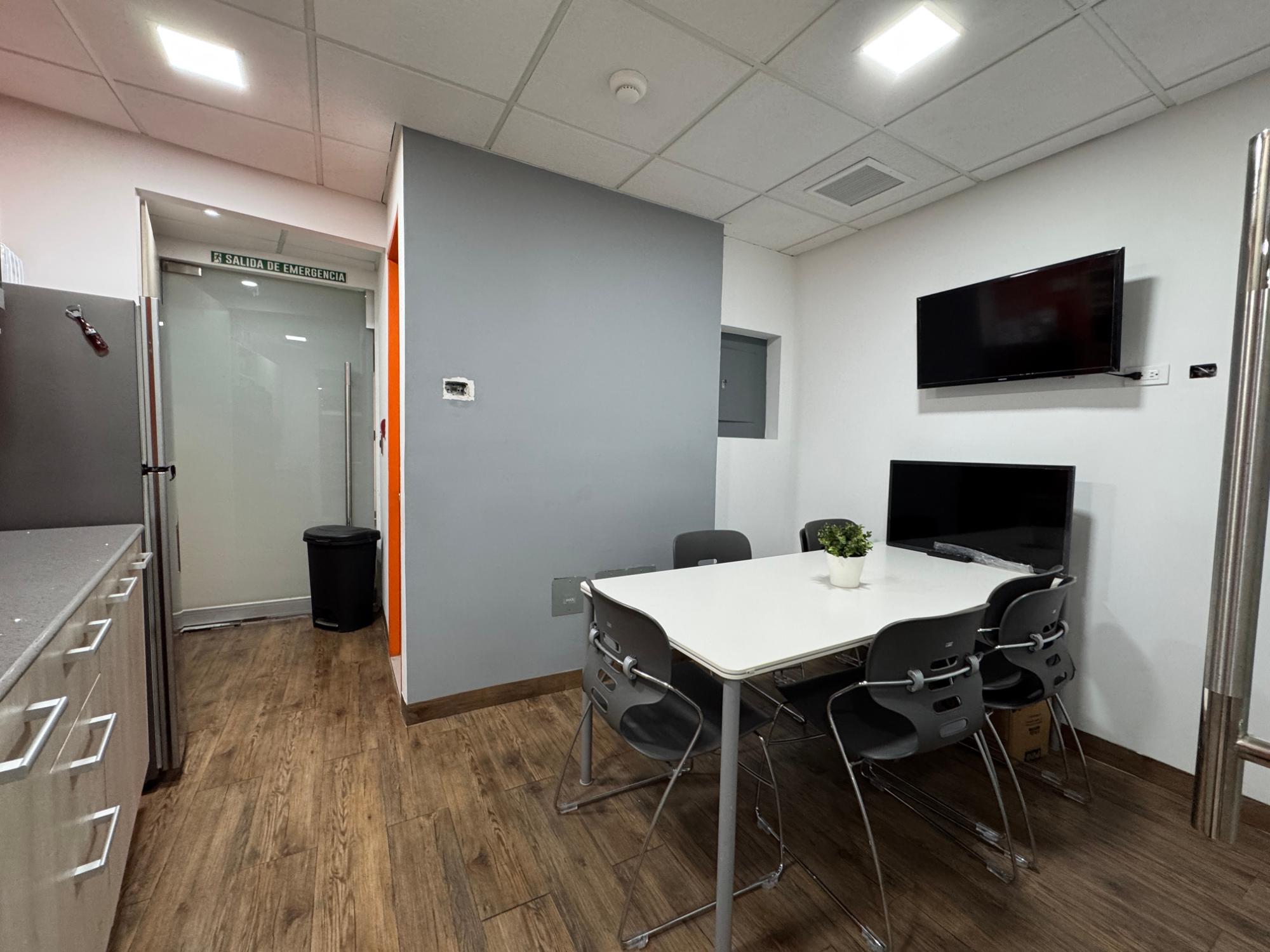 The office consists of a meeting room, manager's office, work area, bathroom and kitchenette.