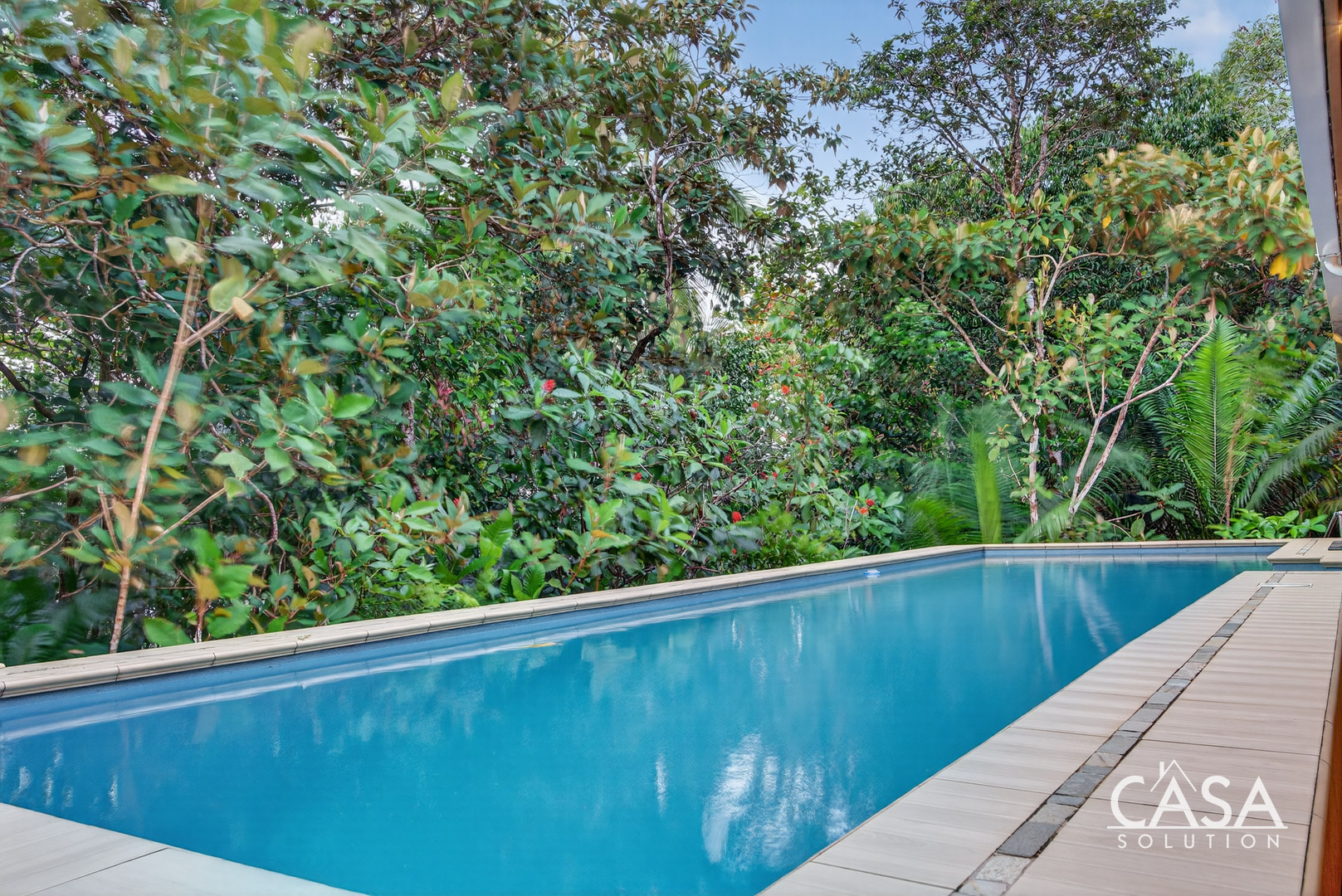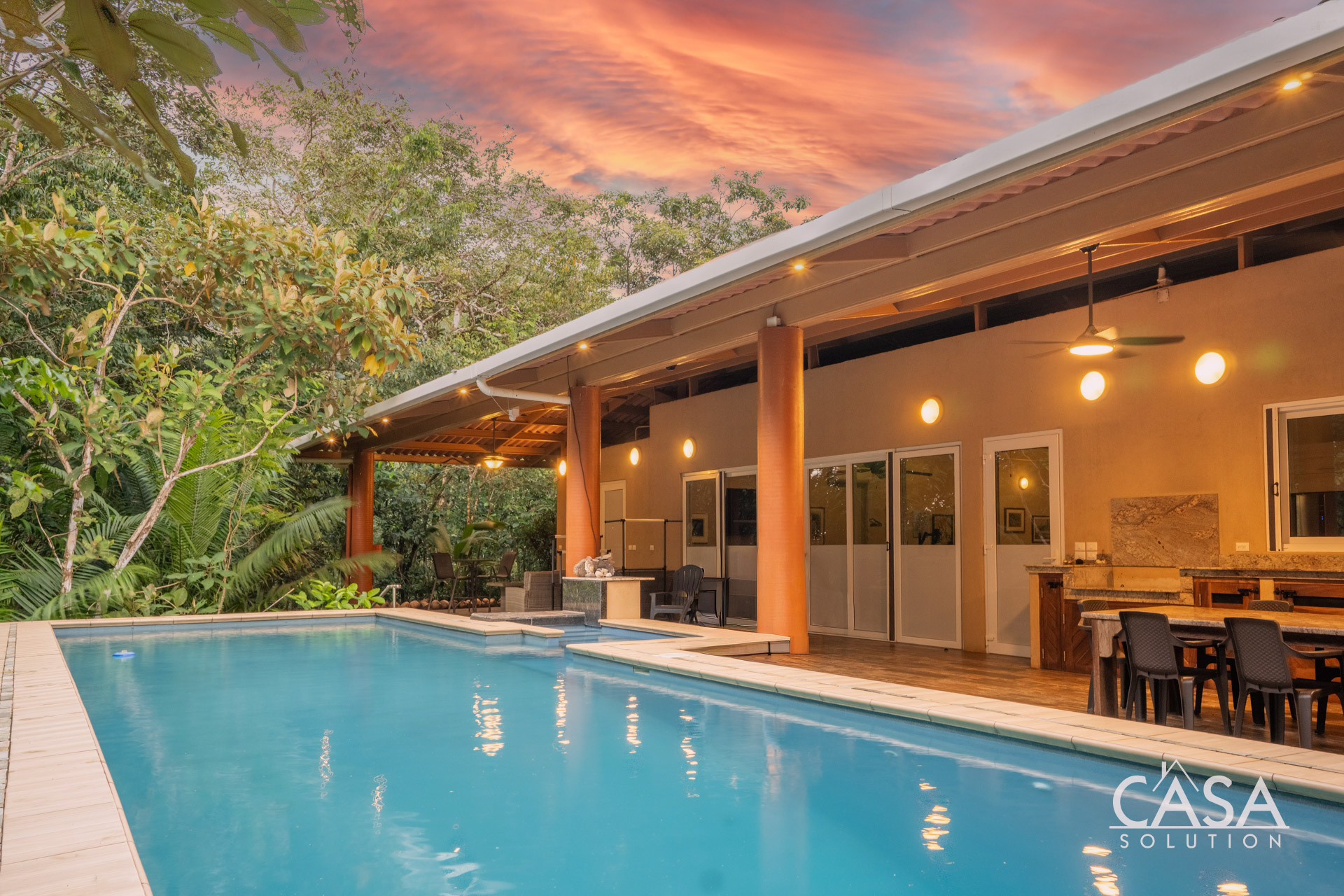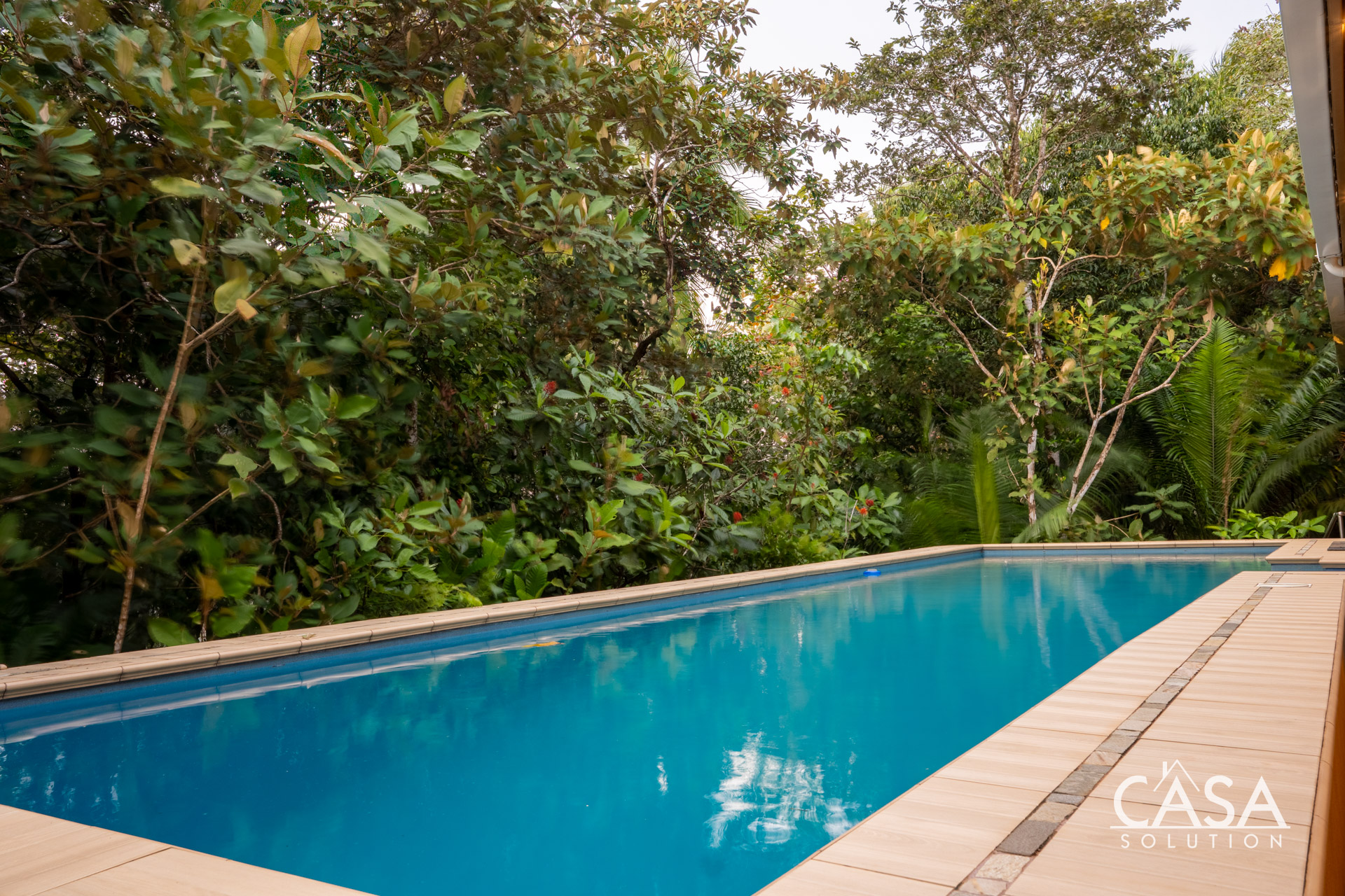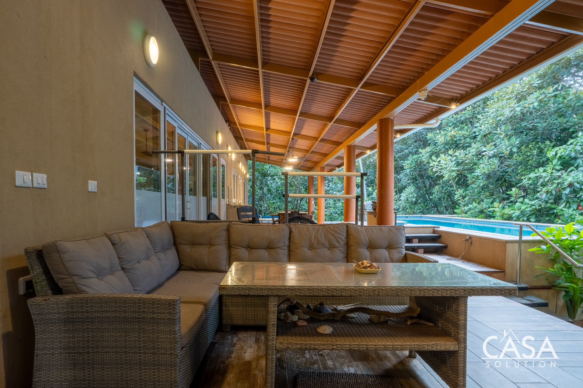The covered terrace extends the living area seamlessly outdoors, leading to a large pool framed by lush tropical greenery. This space invites you to enjoy the sounds of the ocean and surrounding jungle in total privacy. The gentle slope of the land ensures proper drainage and keeps the property feeling open while still embraced by nature.