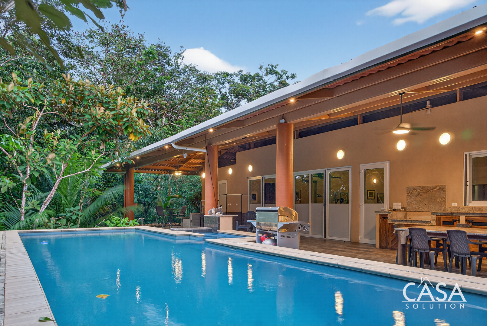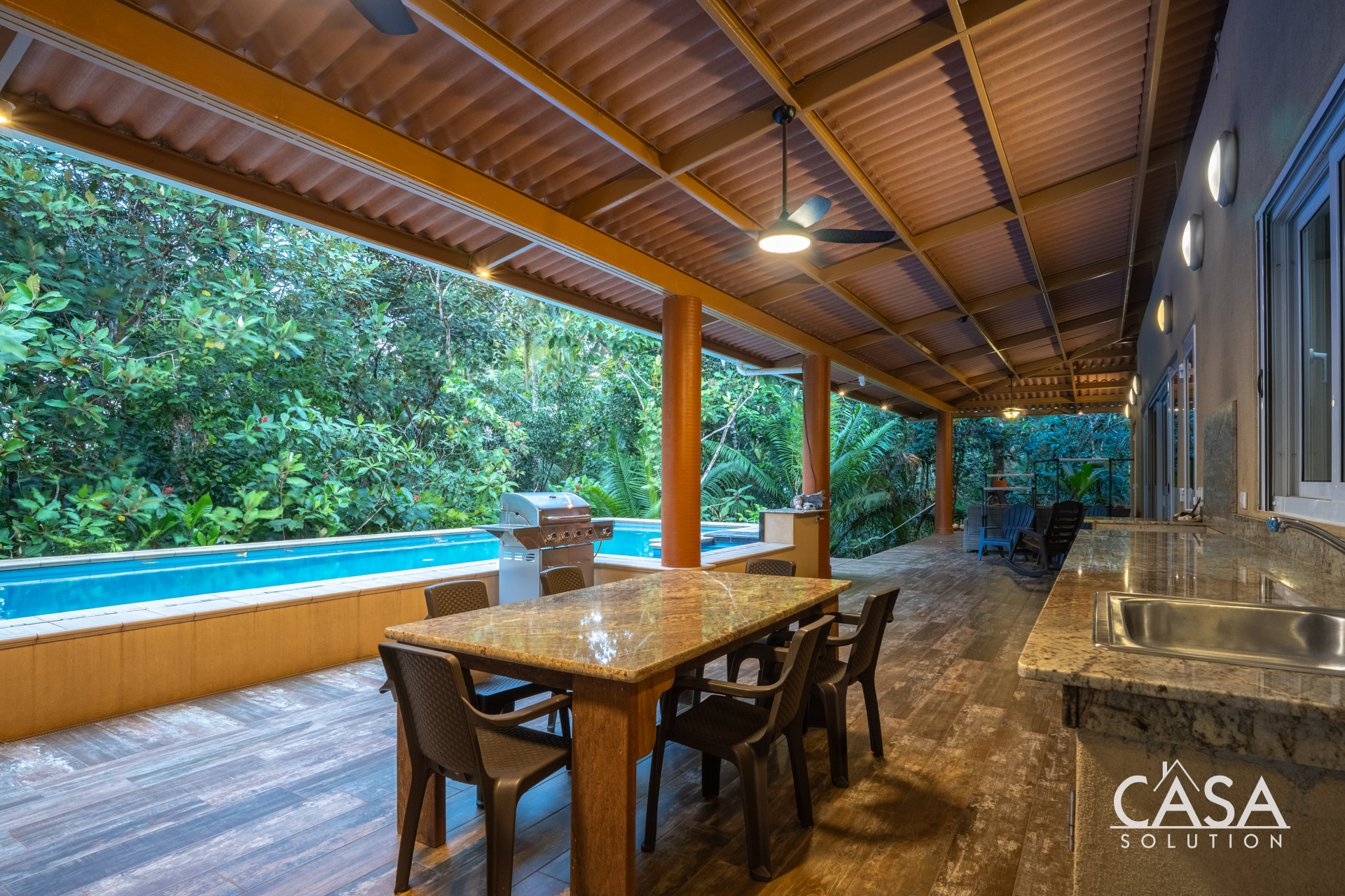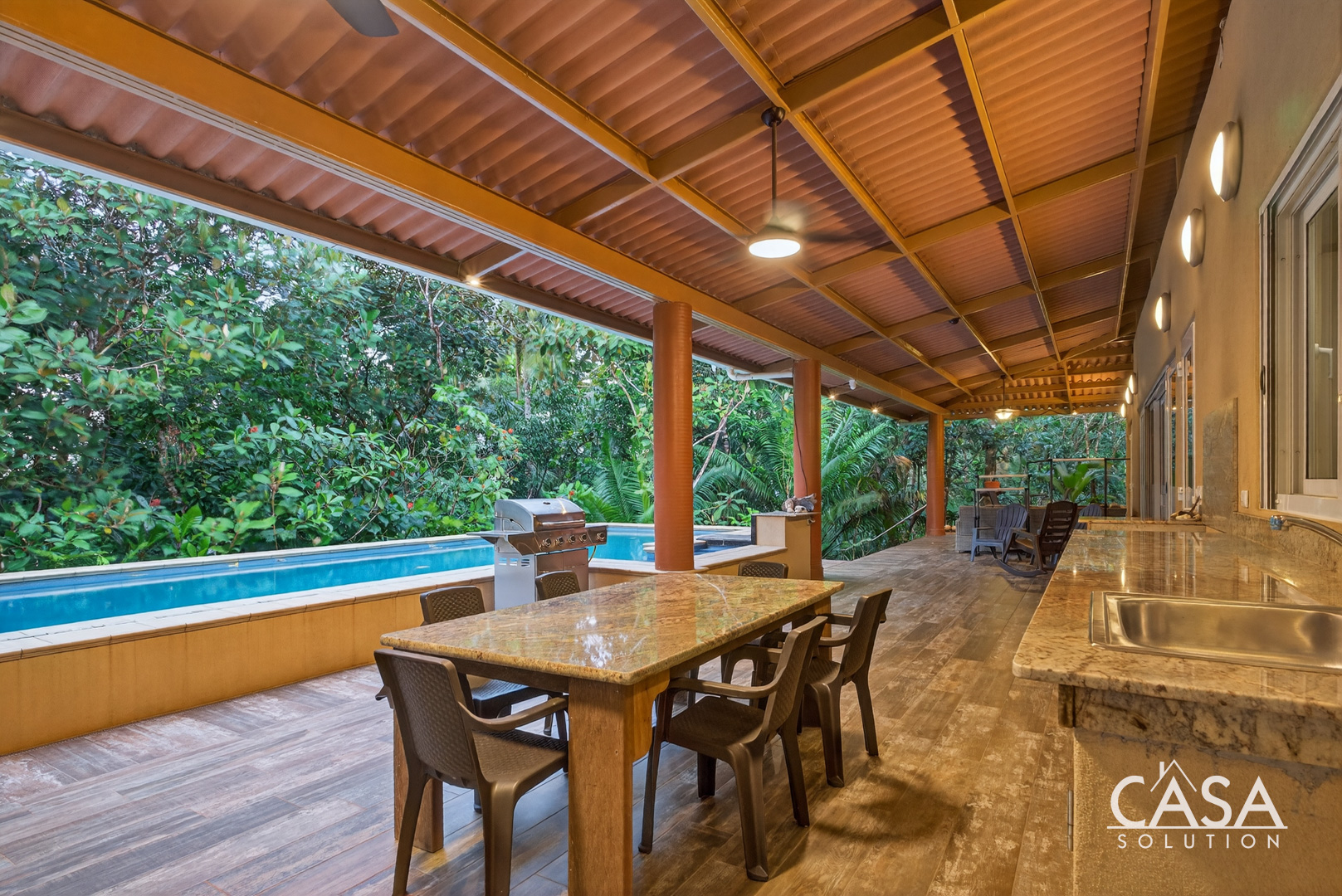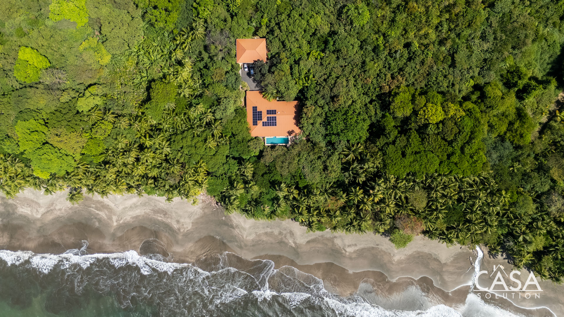 The covered terrace extends the living area seamlessly outdoors, leading to a large pool framed by lush tropical greenery. This space invites you to enjoy the sounds of the ocean and surrounding jungle in total privacy. The gentle slope of the land ensures proper drainage and keeps the property feeling open while still embraced by nature.