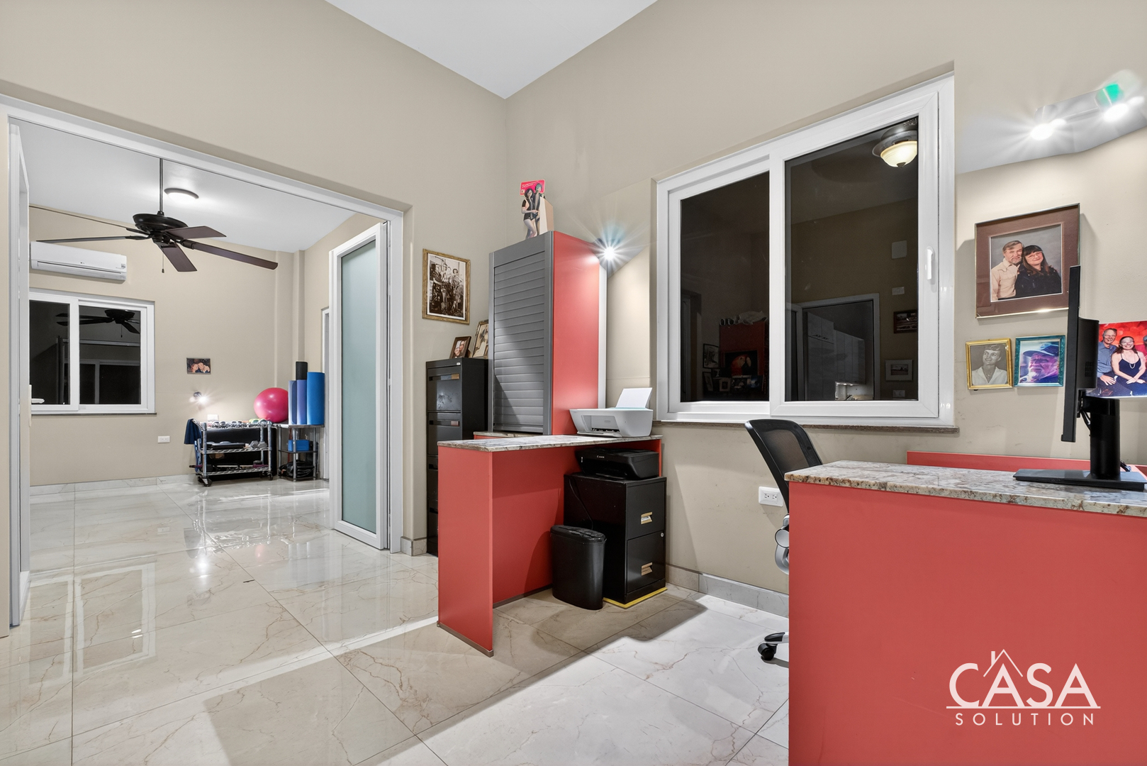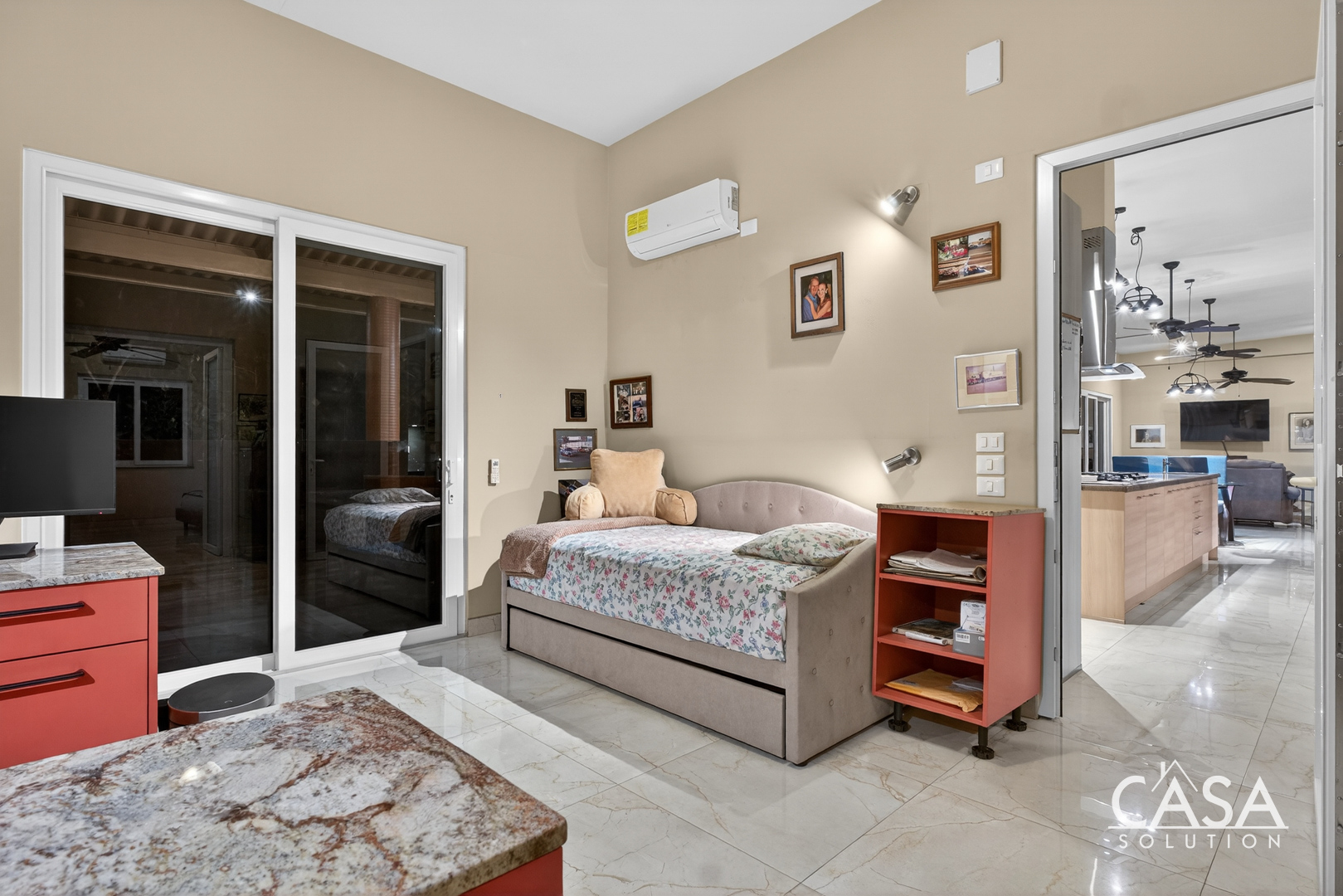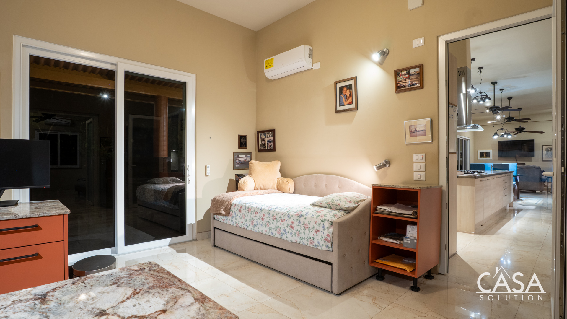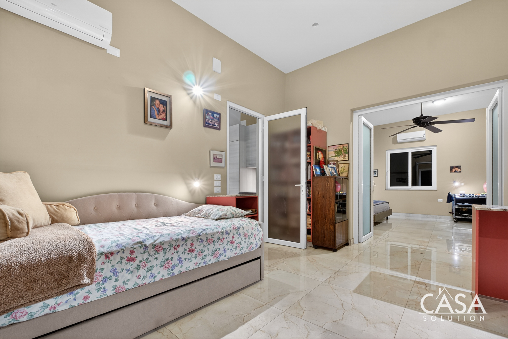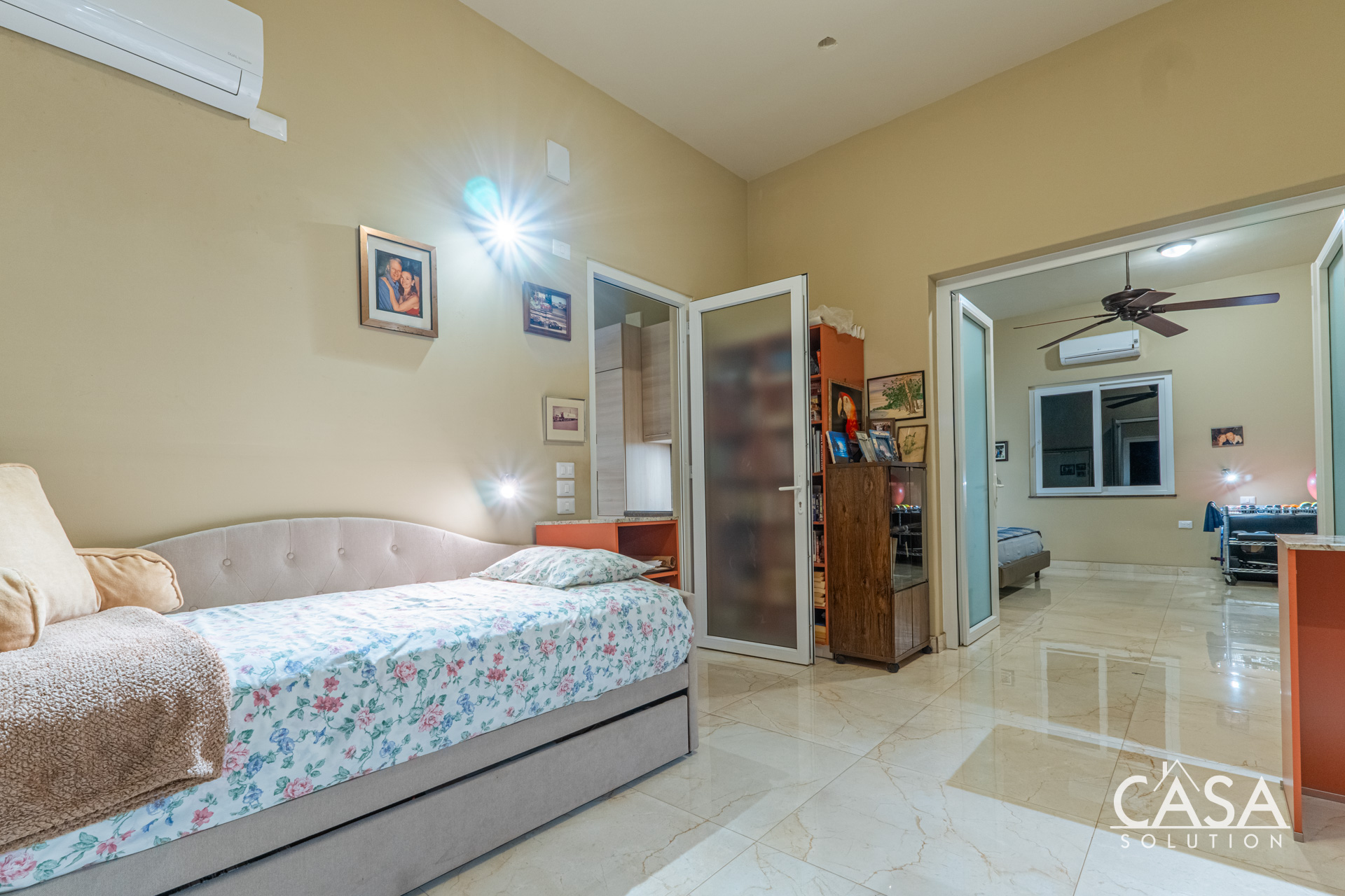 Inside, the home’s open layout emphasizes ease of movement and accessibility—it is wheelchair-friendly throughout. The interior finishes are refined yet practical, with marble-style floors and high ceilings that enhance airflow and light.