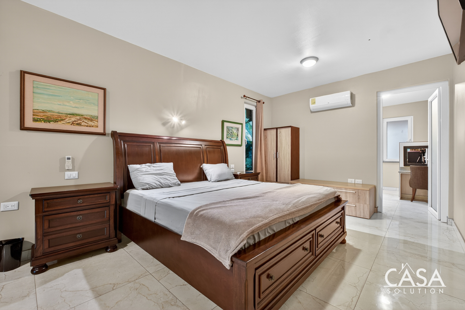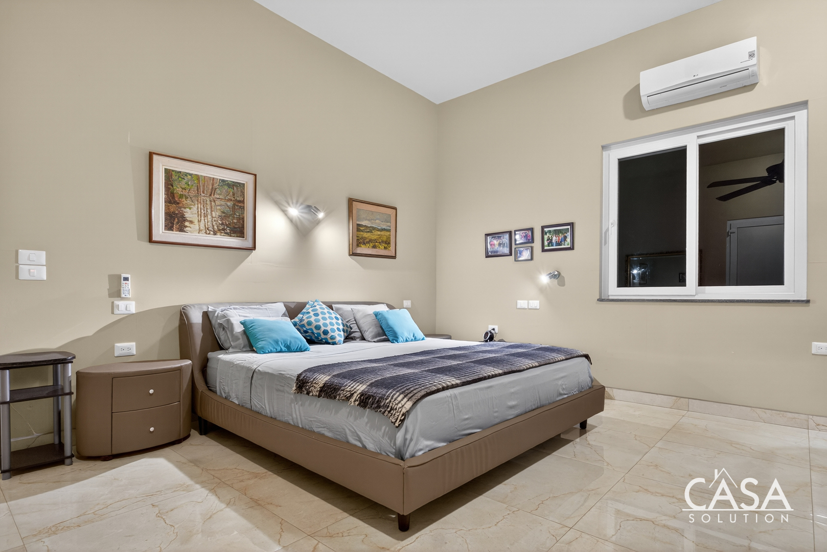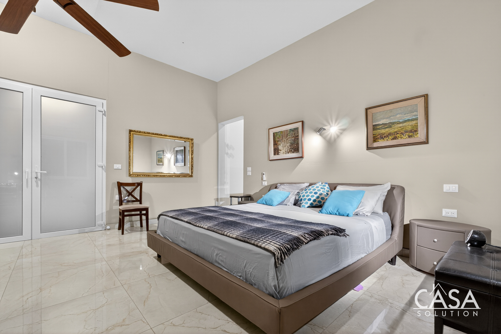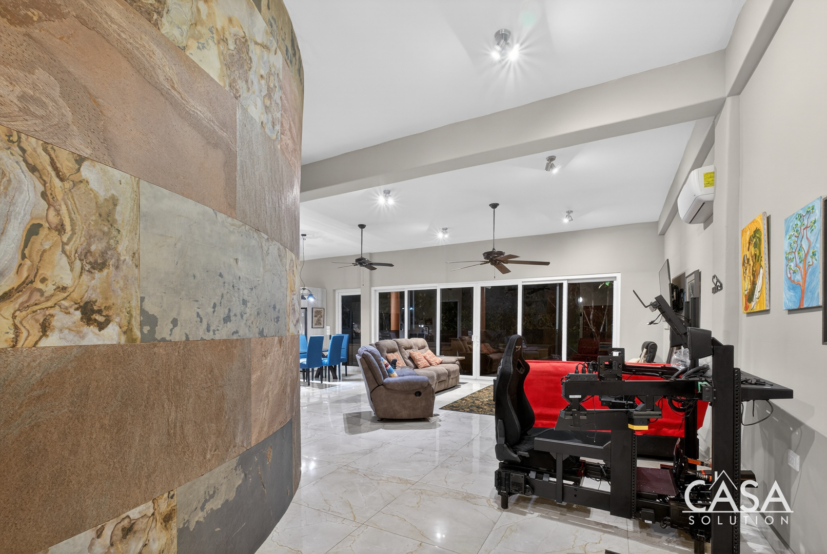Inside, the home’s open layout emphasizes ease of movement and accessibility—it is wheelchair-friendly throughout. The interior finishes are refined yet practical, with marble-style floors and high ceilings that enhance airflow and light.