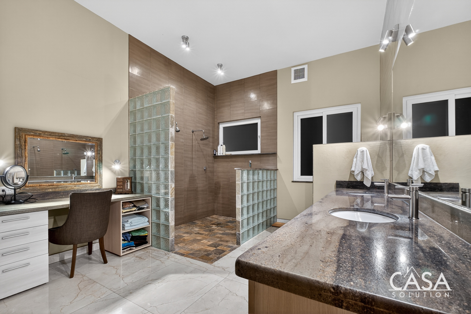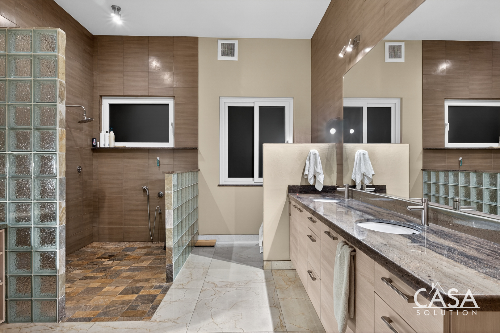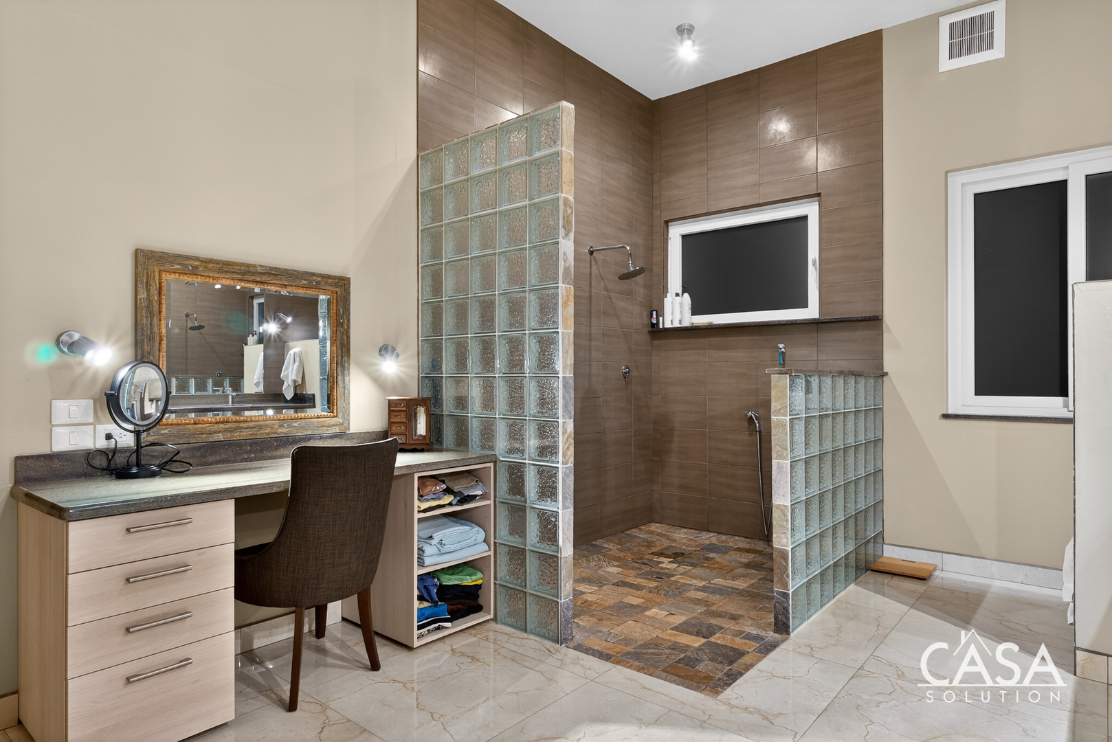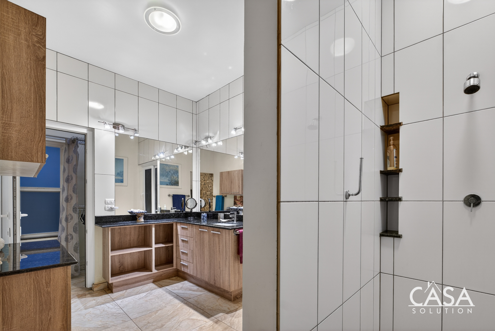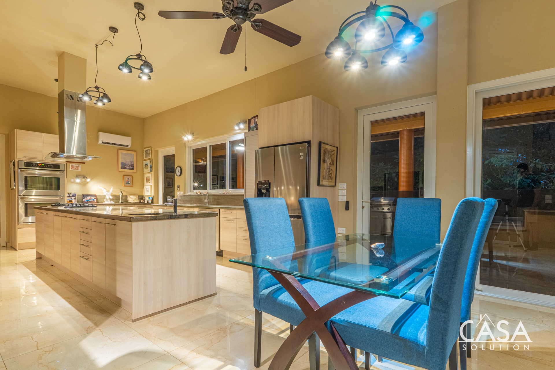 Inside, the home’s open layout emphasizes ease of movement and accessibility—it is wheelchair-friendly throughout. The interior finishes are refined yet practical, with marble-style floors and high ceilings that enhance airflow and light.
