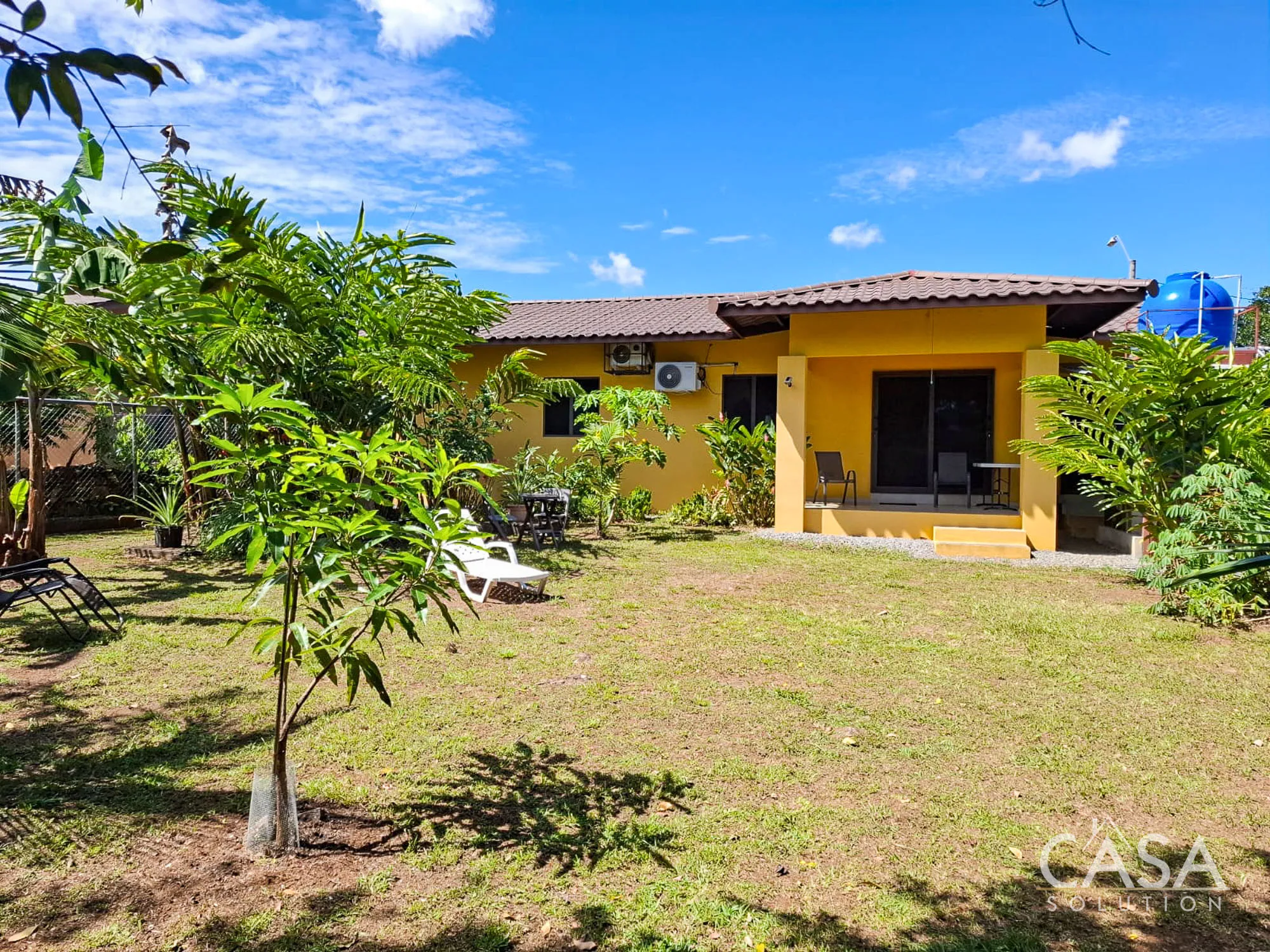 The backyard includes a mix of greenery and young trees, creating a sense of privacy without closing off the space. The covered terrace connects directly to this area, making it part of everyday living rather than occasional use.