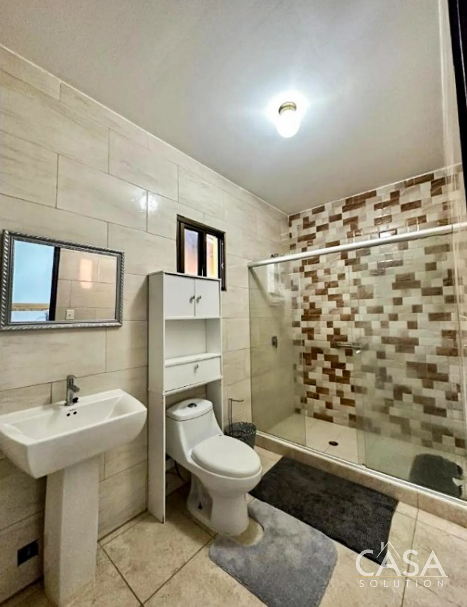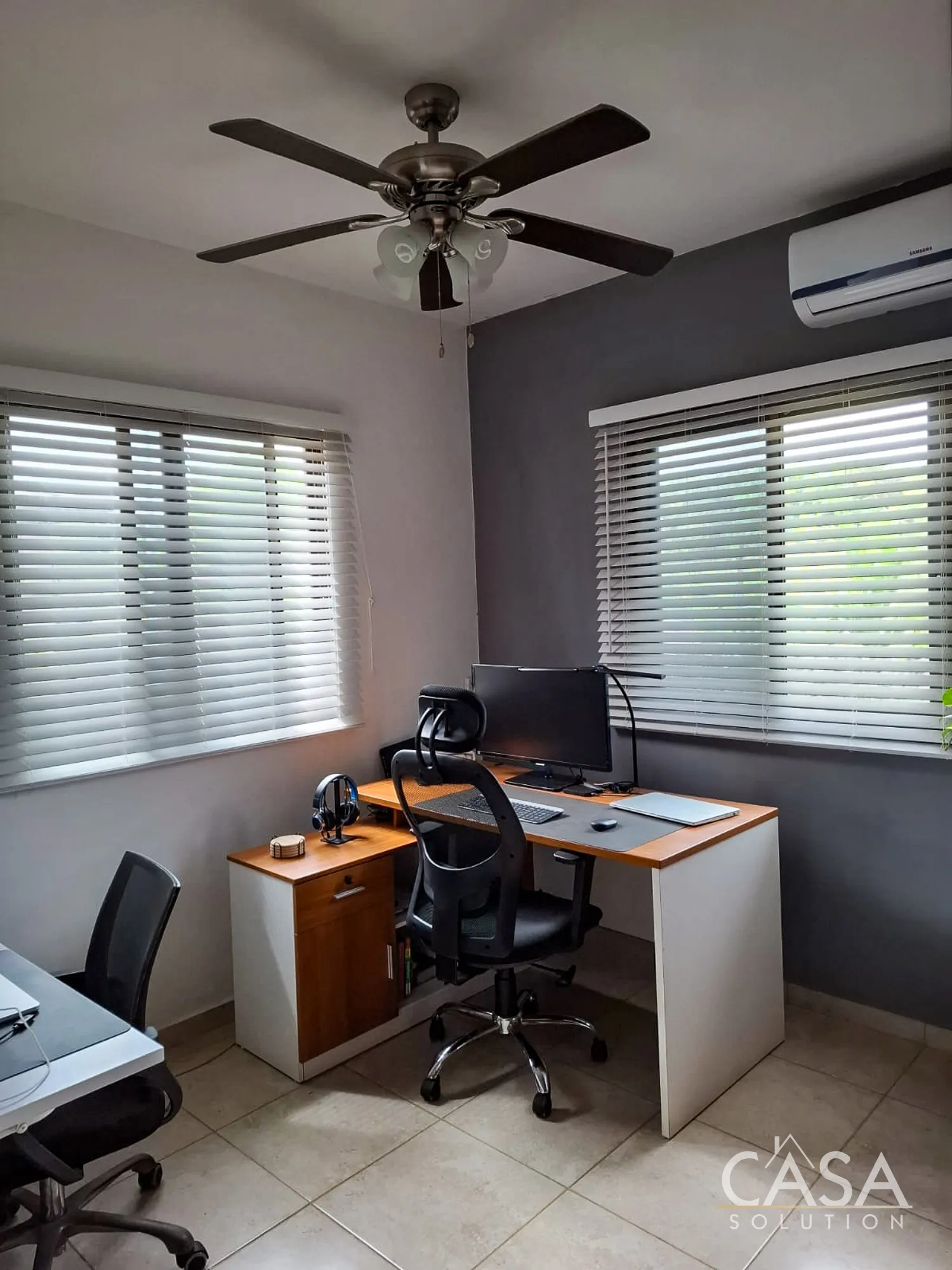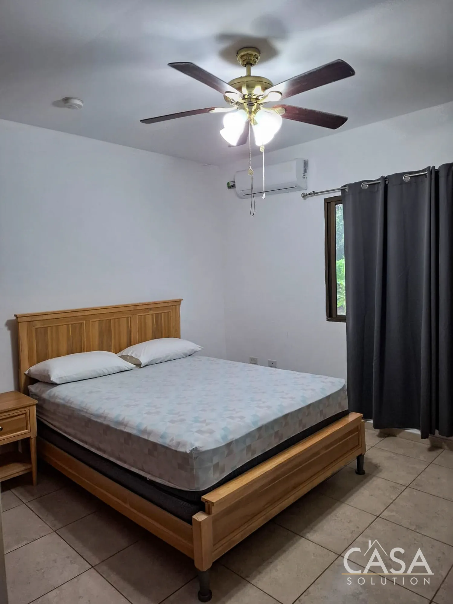 Each bedroom includes its own split A/C unit and ceiling fan, helping maintain comfort throughout the year. The bathrooms come fully tiled, with one featuring a glass-enclosed shower and neutral finishes that are easy to maintain over time.