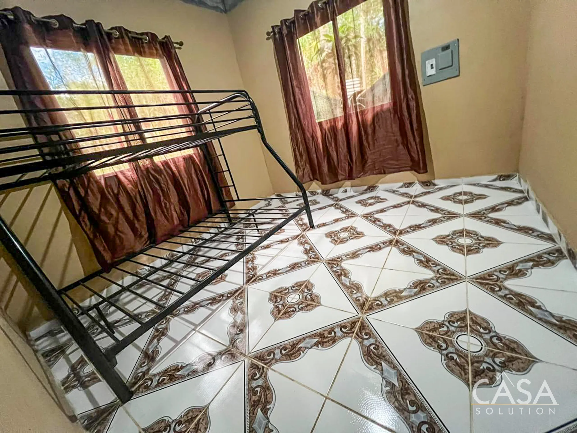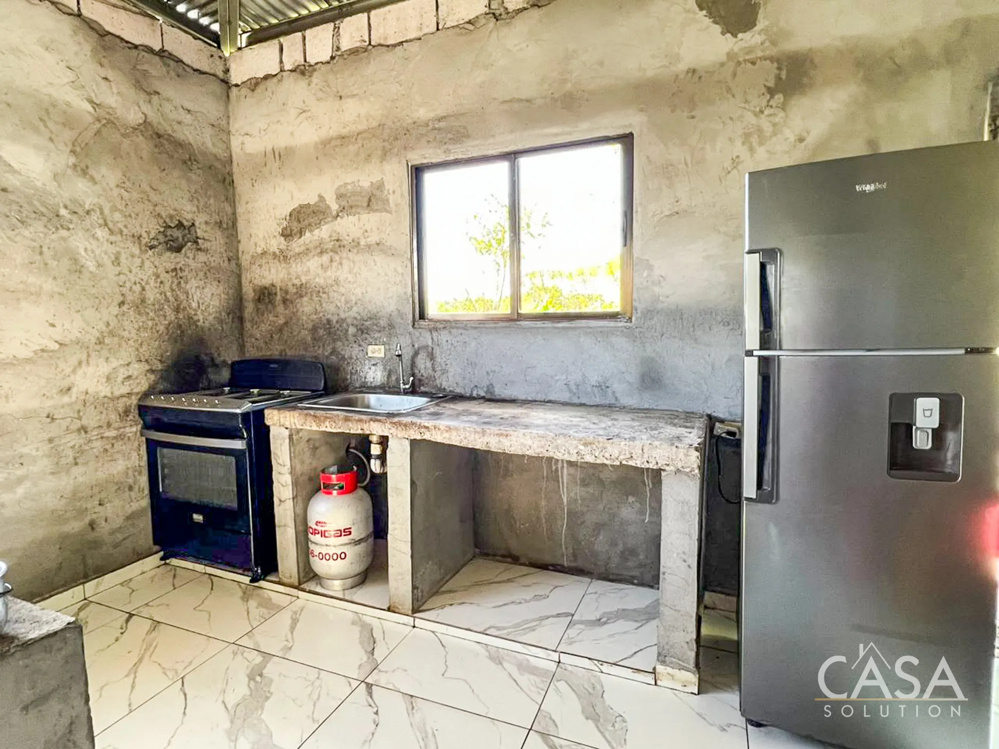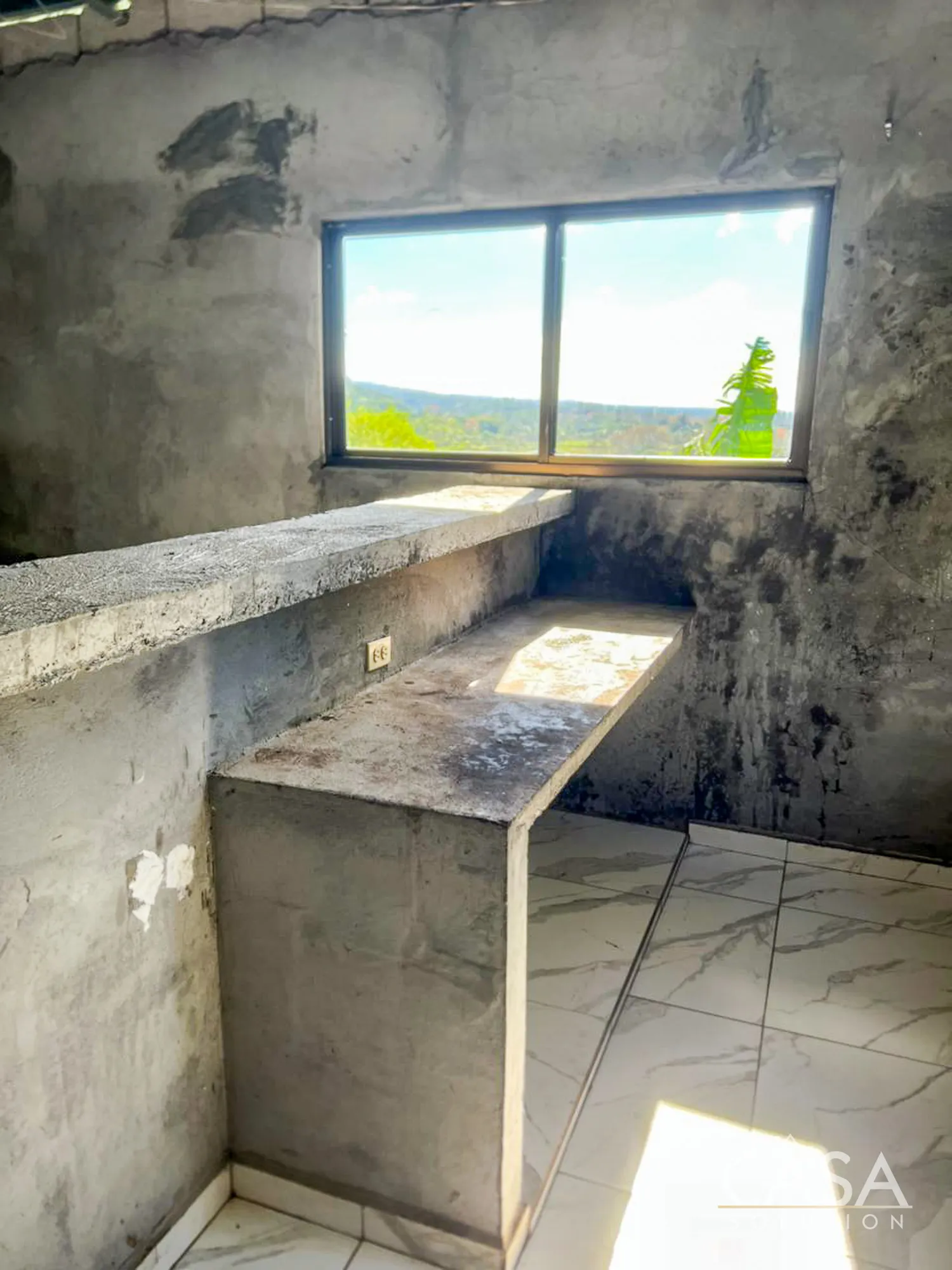 Inside, the layout remains simple and functional. Multiple windows bring in natural light, and tiled floors throughout make maintenance straightforward. The kitchen includes concrete counters and open shelving, consistent with the rural mountain setting of Río Sereno.