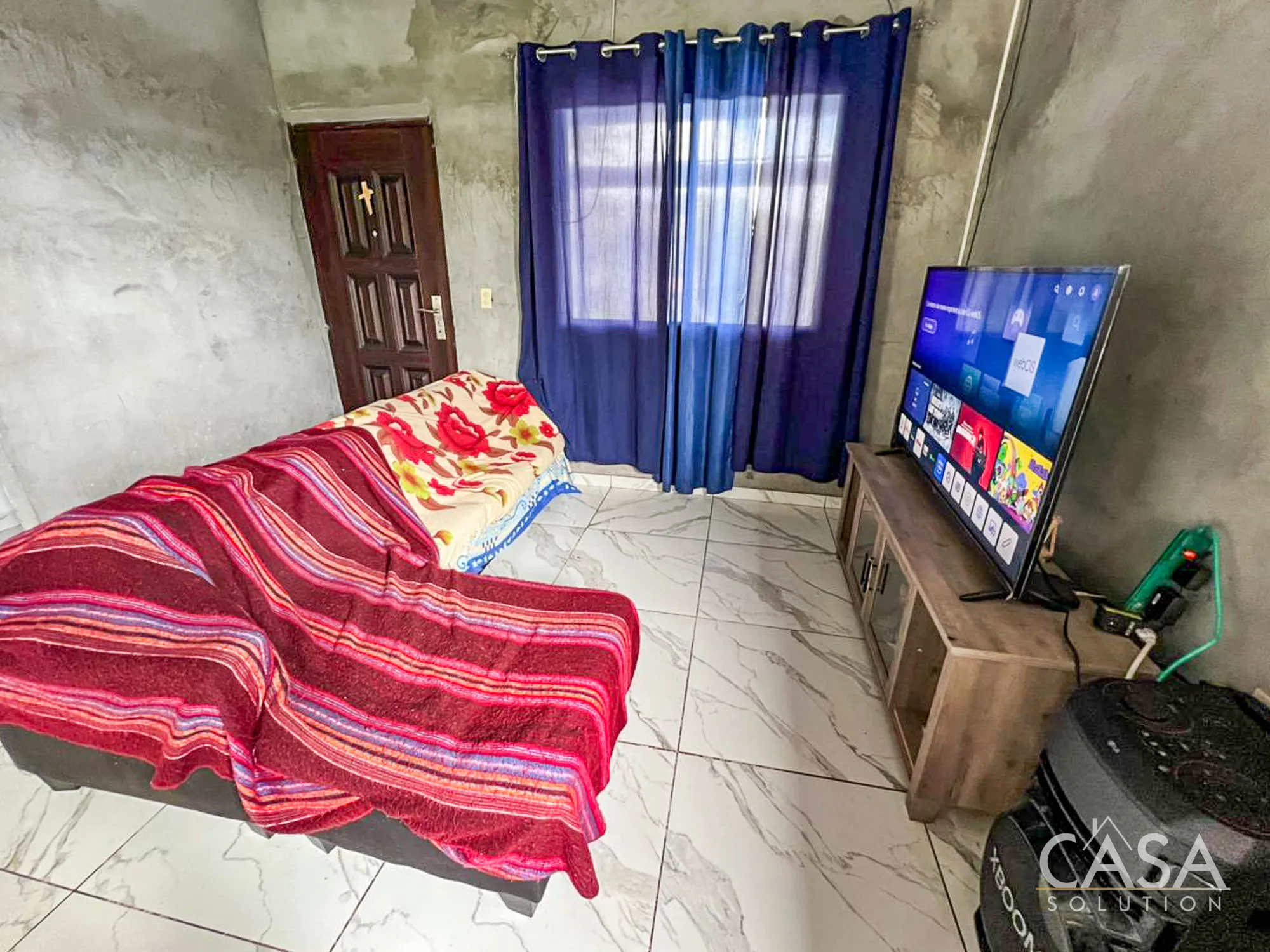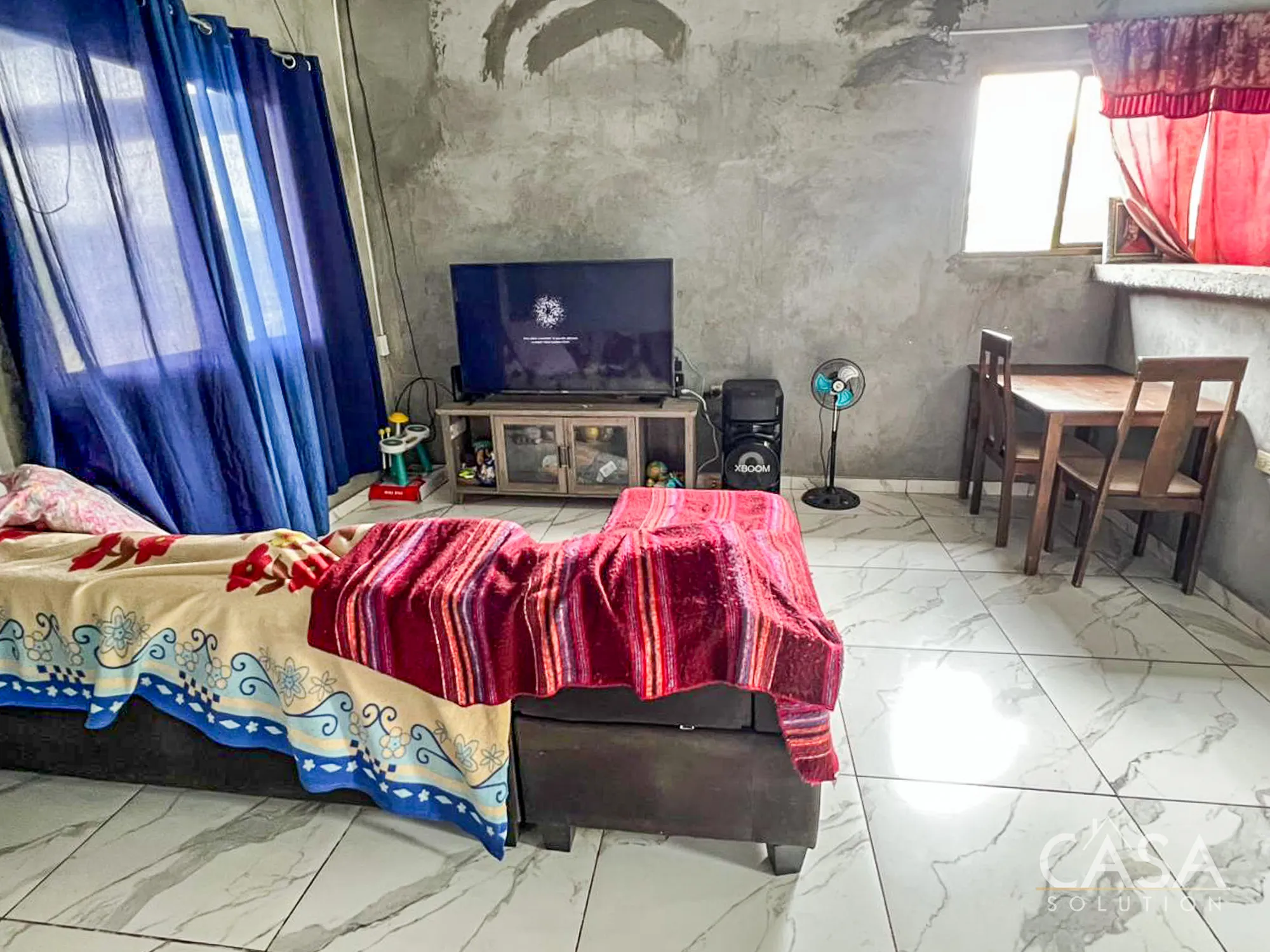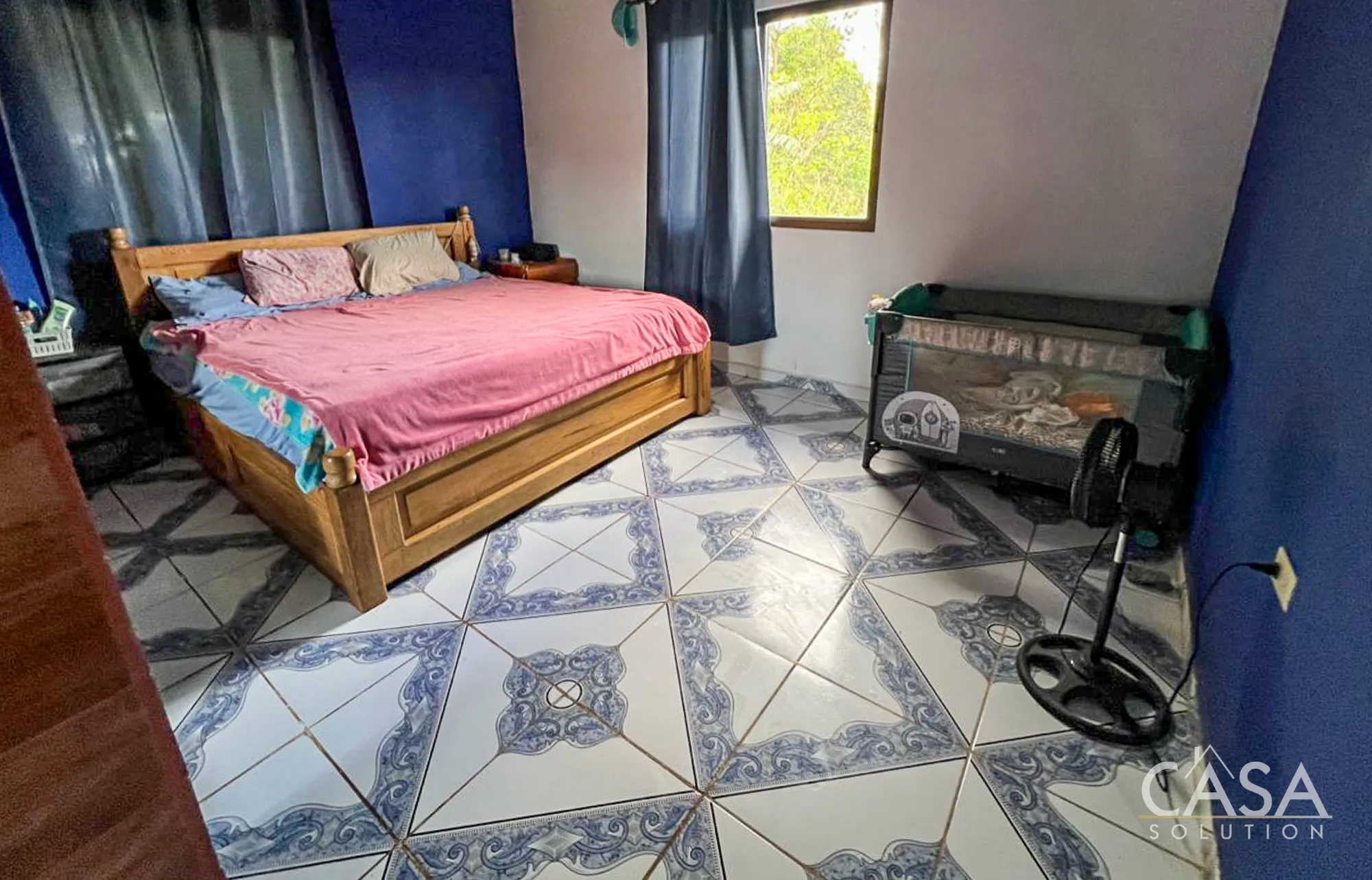 Inside, the layout remains simple and functional. Multiple windows bring in natural light, and tiled floors throughout make maintenance straightforward. The kitchen includes concrete counters and open shelving, consistent with the rural mountain setting of Río Sereno.
