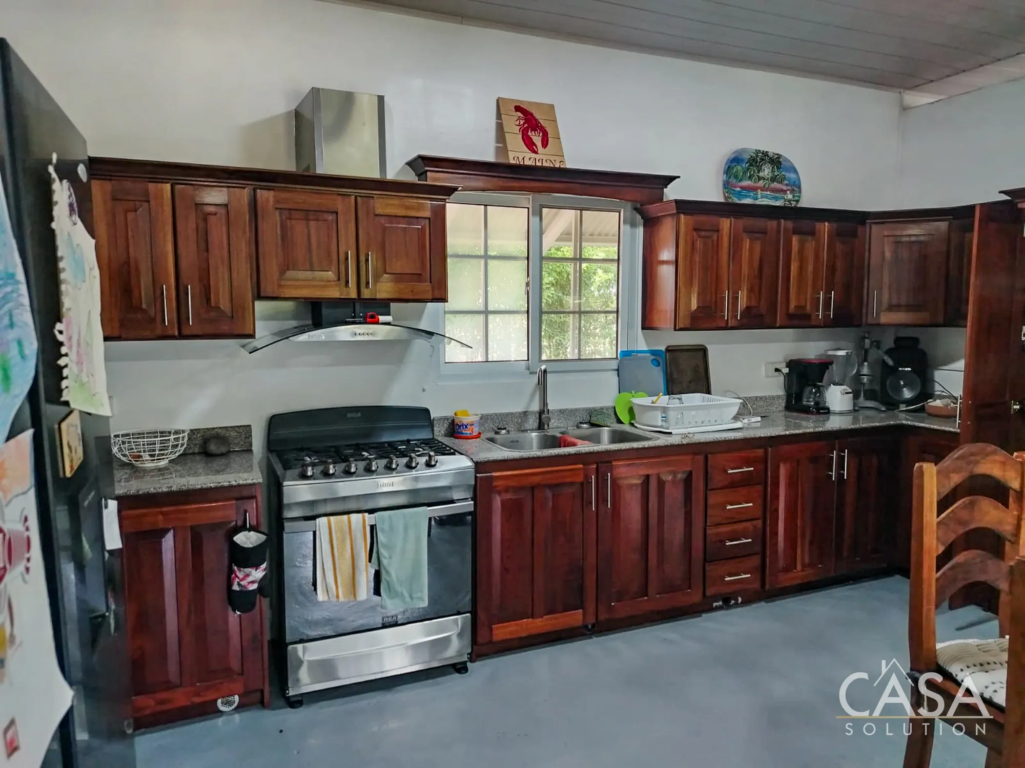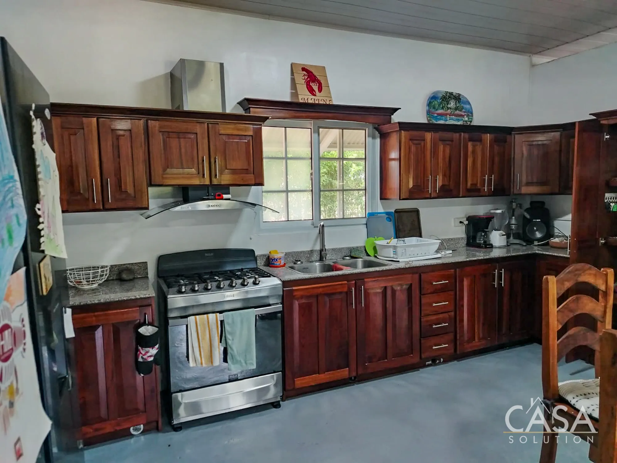 The kitchen is fitted with wood cabinetry and comes equipped with a stove, refrigerator, washer, and dryer already in place. The finishes are practical and consistent with the overall style of the home—nothing overdesigned, but everything functional and usable from day one.