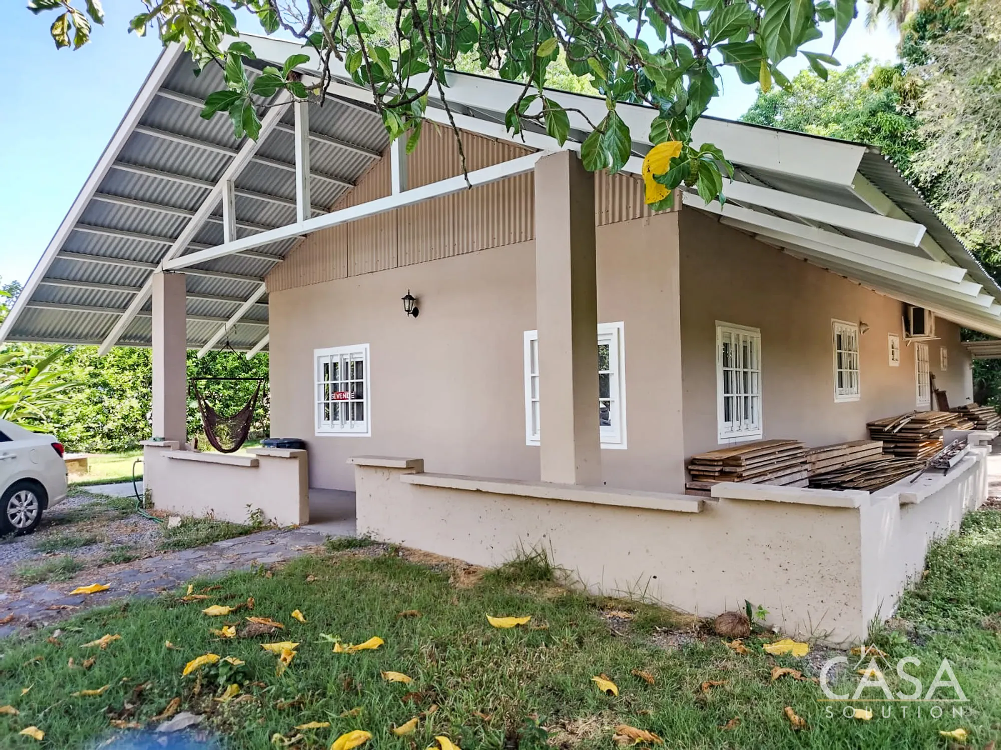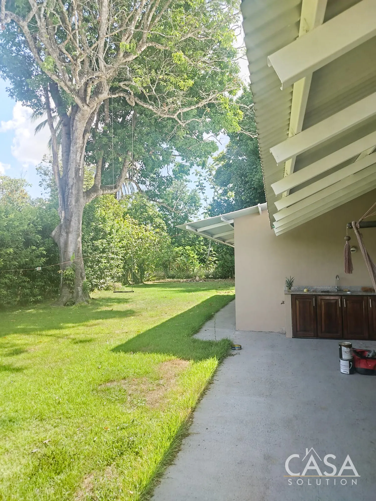 The covered terrace and surrounding green space make it easy to spend time outdoors, whether that’s relaxing in a hammock, working on the garden, or simply enjoying the shade from mature trees.