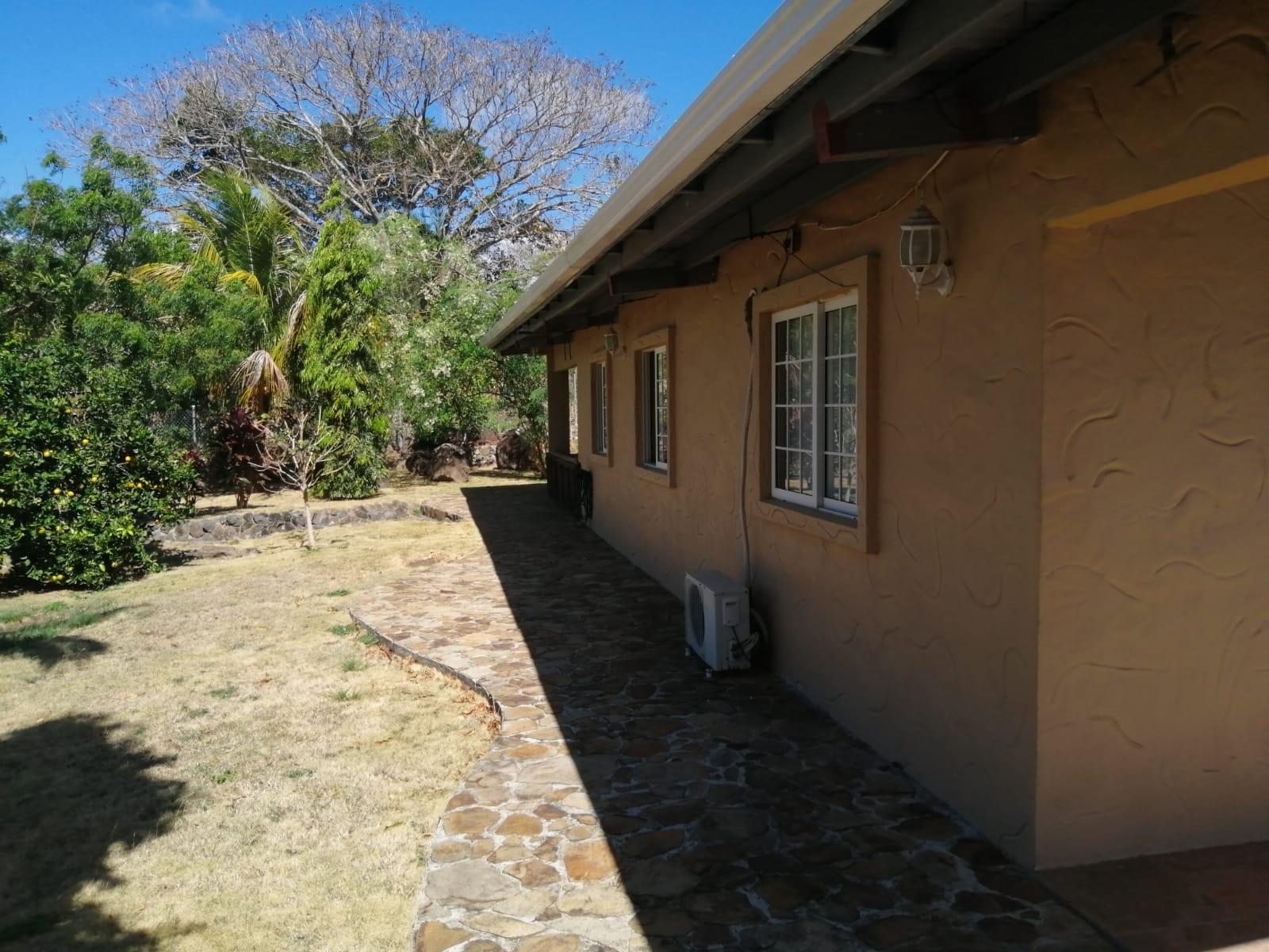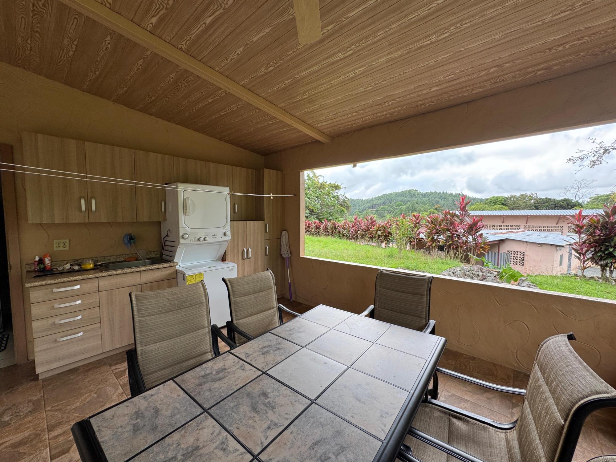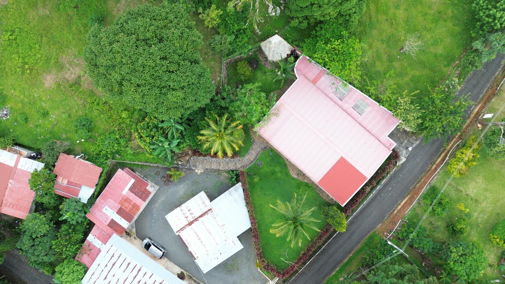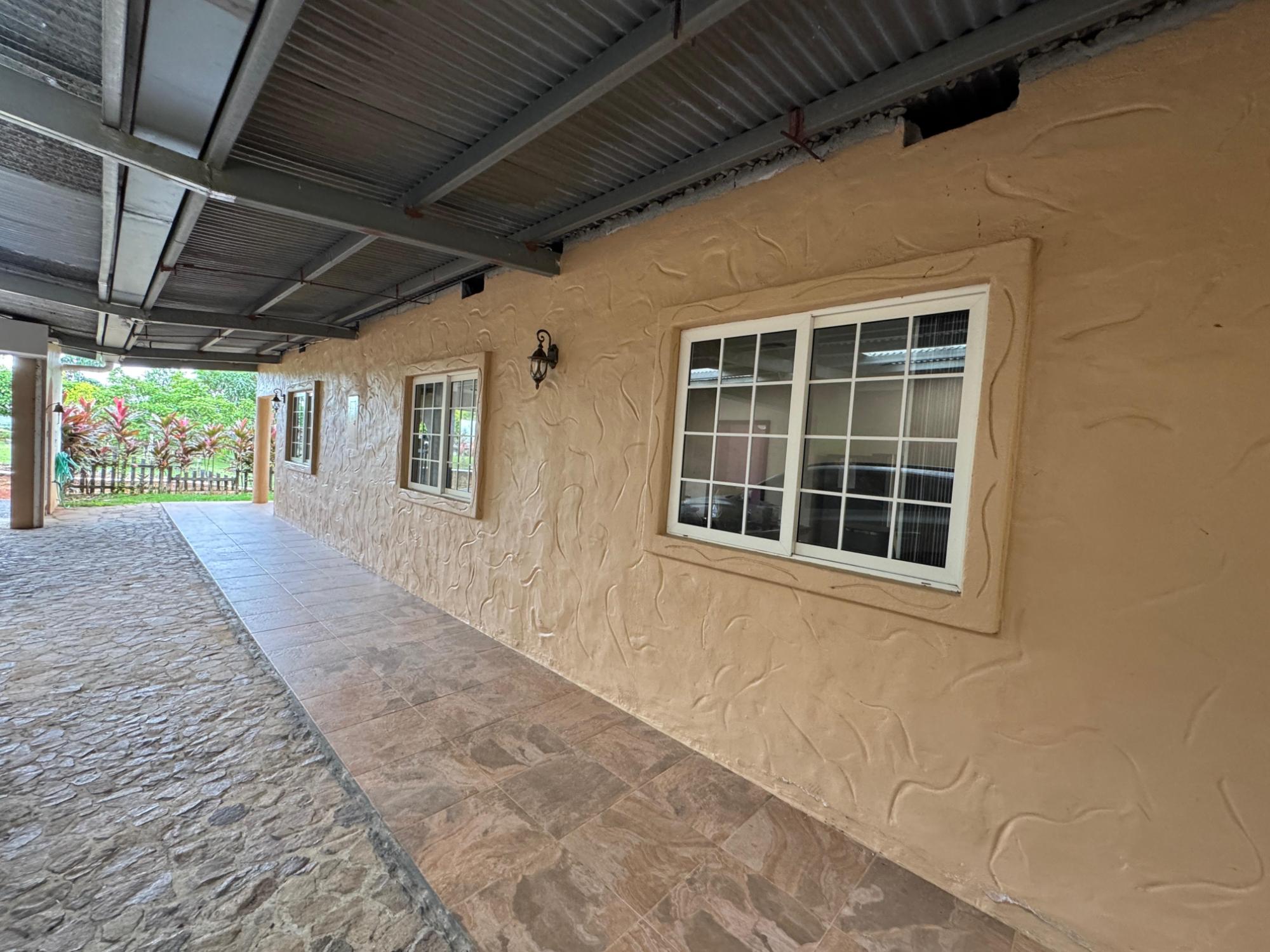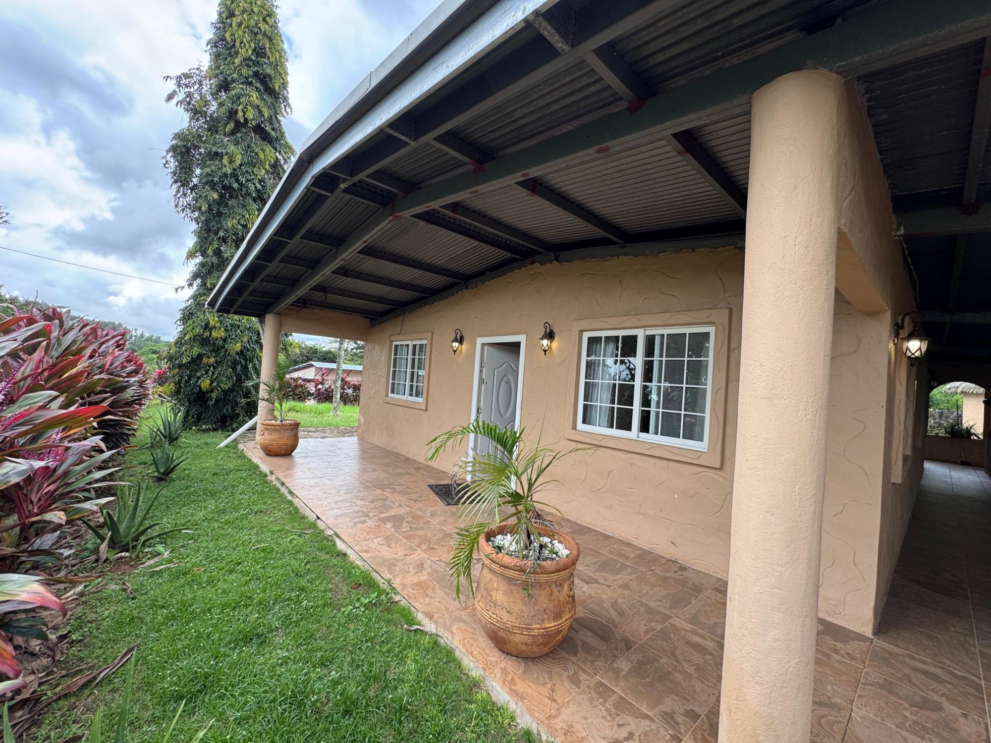 This house for sale in Sora, Chame, Panama sits about 150 meters from the Sora town park, 20 minutes from the Inter-American Highway, and 30 minutes from Coronado. The location provides quick access to supermarkets, restaurants, and medical services. The property enjoys a quiet residential atmosphere with mountain views and cooler temperatures common in this part of Panama. Property Overview The property covers 612.22 square meters of land with 307.71 square meters of construction. The layout includes the main house, a guest room, terrace, laundry area, two-car carport, and a pump room. The flat terrain allows easy access and low maintenance. The garden includes lemon and banana trees, creating a practical and pleasant outdoor space. Main House The main structure includes a living and dining room, kitchen, one bedroom, an office, and one full bathroom. The kitchen features granite countertops, a double stainless-steel sink, and modular cabinetry. PVC sliding windows bring in natural light and ventilation. Tiled floors run throughout the home, and gypsum ceilings give a clean and consistent finish. The living area connects easily to the dining and kitchen spaces, designed for comfortable everyday use. The office includes built-in furniture and large windows that open to mountain views, making it suitable for remote work or a personal project space. Guest Quarters and Additional Areas The guest room stands separate from the main house and includes a shower area with full-height wall tiles. It maintains the same solid construction quality, with PVC windows, tiled floors, and decorative wall finishes.