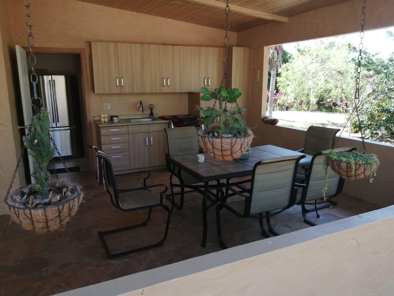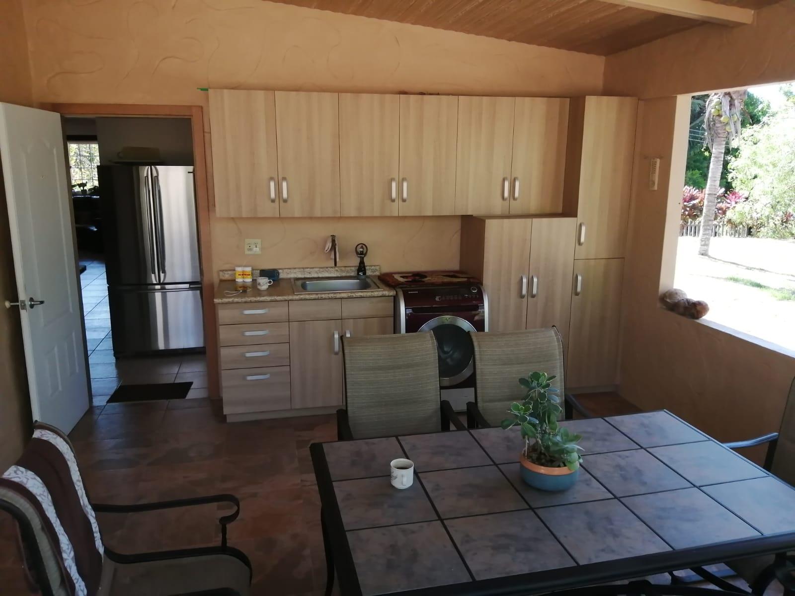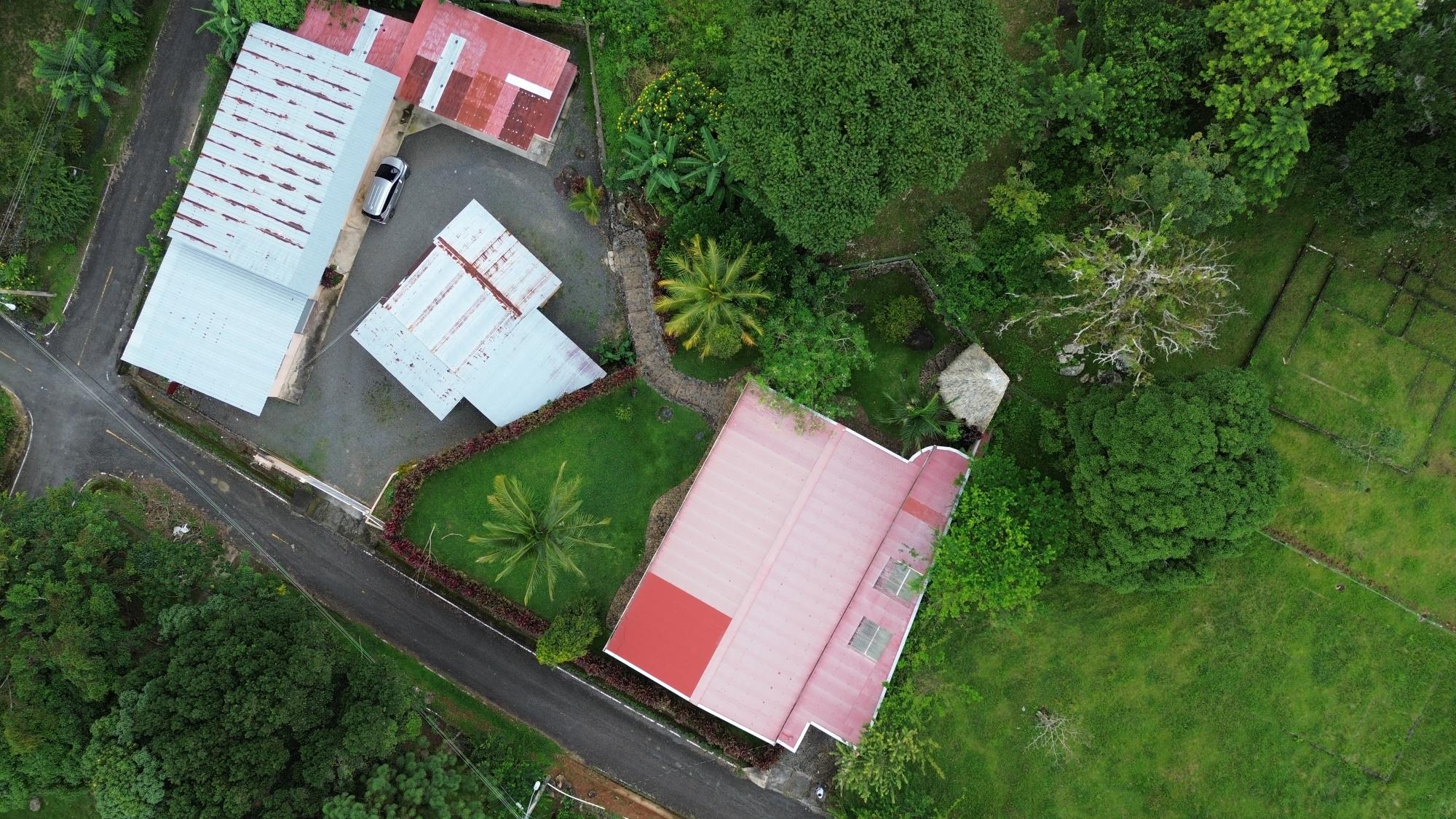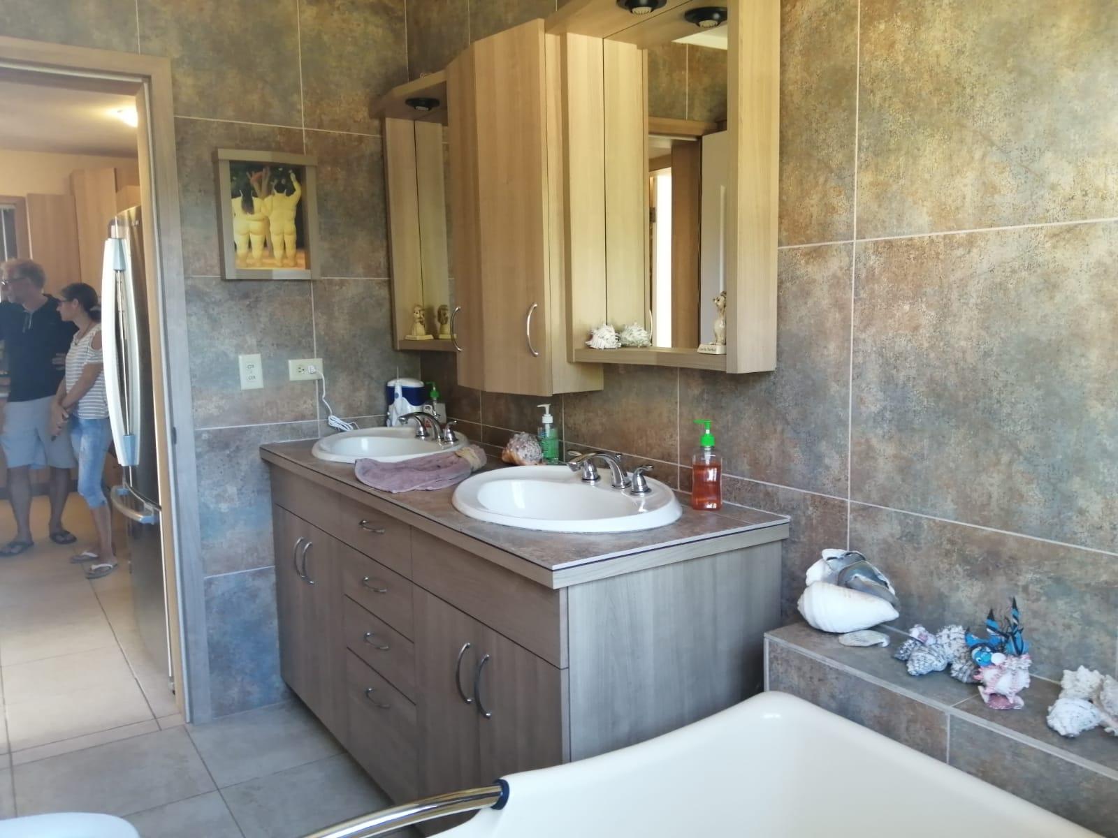 This house for sale in Sora, Chame, Panama sits about 150 meters from the Sora town park, 20 minutes from the Inter-American Highway, and 30 minutes from Coronado. The location provides quick access to supermarkets, restaurants, and medical services. The property enjoys a quiet residential atmosphere with mountain views and cooler temperatures common in this part of Panama. Property Overview The property covers 612.22 square meters of land with 307.71 square meters of construction. The layout includes the main house, a guest room, terrace, laundry area, two-car carport, and a pump room. The flat terrain allows easy access and low maintenance. The garden includes lemon and banana trees, creating a practical and pleasant outdoor space. Main House The main structure includes a living and dining room, kitchen, one bedroom, an office, and one full bathroom. The kitchen features granite countertops, a double stainless-steel sink, and modular cabinetry. PVC sliding windows bring in natural light and ventilation. Tiled floors run throughout the home, and gypsum ceilings give a clean and consistent finish. The living area connects easily to the dining and kitchen spaces, designed for comfortable everyday use. The office includes built-in furniture and large windows that open to mountain views, making it suitable for remote work or a personal project space. Guest Quarters and Additional Areas The guest room stands separate from the main house and includes a shower area with full-height wall tiles. It maintains the same solid construction quality, with PVC windows, tiled floors, and decorative wall finishes.