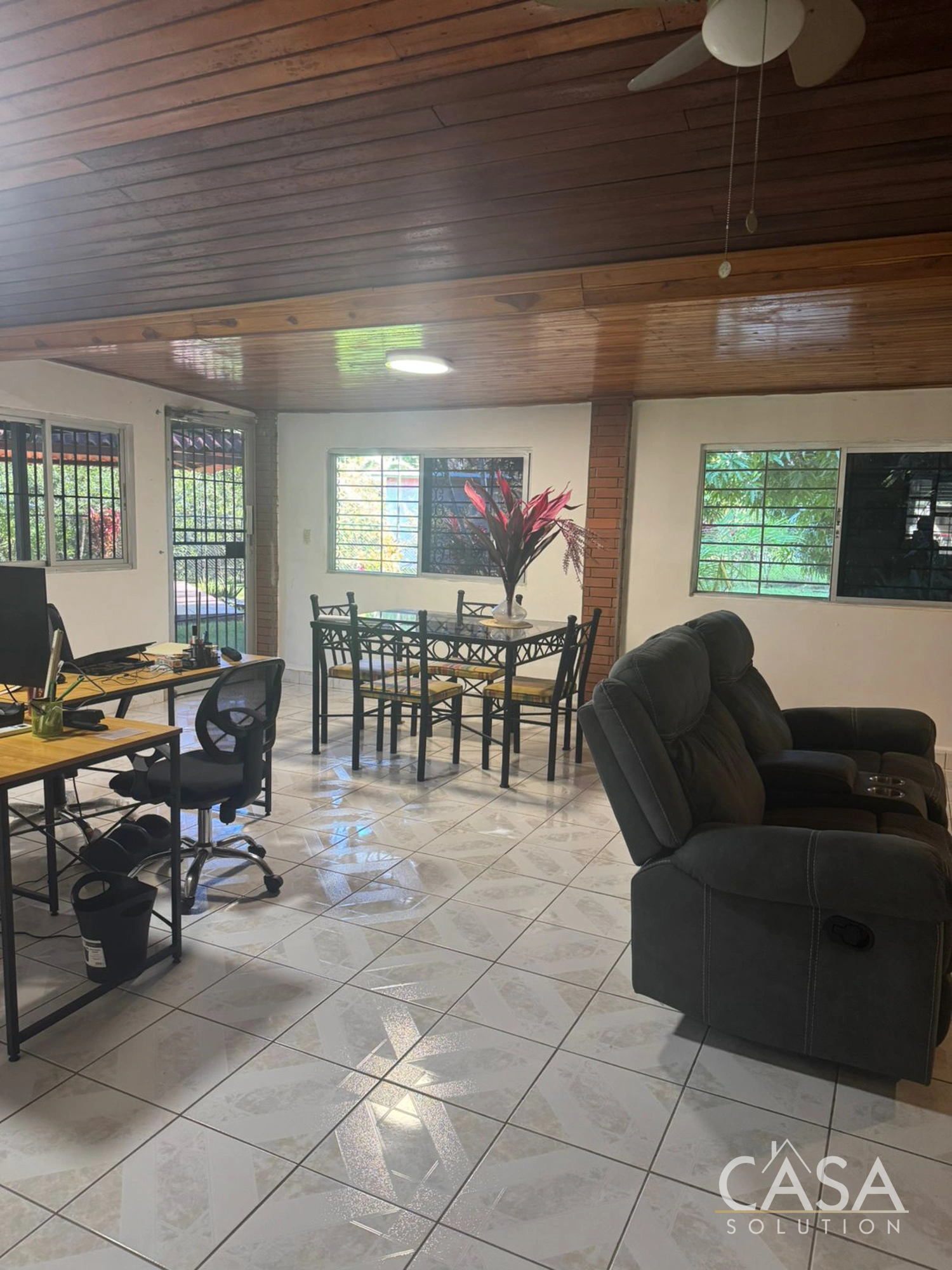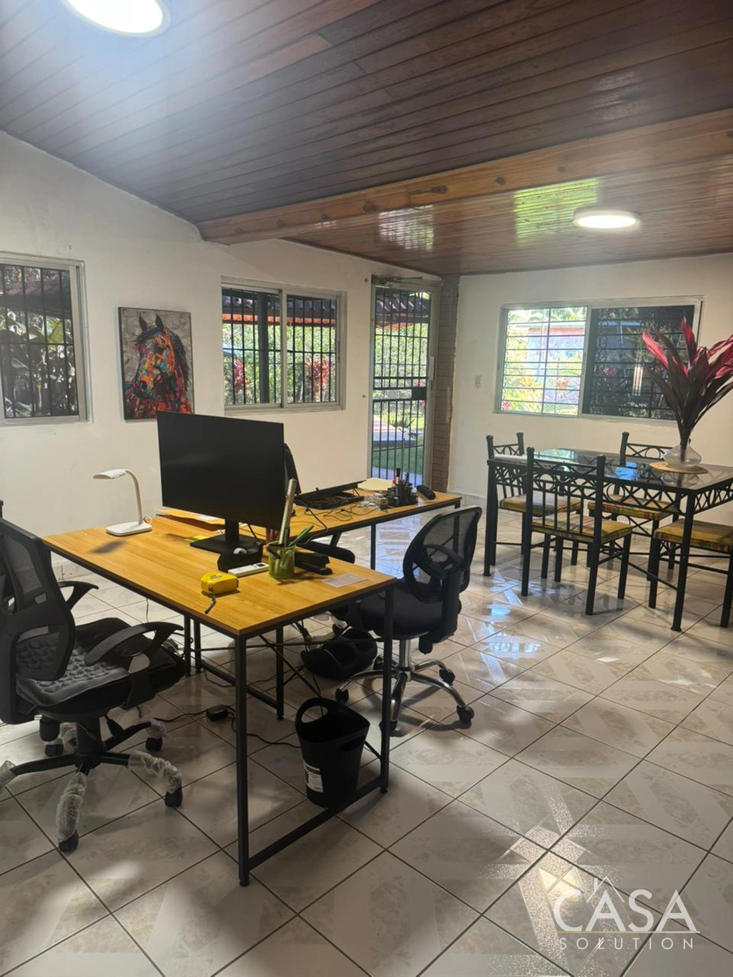 In addition to the main residence, the property includes a separate guest house currently set up as an office with a bathroom. This structure works well for remote work, private meetings, or guest accommodation, allowing separation from the main living areas without altering the daily flow of the house.