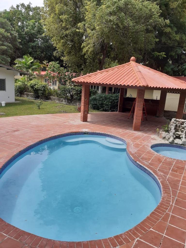 House for sale on the street parallel to the ocean. This house has 3 bedrooms and 3 bathrooms, a living room, dining room, and kitchen. A guest house in the garden has 1 bedroom and its own bathroom. It features a large lot with a garden, gazebo, and pool. This house has an excellent location facing the beach.