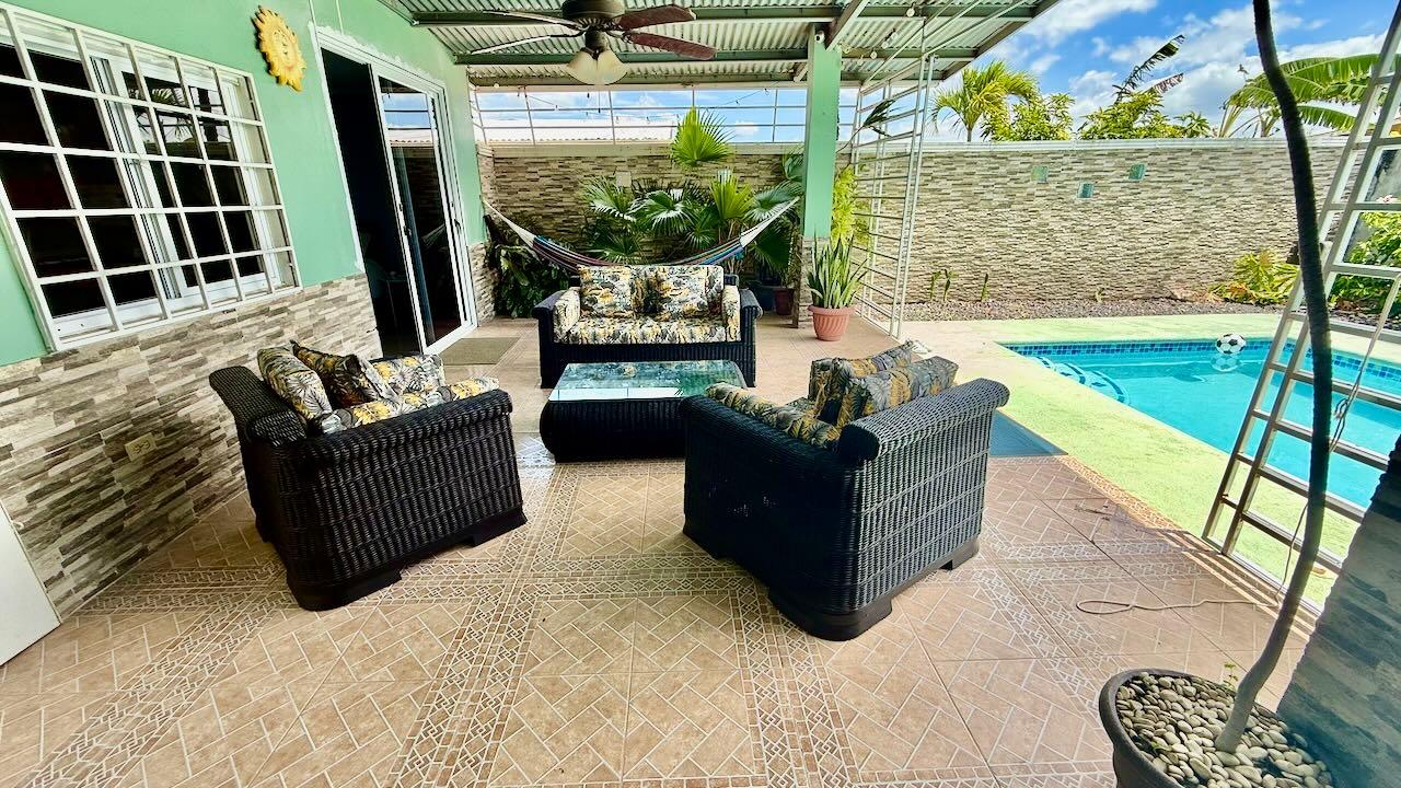 Discover the ideal family retreat nestled within a small, serene, gated community offering low maintenance fees. This charming 3-bedroom residence features a spacious living-dining room, perfect for entertaining or enjoying quality time with the family. Natural light floods the elegantly designed living and dining areas, creating a warm and inviting atmosphere. Step out onto the charming covered terrace, where you can take in the stunning views of the surrounding landscape. Enjoy the refreshing pool or relax in the quaint bohio, ideal for laid-back weekends or summer barbecues. The current owners are eager to sell and are open to considering offers from serious buyers. The home is being sold unfurnished, but comes equipped with all essential white goods. If desired, furnishings can also be negotiated. With only two neighboring properties, you can enjoy the peace and privacy that this tranquil setting offers. Don't miss out on the opportunity to make this dream home yours. Contact us today to arrange a viewing and make this retreat yours.